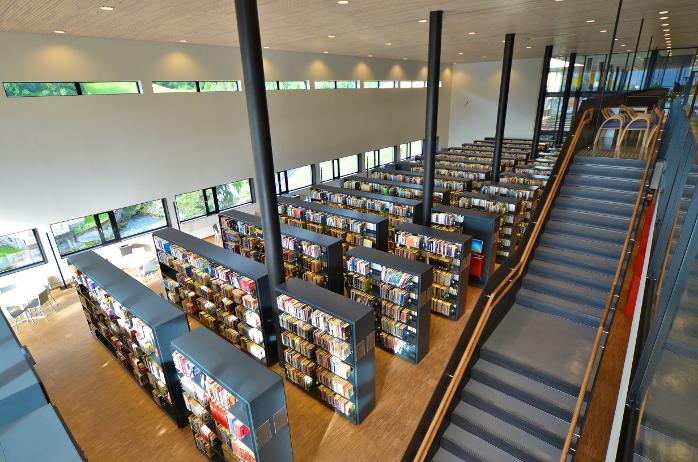 The building is 7600 square feet and houses among other things a large library with a wonderful view of the landscape. Already at the beginning of school, the students and the employed putted the building into use. One of the places where the students spends a lot of time is in the new library where the majority of the furniture is comprised of customized steel shelving systems framed with thick MDF end panels.