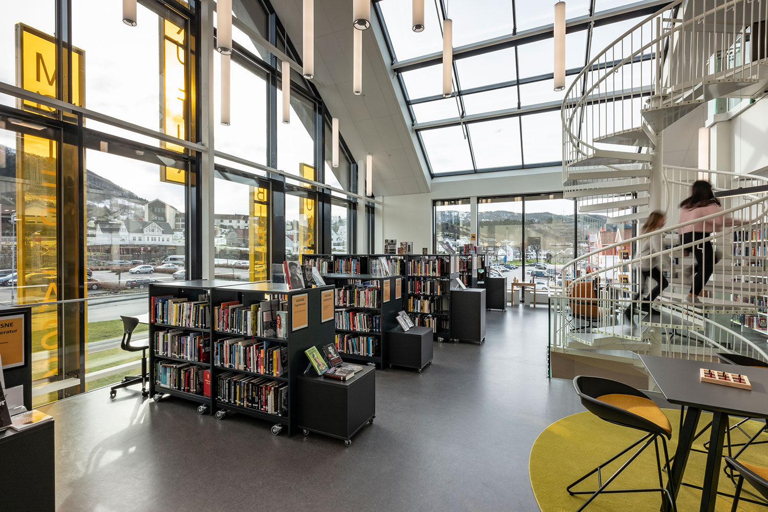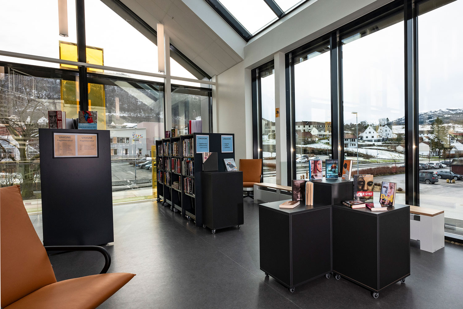 You easily get a cathedral feeling from the light in the large windows in the high, open space. The number of visitors in the library has tripled and lending rates have also increased significantly. The increased number of visitors is partly due to the central location in the local culture house, where the library is located in the middle of Vindafjord's social and cultural hub with the well-sounding name Sjøperlo (Sea pearl).