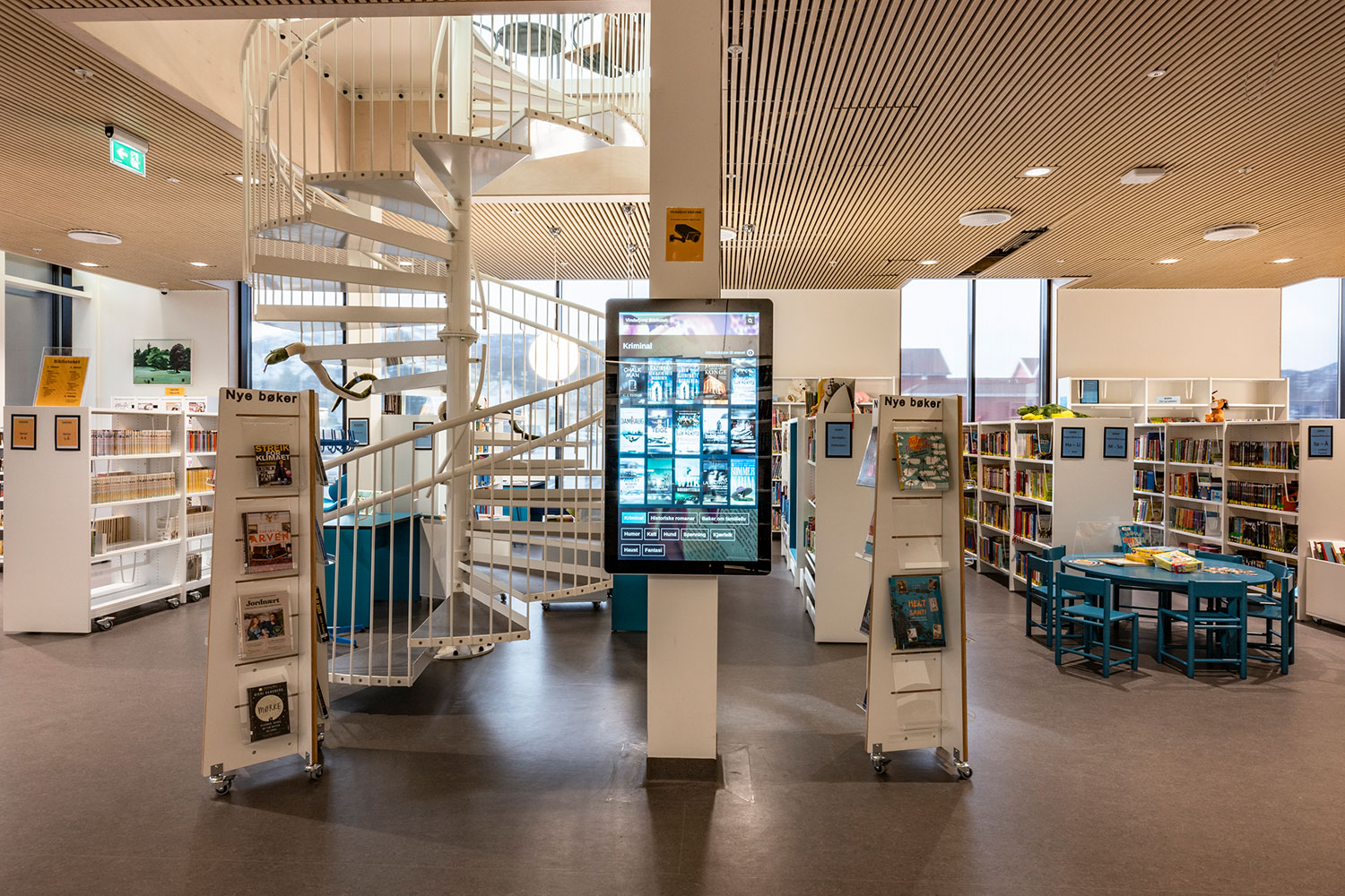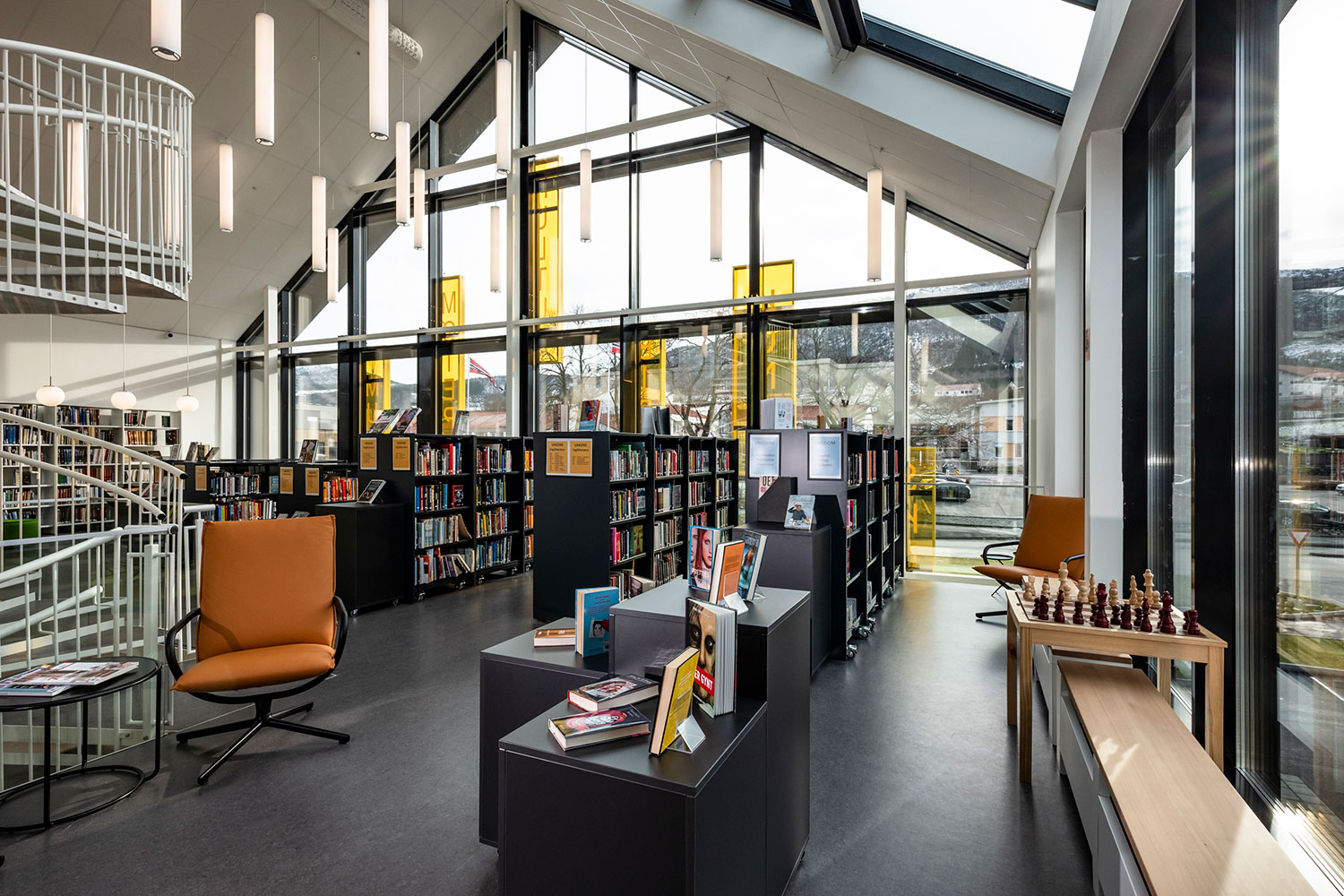Adjacent to the existing culture house in Ølen, the library has been moved into a new and modern extension. The new culture and learning center is spread over three floors, connected by an elegant spiral staircase.
