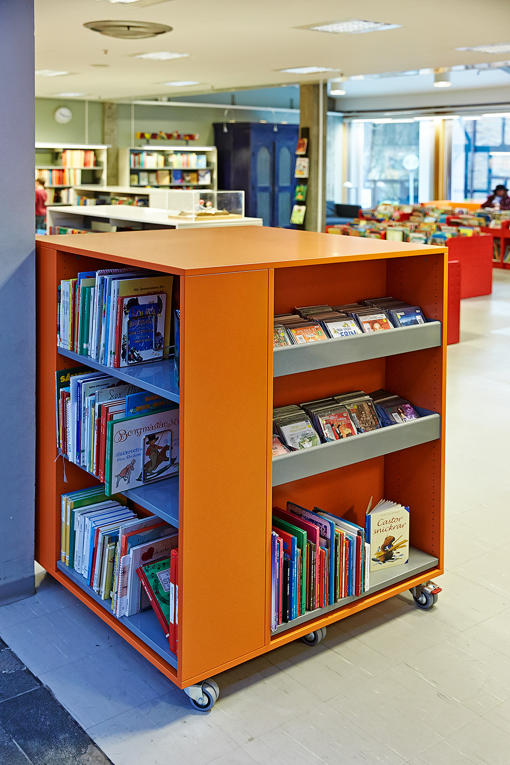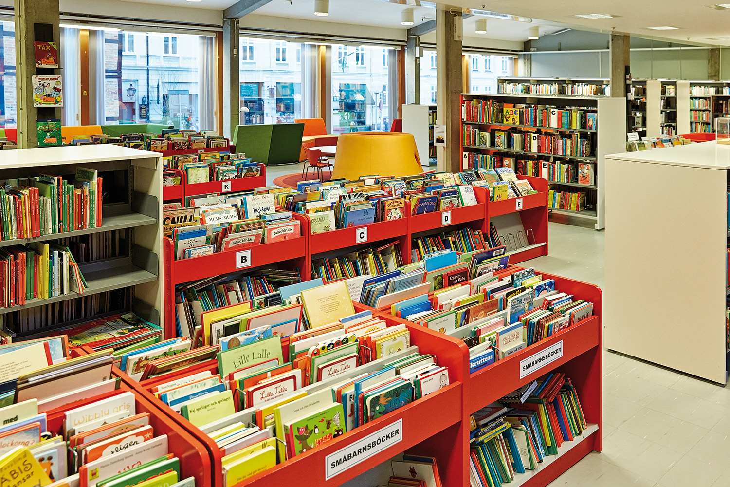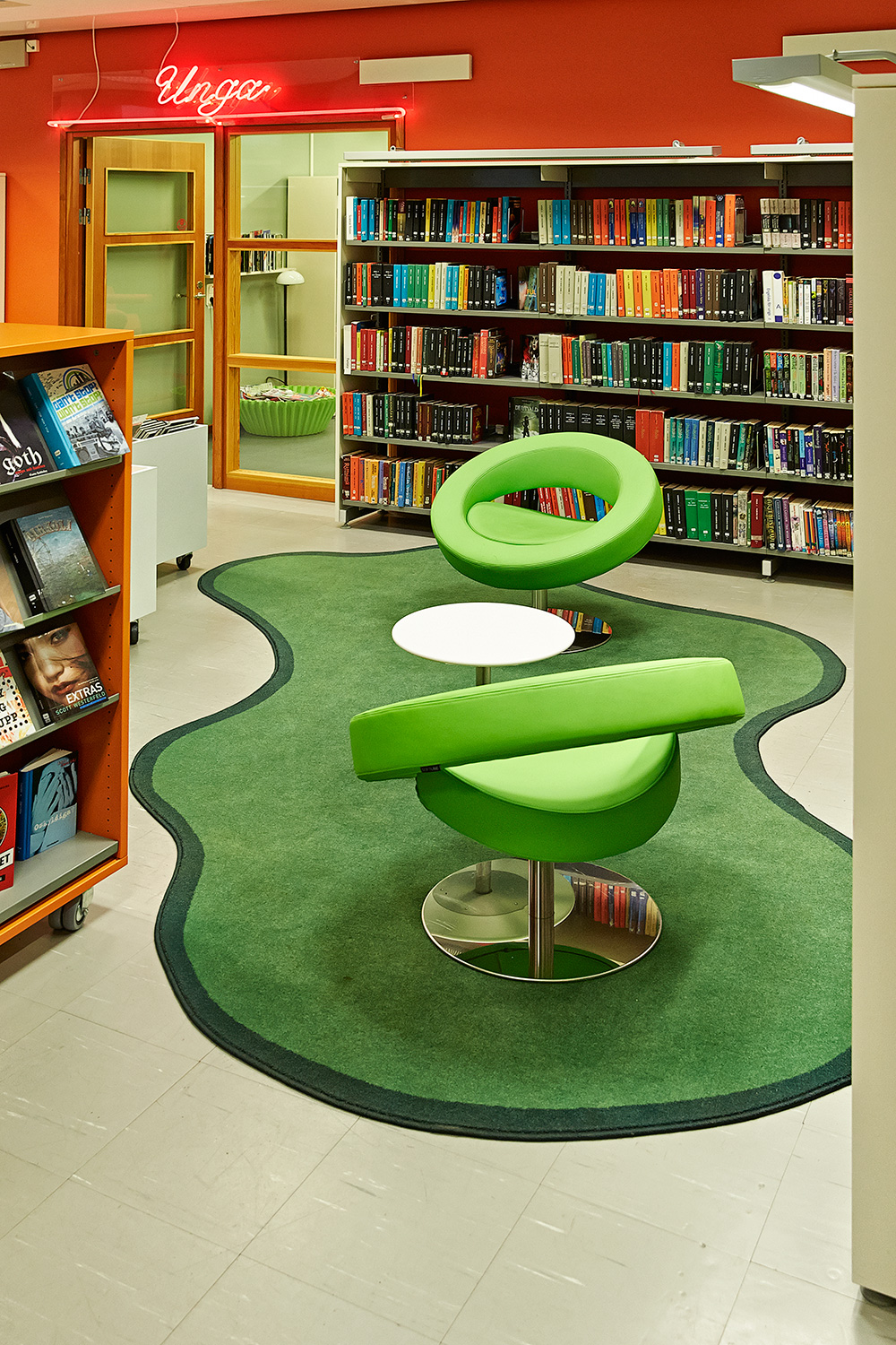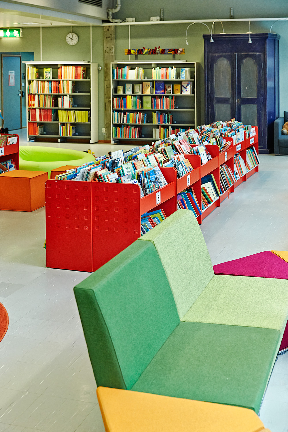 The main library in Lund has been in the same building since the 1970s. Over the years it has been gradually renovated and modernized. Finally it was the children’s department’s turn and our own interior designer carried out the colourful refurbishment. The area is divided into two sections: one for the younger children and one for adolescents. These different areas have been created by use of colour, carpets and colourful walls between the shelving.