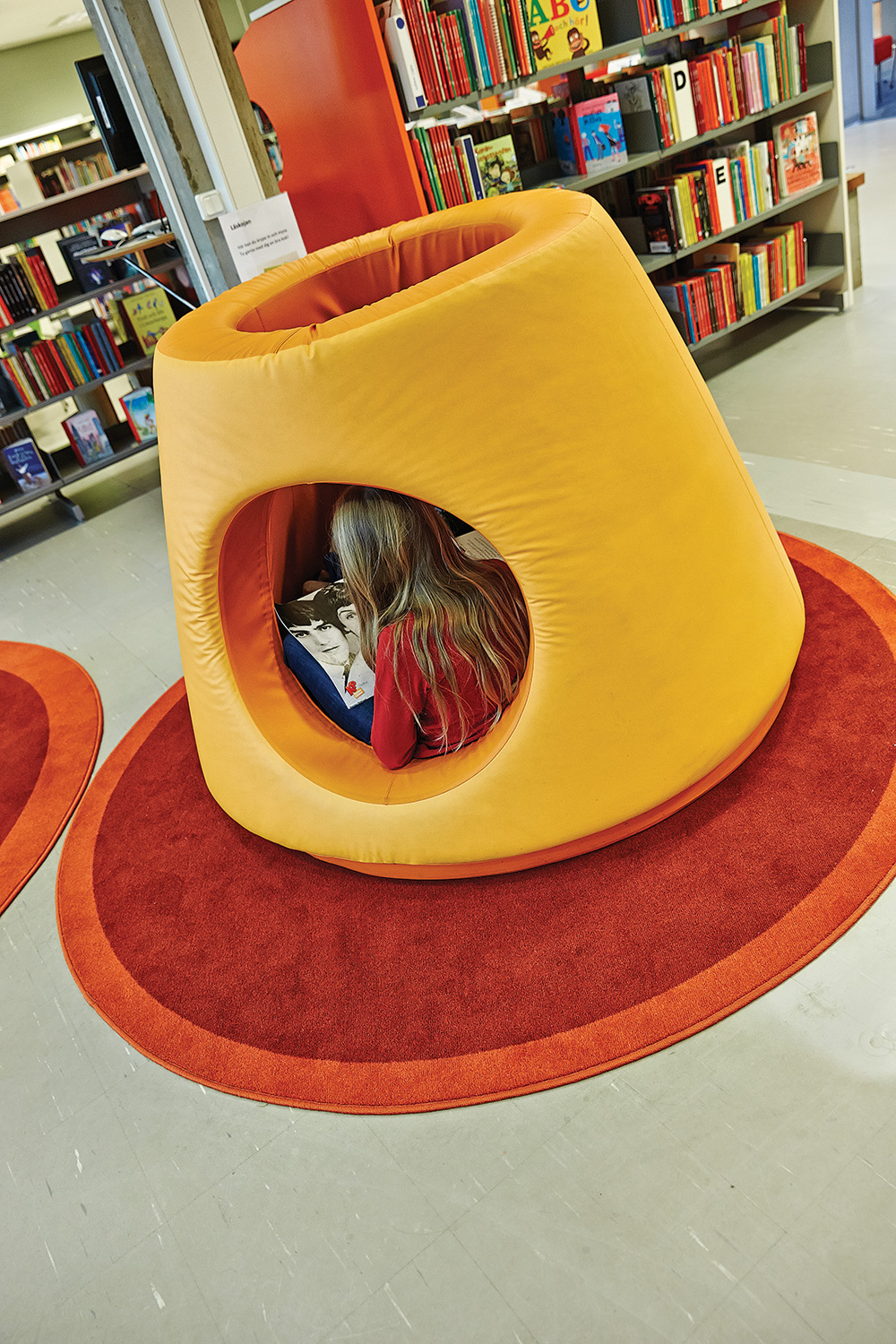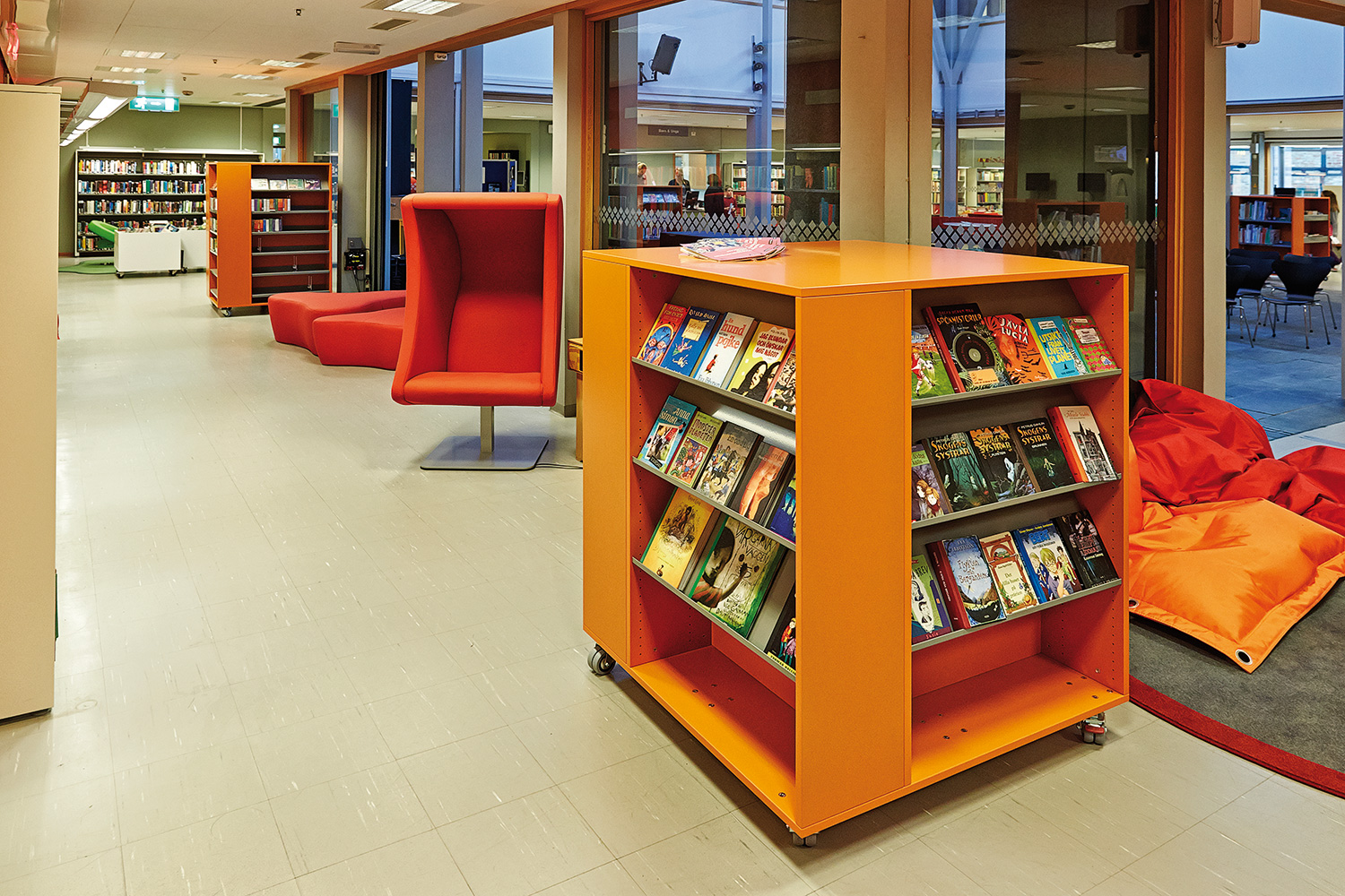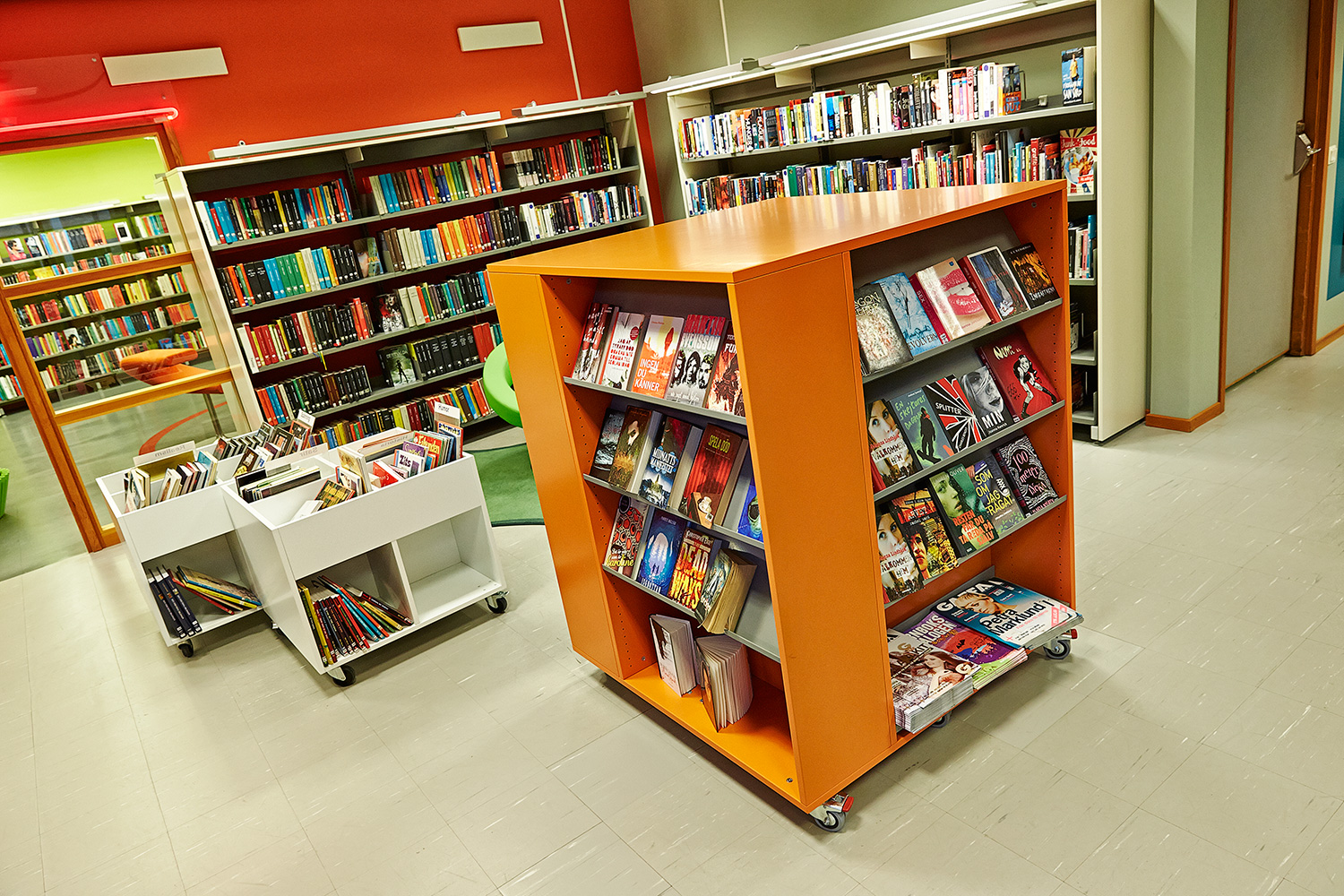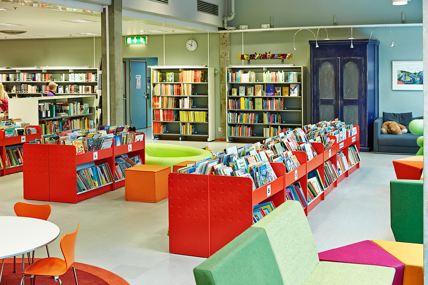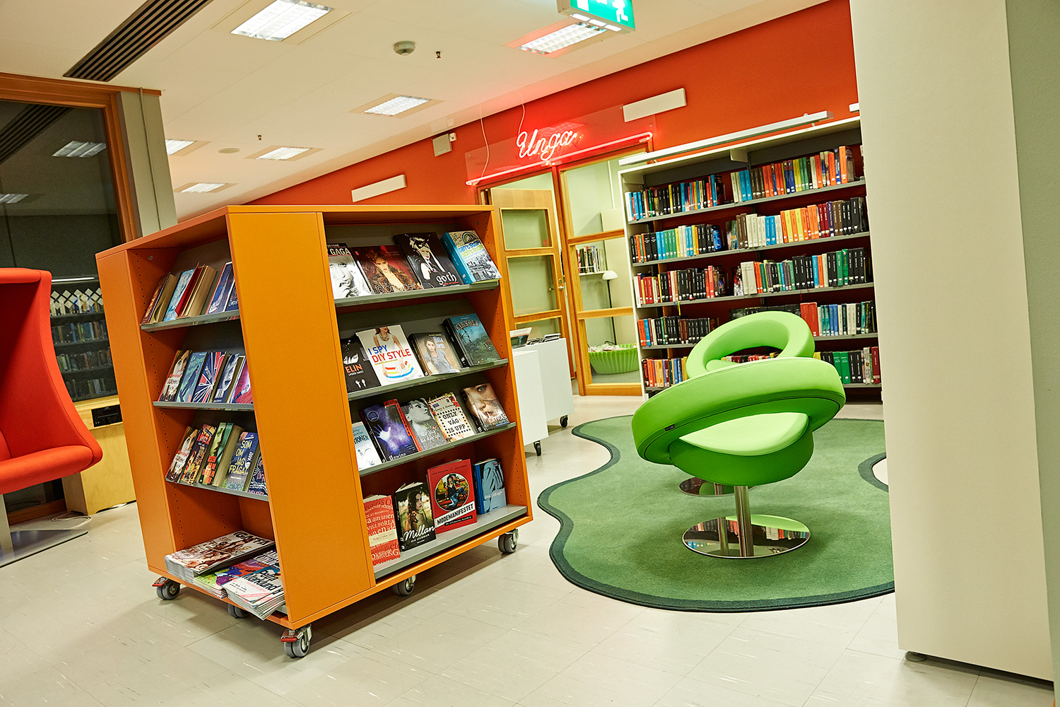 The main library in Lund has been in the same building since the 1970s. Over the years it has been gradually renovated and modernized. Finally it was the children’s department’s turn and our own interior designer carried out the colourful refurbishment. The area is divided into two sections: one for the younger children and one for adolescents. These different areas have been created by use of colour, carpets and colourful walls between the shelving.
