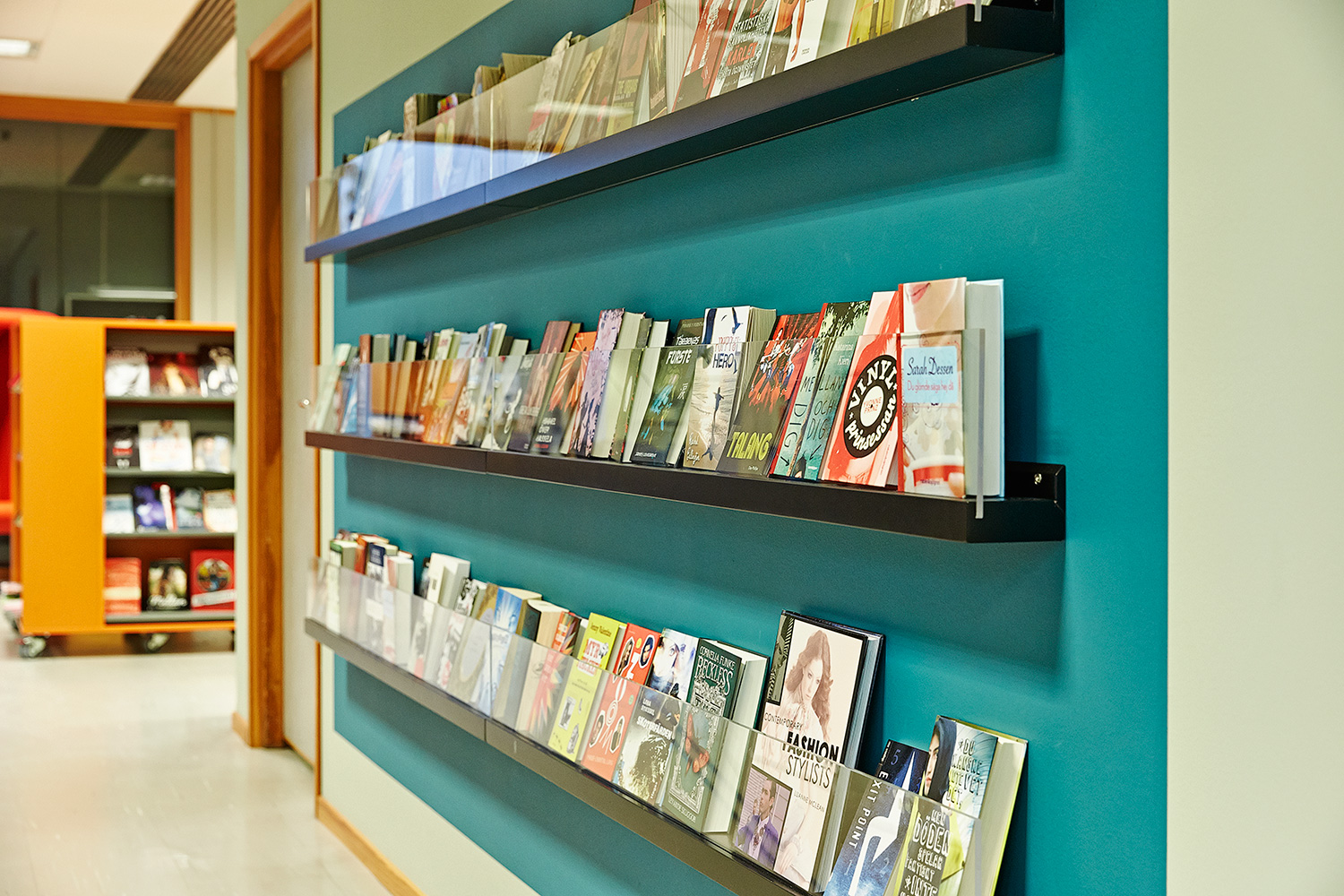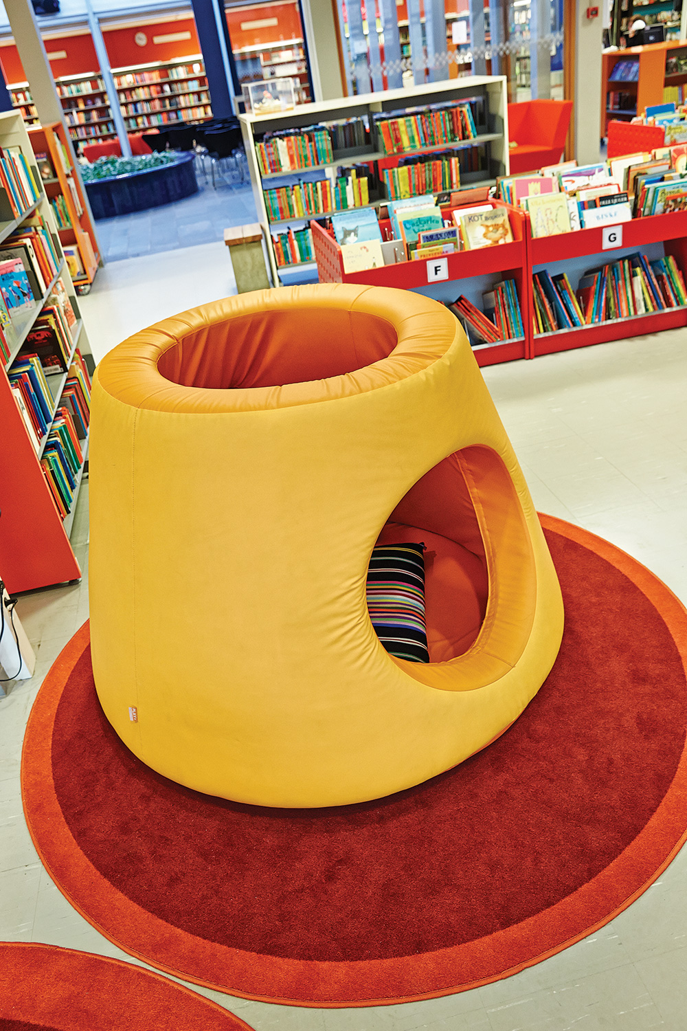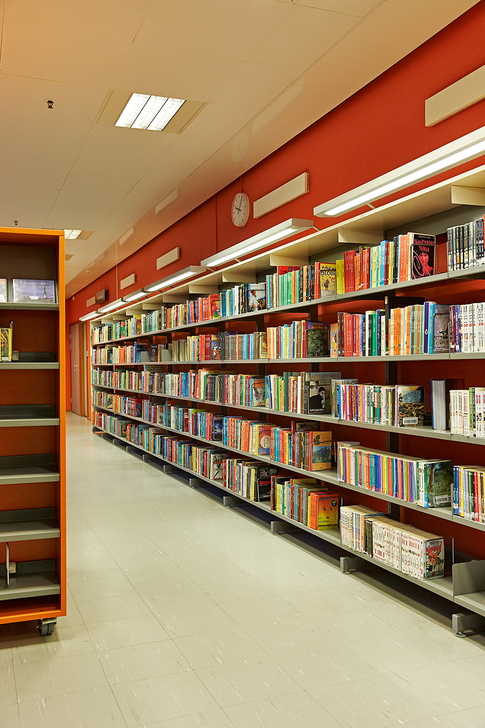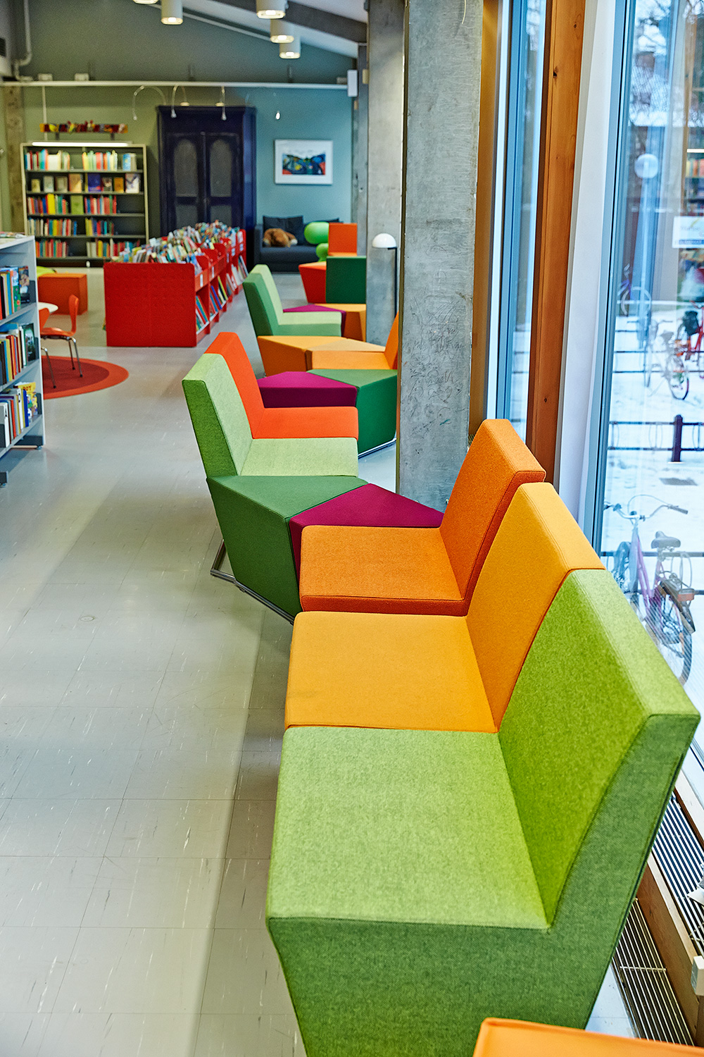 The main library in Lund has been in the same building since the 1970s. Over the years it has been gradually renovated and modernized. Finally it was the children’s department’s turn and our own interior designer carried out the colourful refurbishment. The area is divided into two sections: one for the younger children and one for adolescents. These different areas have been created by use of colour, carpets and colourful walls between the shelving.