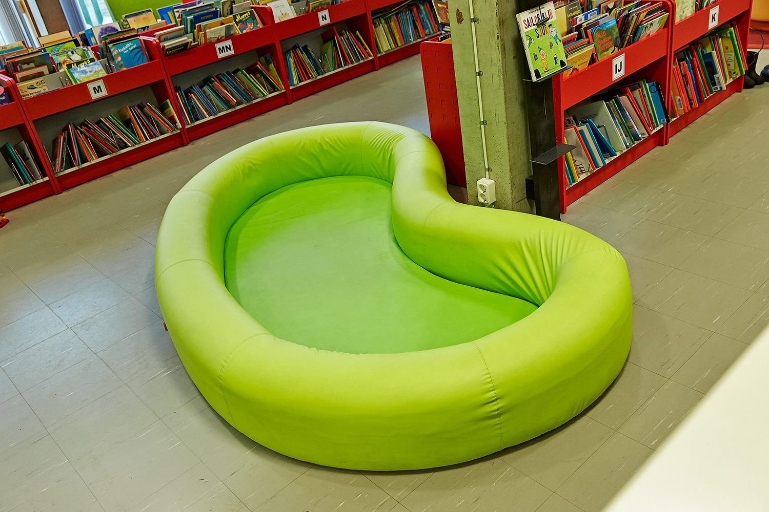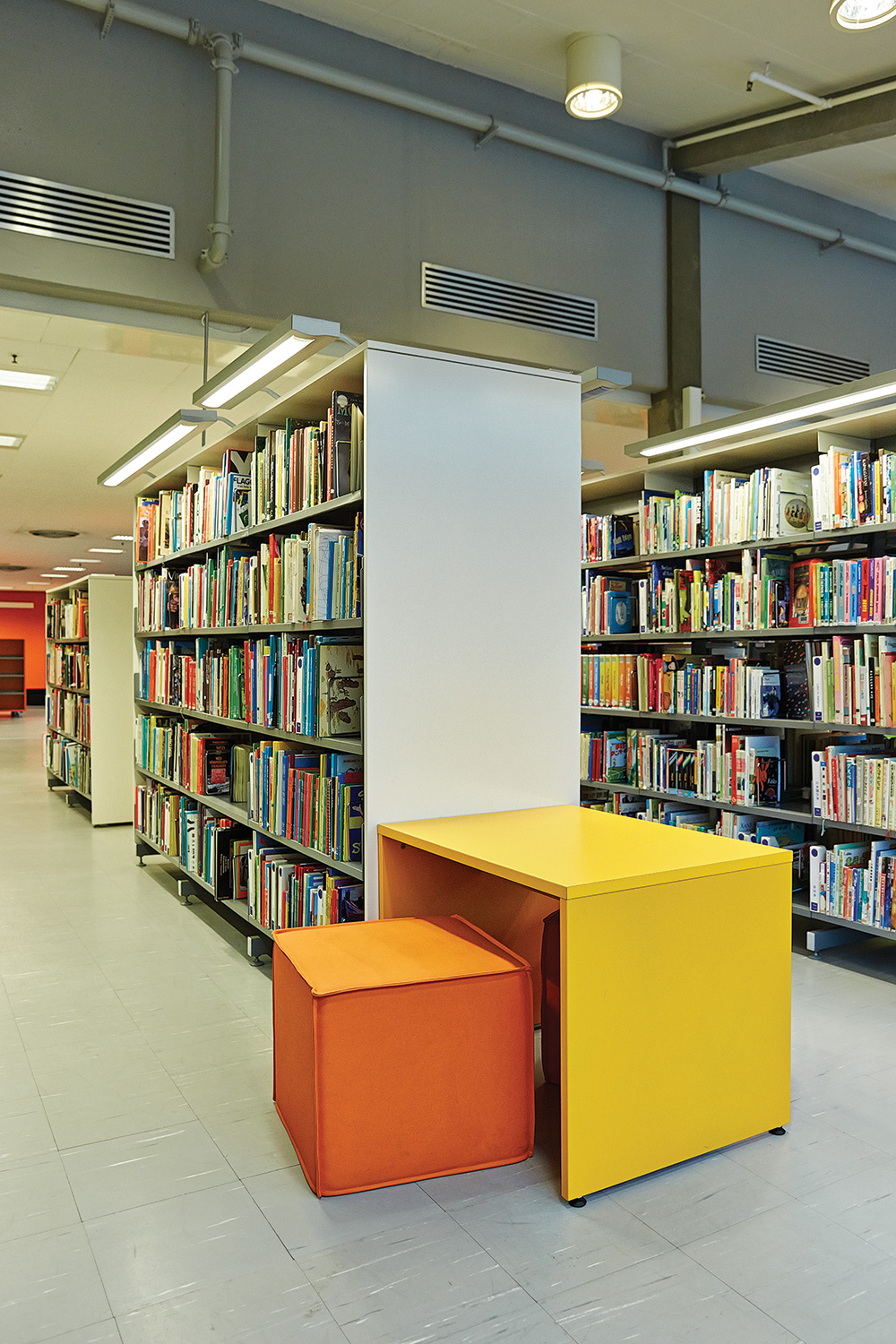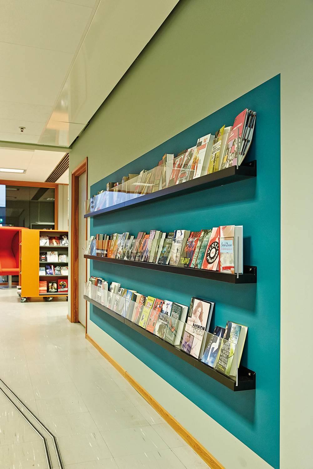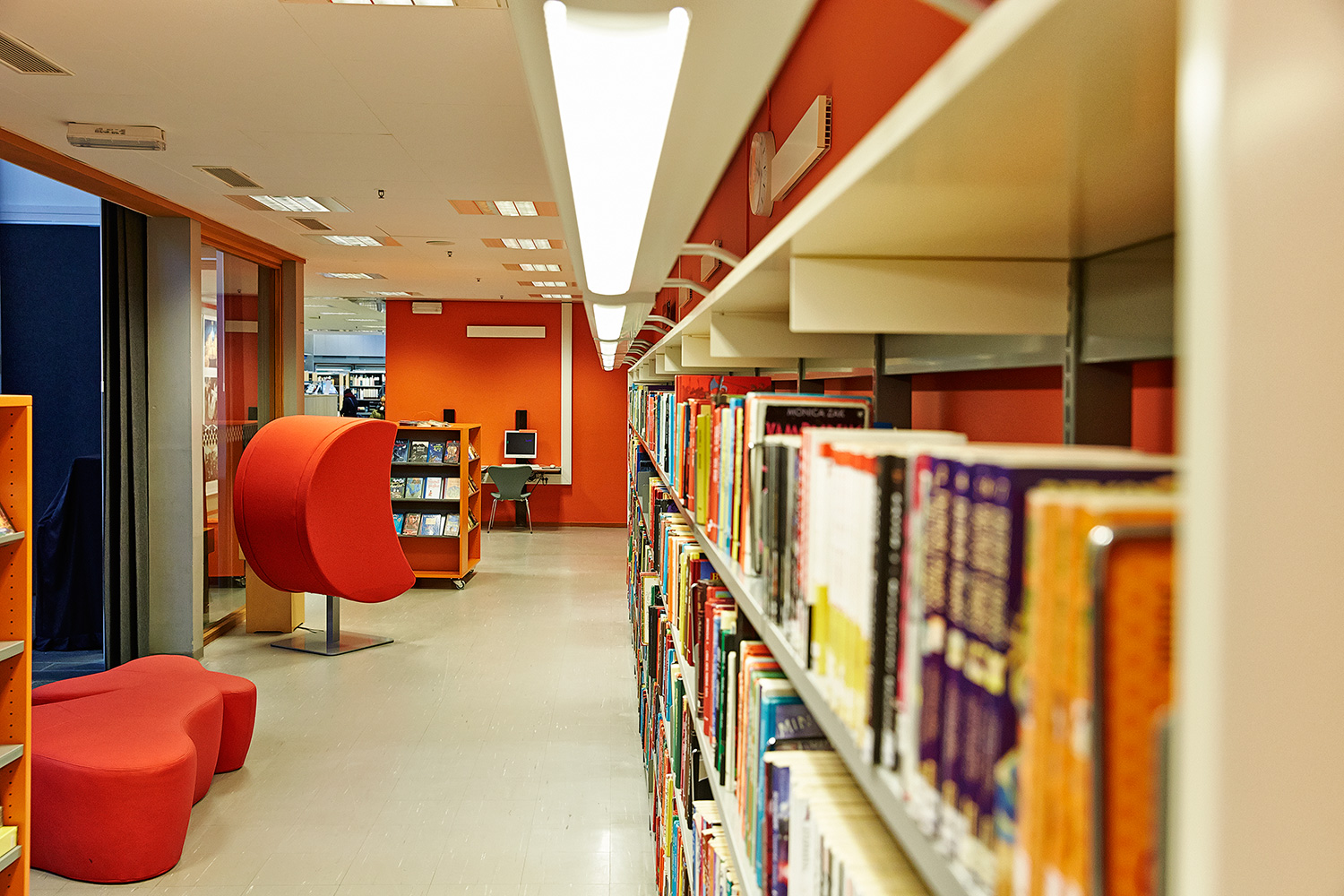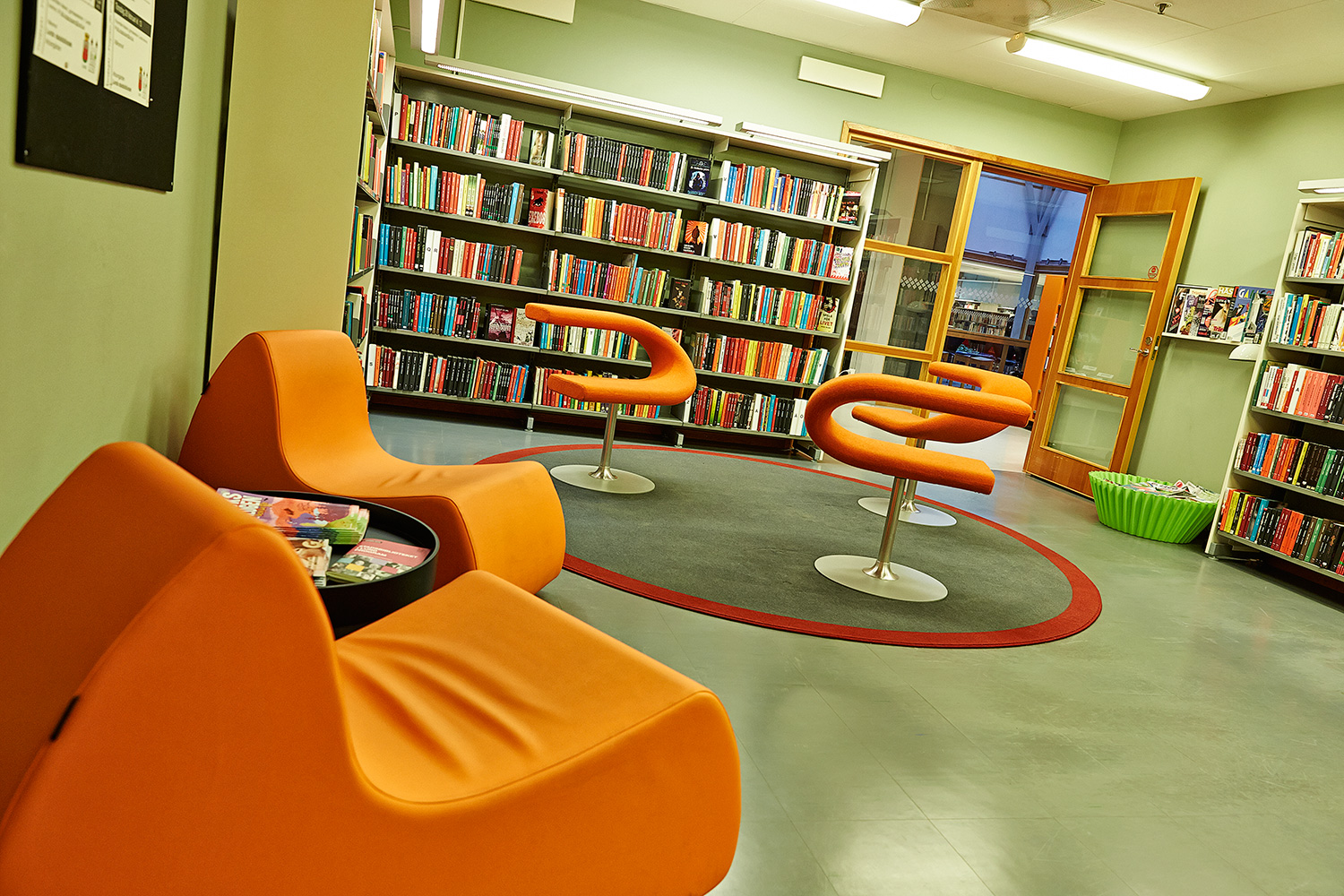 The main library in Lund has been in the same building since the 1970s. Over the years it has been gradually renovated and modernized. Finally it was the children’s department’s turn and our own interior designer carried out the colourful refurbishment. The area is divided into two sections: one for the younger children and one for adolescents. These different areas have been created by use of colour, carpets and colourful walls between the shelving.