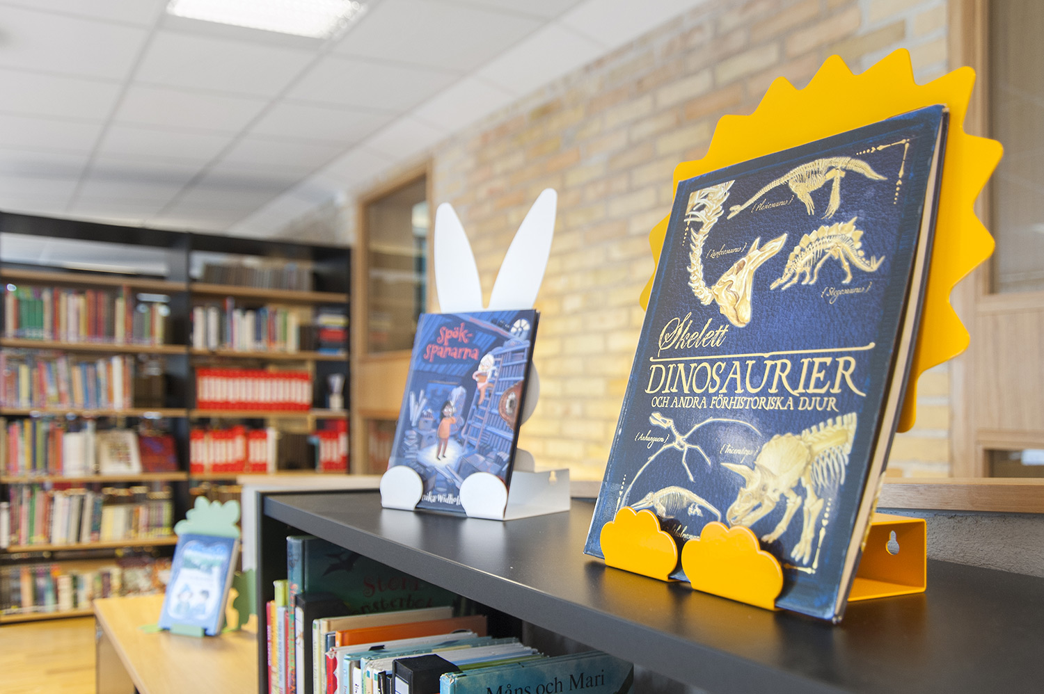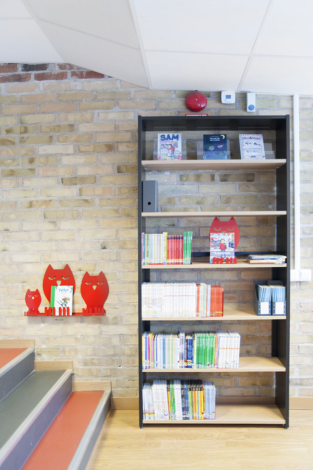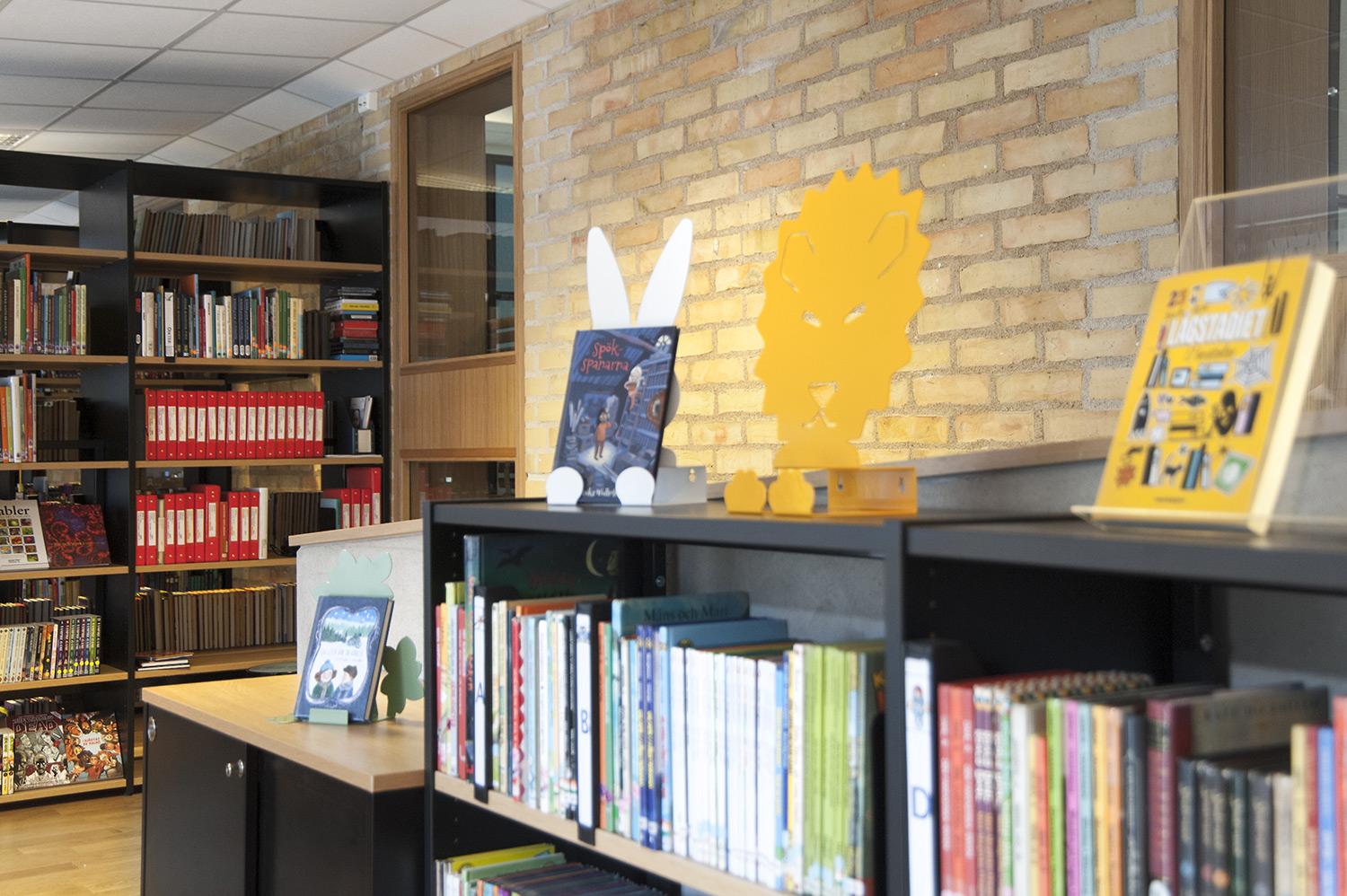 The library especially focuses on displaying and making books and other material easy accessible by using symbol labels to mark book spines. Display stands in an attention-grabbing format such as Owl, Rabbit, Wolf and Lion are used as focal points for books and other media in an inspiring and enjoyable way. Next to the “easy to read” shelving system the owl family sits on the wall showing exciting book titles!