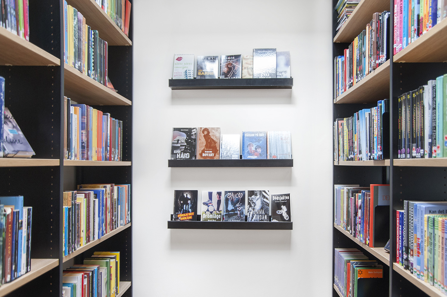 Front displays are widely used and black display lists in different lengths complement the interior perfectly by being placed both on wall and end panels on the shelving systems.