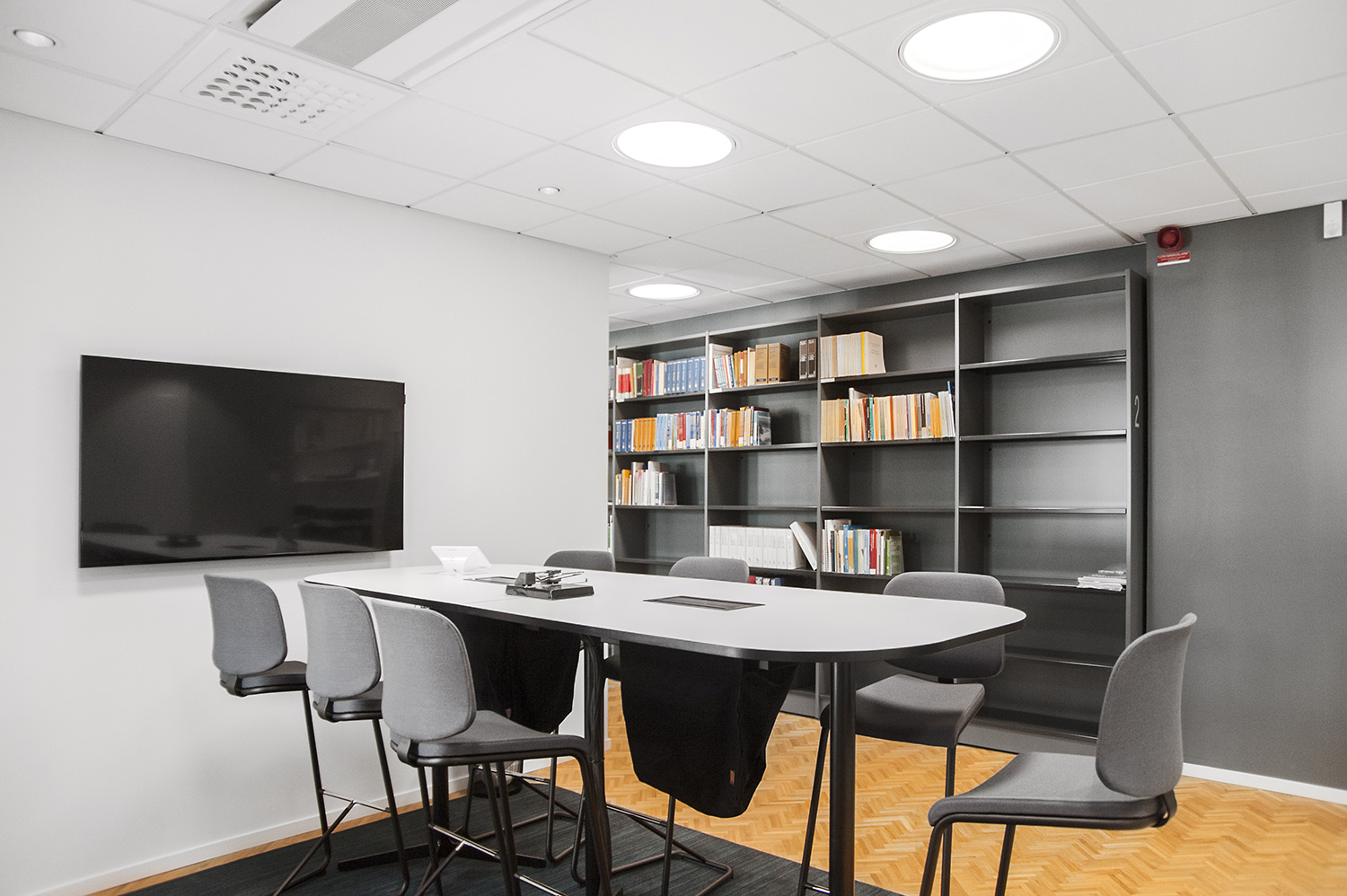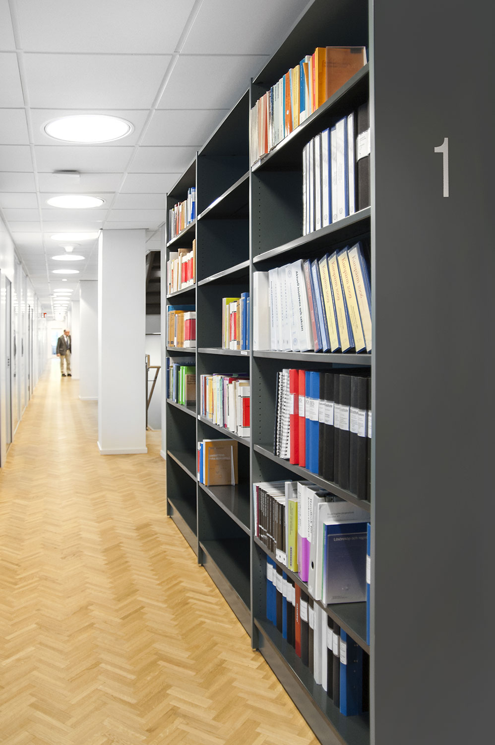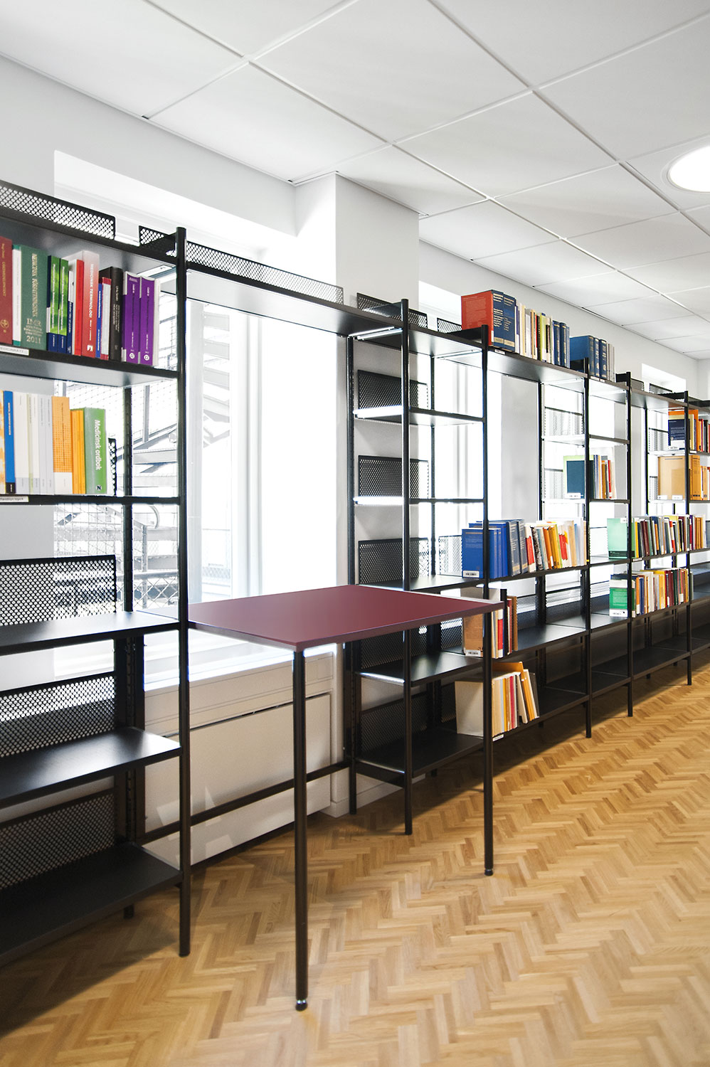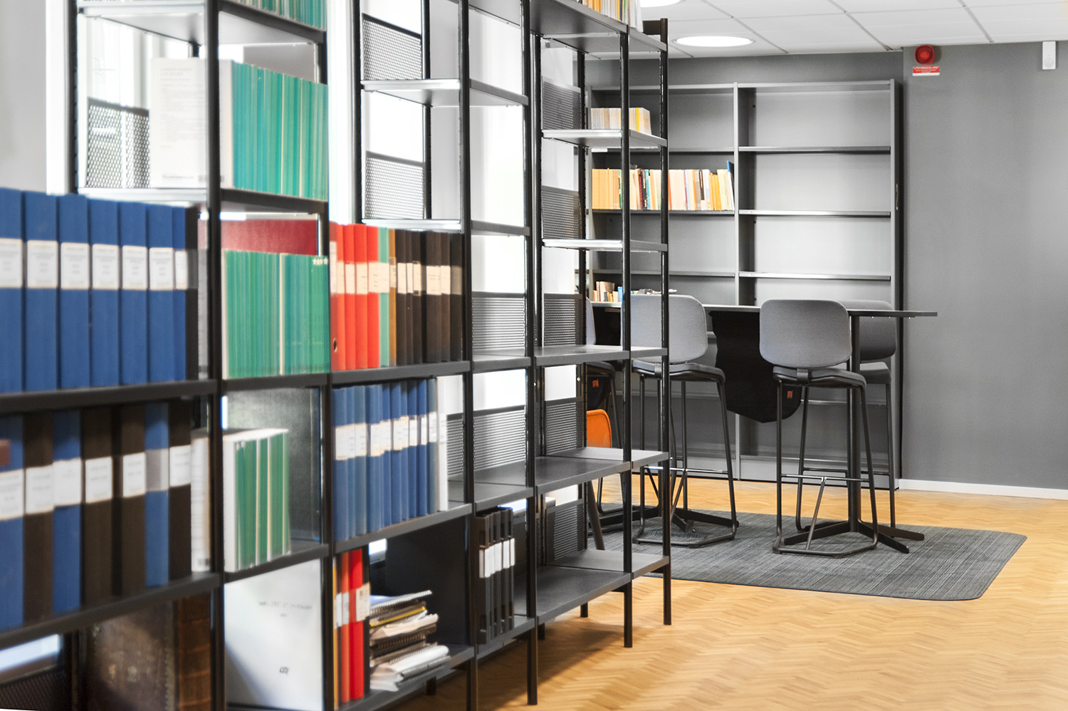 The library section is intended to serve the lawyers and for this purpose Frontline has been chosen for freestanding shelving and wall shelving. Rondea shelving in graphite is placed in front of the window sections in order to allow the maximum amount of light to enter the room while storage is also possible.