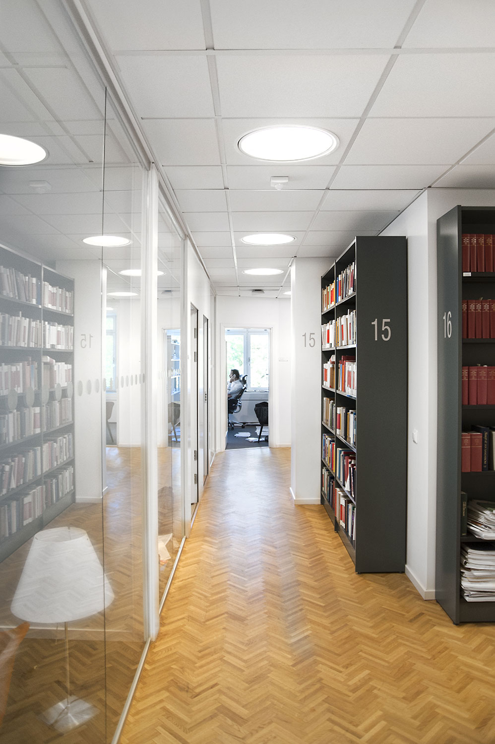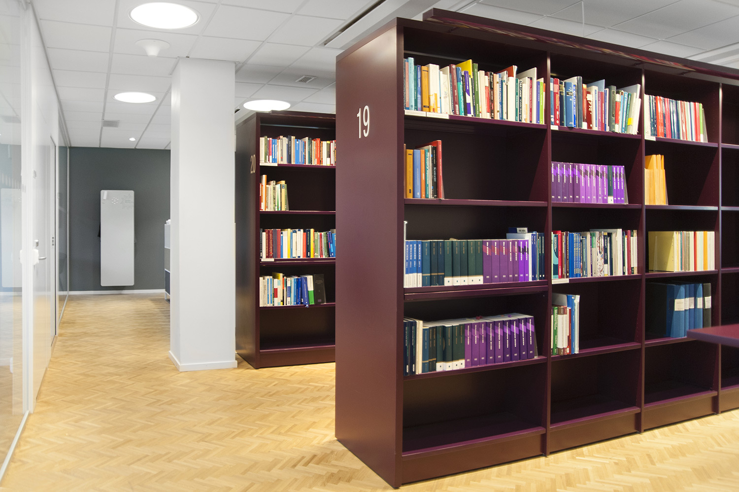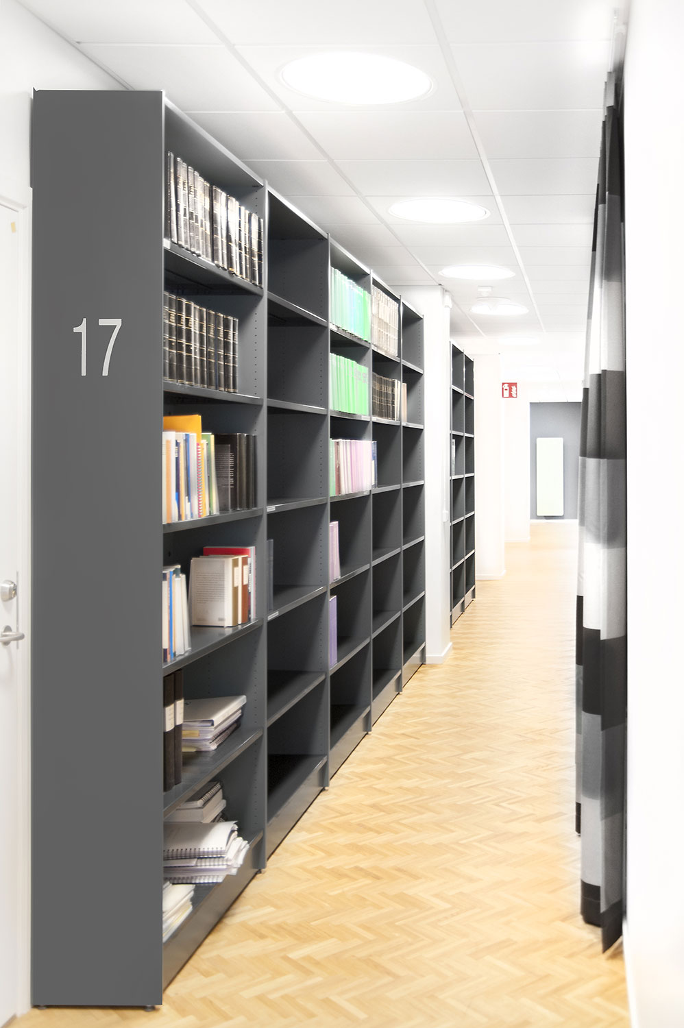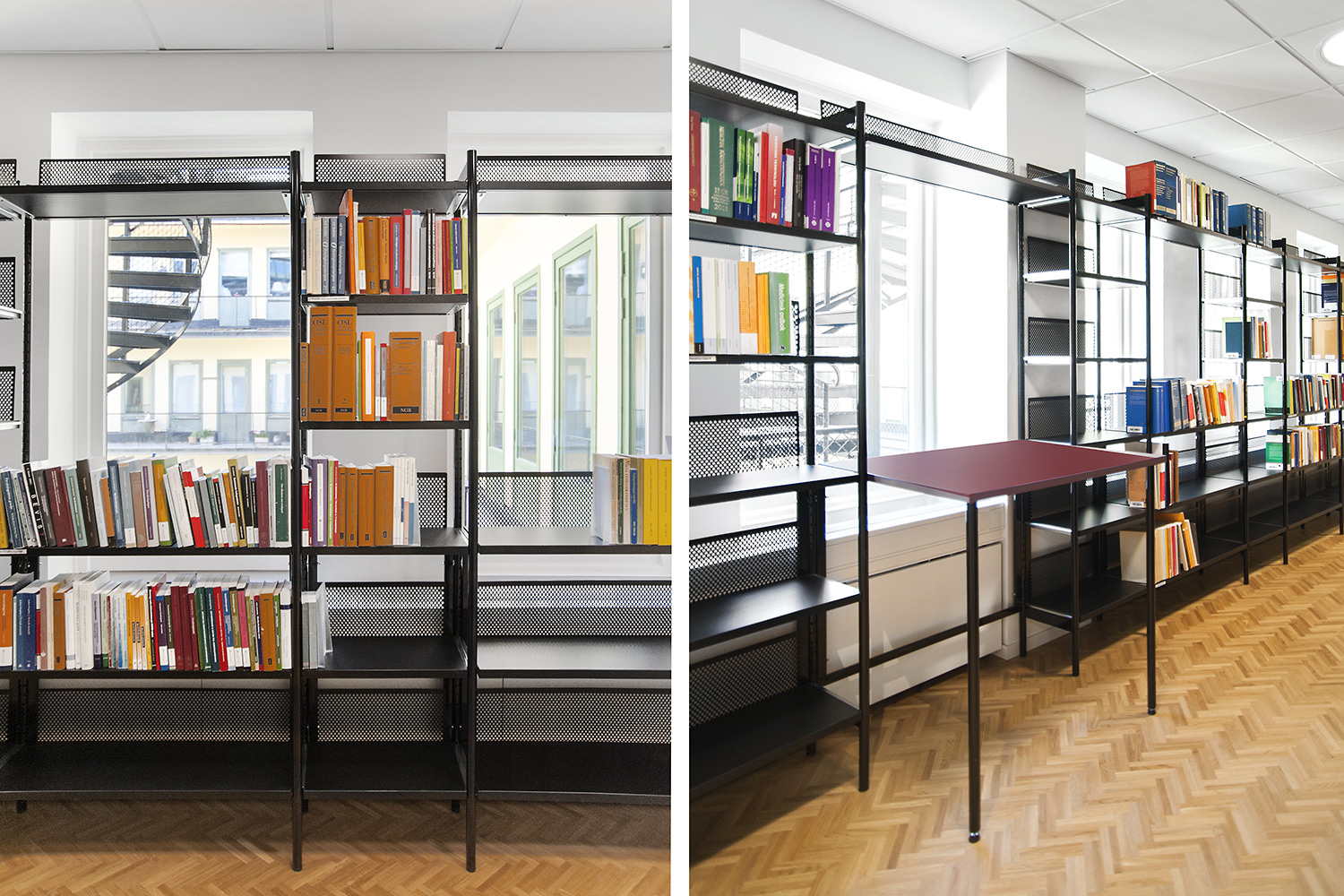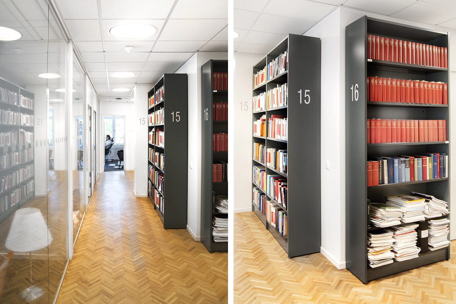 The library section is intended to serve the lawyers and for this purpose Frontline has been chosen for freestanding shelving and wall shelving. Rondea shelving in graphite is placed in front of the window sections in order to allow the maximum amount of light to enter the room while storage is also possible.