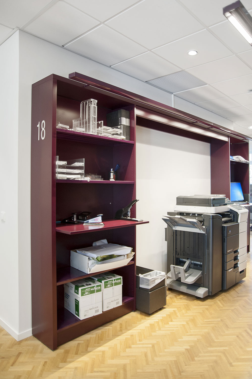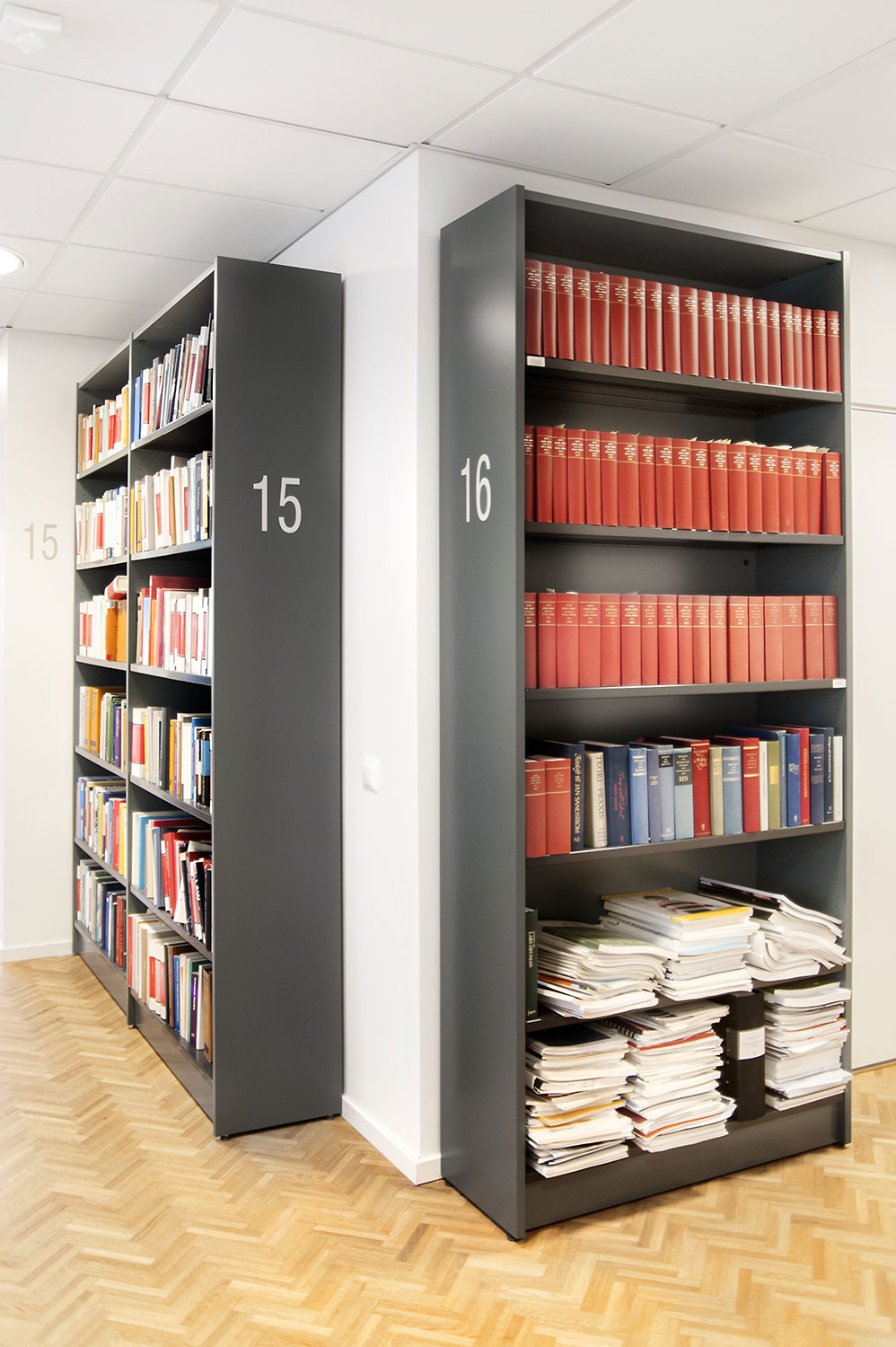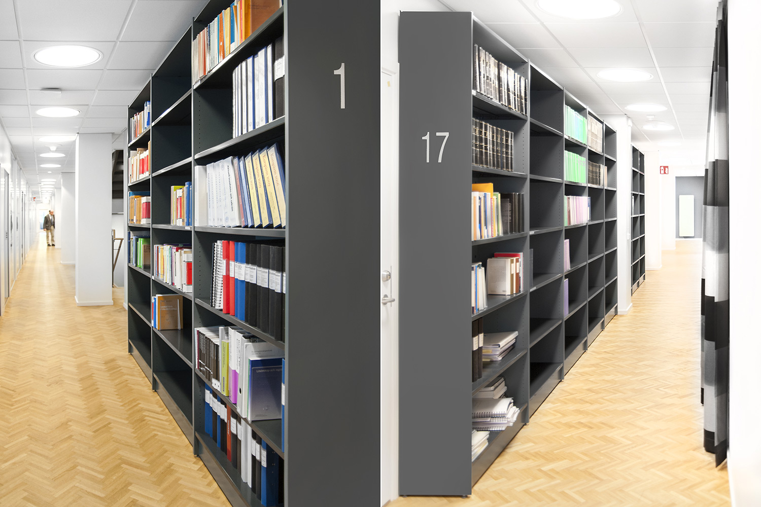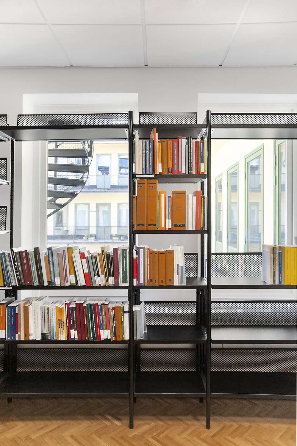 The library section is intended to serve the lawyers and for this purpose Frontline has been chosen for freestanding shelving and wall shelving. Rondea shelving in graphite is placed in front of the window sections in order to allow the maximum amount of light to enter the room while storage is also possible.