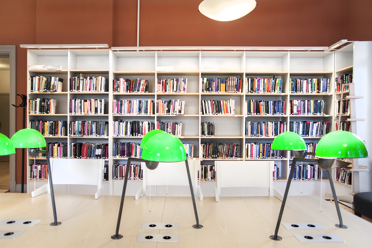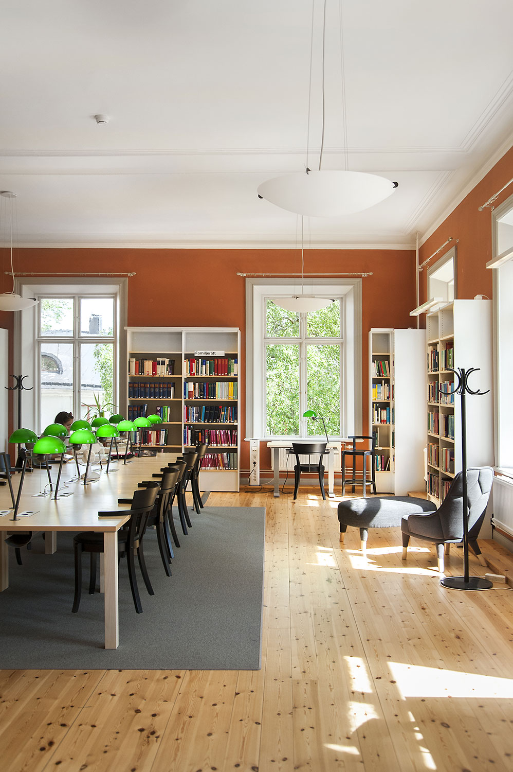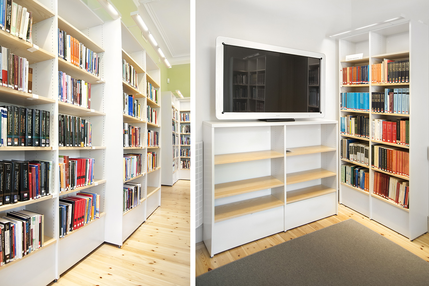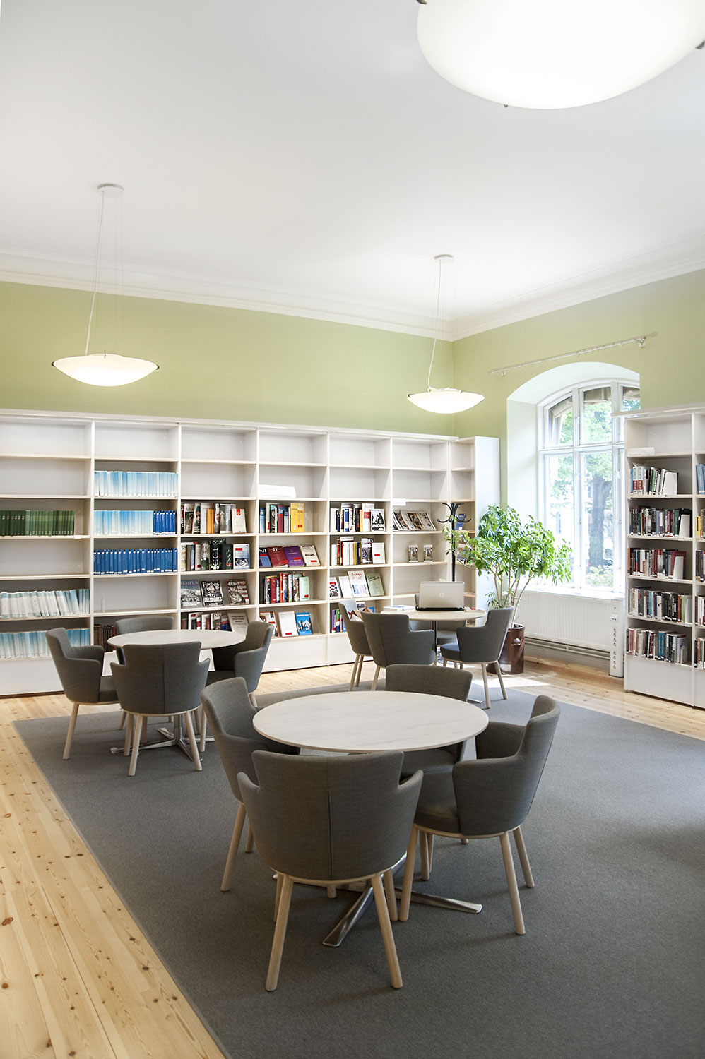 A listed building results in some challenges with the interior of a library where the shelving needs to be adapted for the characteristics of each room with regards to plumbing, sockets and wiring on the floor. The shelving system we have worked with in this project and that now decorates the library and fulfill the needs is Frontline with lacquered panels and shelves in ash.