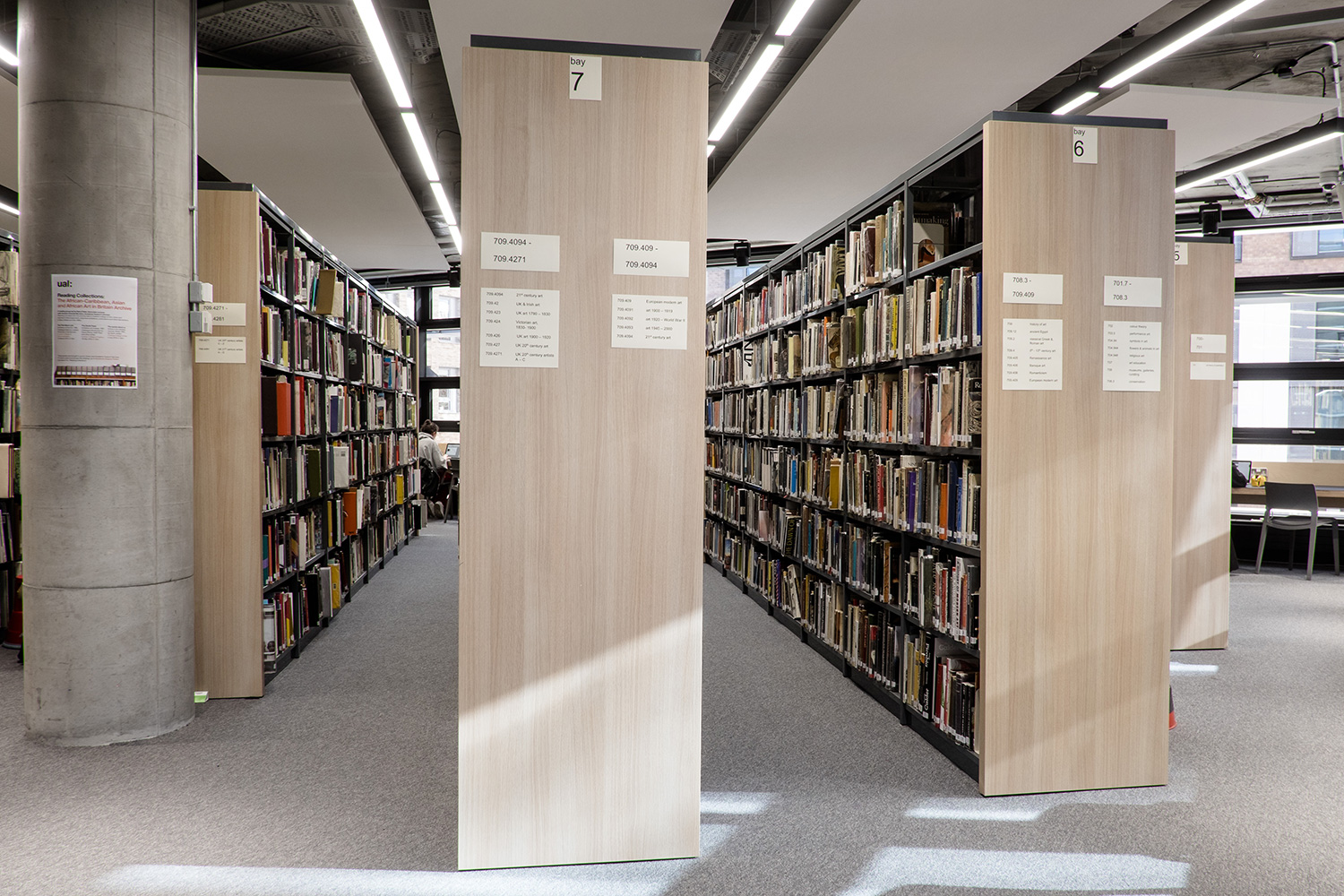 Although the general trend for accommodation of university library physical stock is down, as an arts university UAL aims not only to retain existing stock but allow for future growth. In addition to the challenge, the range of size and weight of art books, as well as the intricacies of their sequencing, needed to be taken in to consideration in the planning of this new space. Occupying a floor of the new build extension at Camberwell College of Arts, the new library would increase the existing square meterage by approximately one third, and it was felt that the suggested ‘oblique’ runs of shelving would best meet the stock and space requirement. It would also allow for easy navigation, a straightforward sequencing, and clear visibility of end of bay guiding.