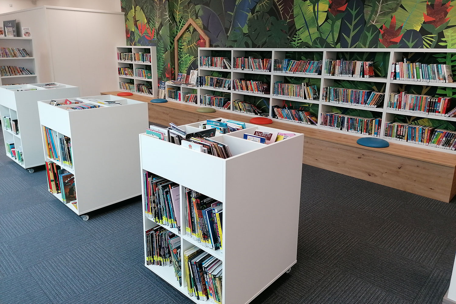 The open plan library, with a glazed panel overlooking the mall below, allowed us to use our creative flare. We installed brightly coloured wall graphics and created a house-like landscape which is striking to passers- by and busy shoppers.