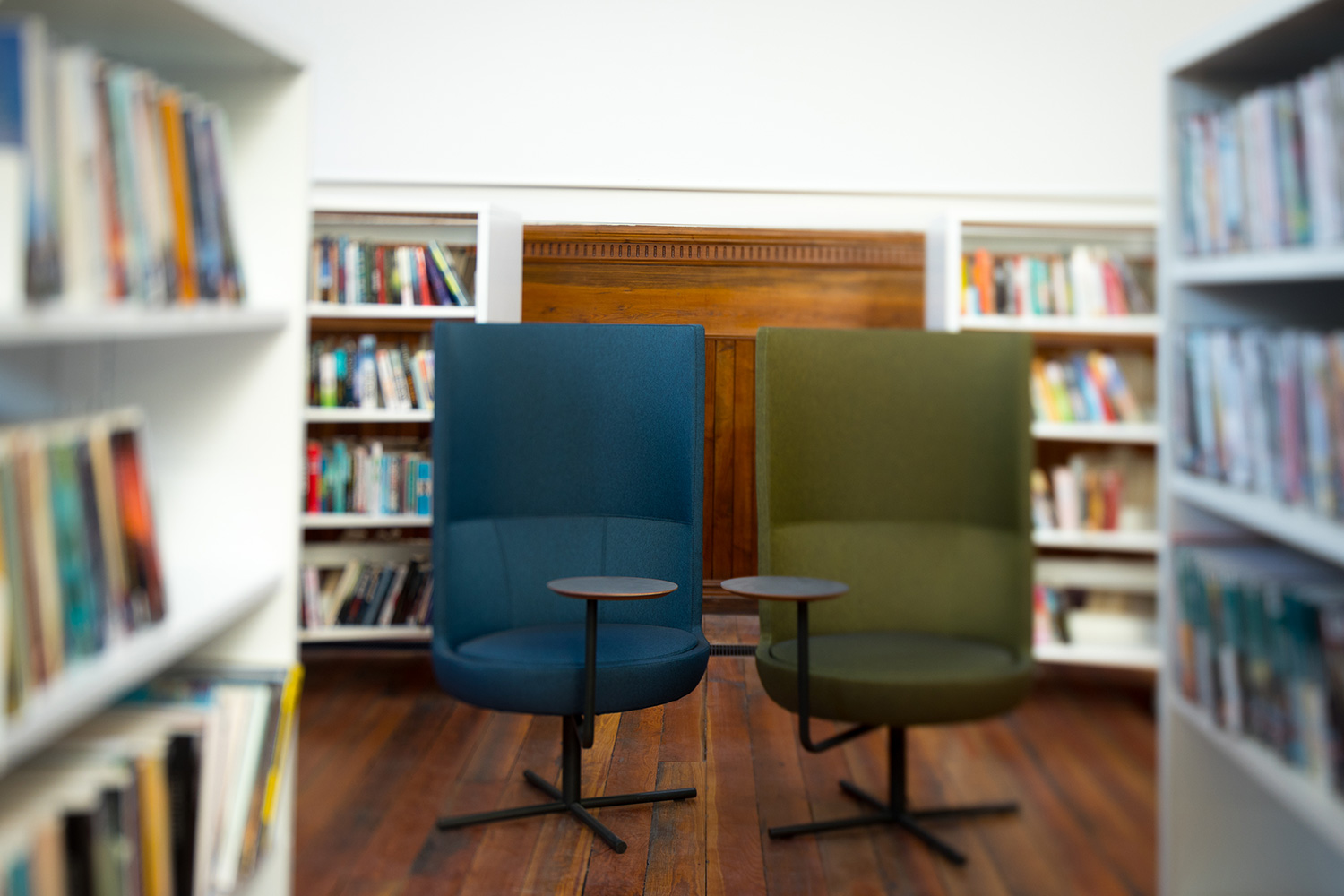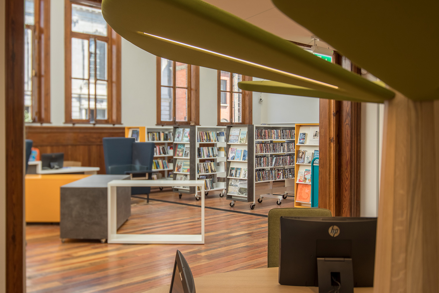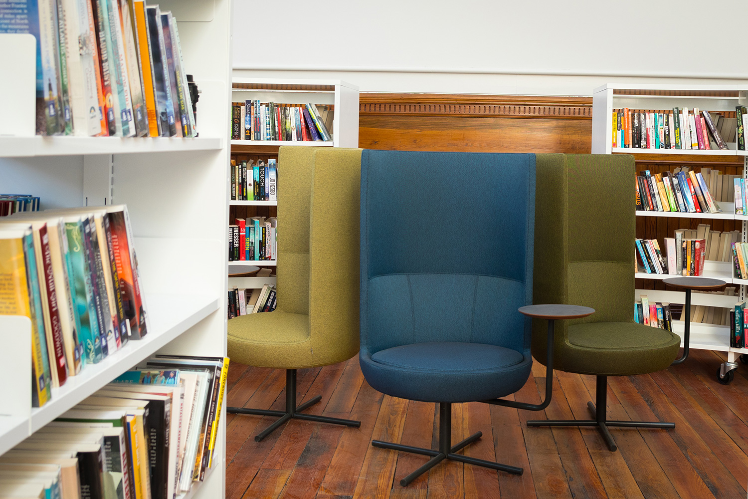 - An adult library space where modern furniture blends seamlessly with the traditional feel of the room. Shelving is flexible and can be easily moved to cater for public events. High back chairs with acoustic properties and fitted tables give users a sense of privacy and somewhere to use their own laptops/devices.