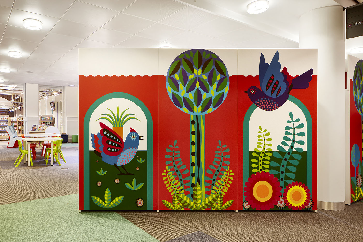 With the new children’s area now located very centrally in what was previously an open plan atrium, an additional challenge involved the clear demarcation of the new area, as well as its segregation from other library functions. To address that, acoustic panels customised with bespoke and vibrant graphics were installed in the area’s surroundings, creating the required segregation whilst contributing to the area’s visual features.