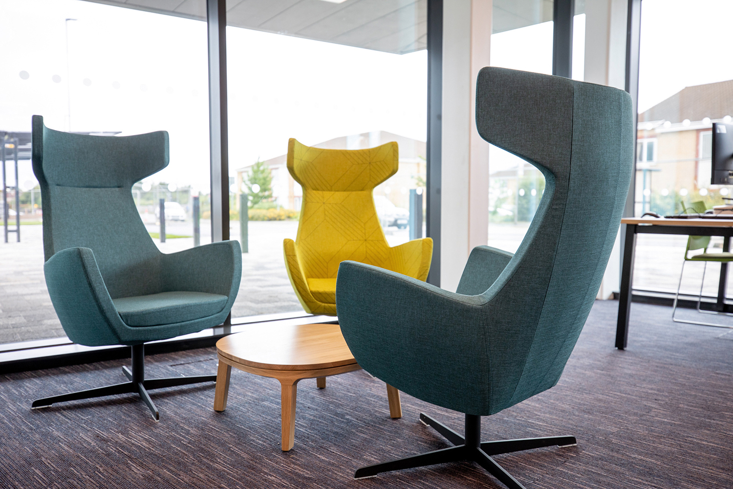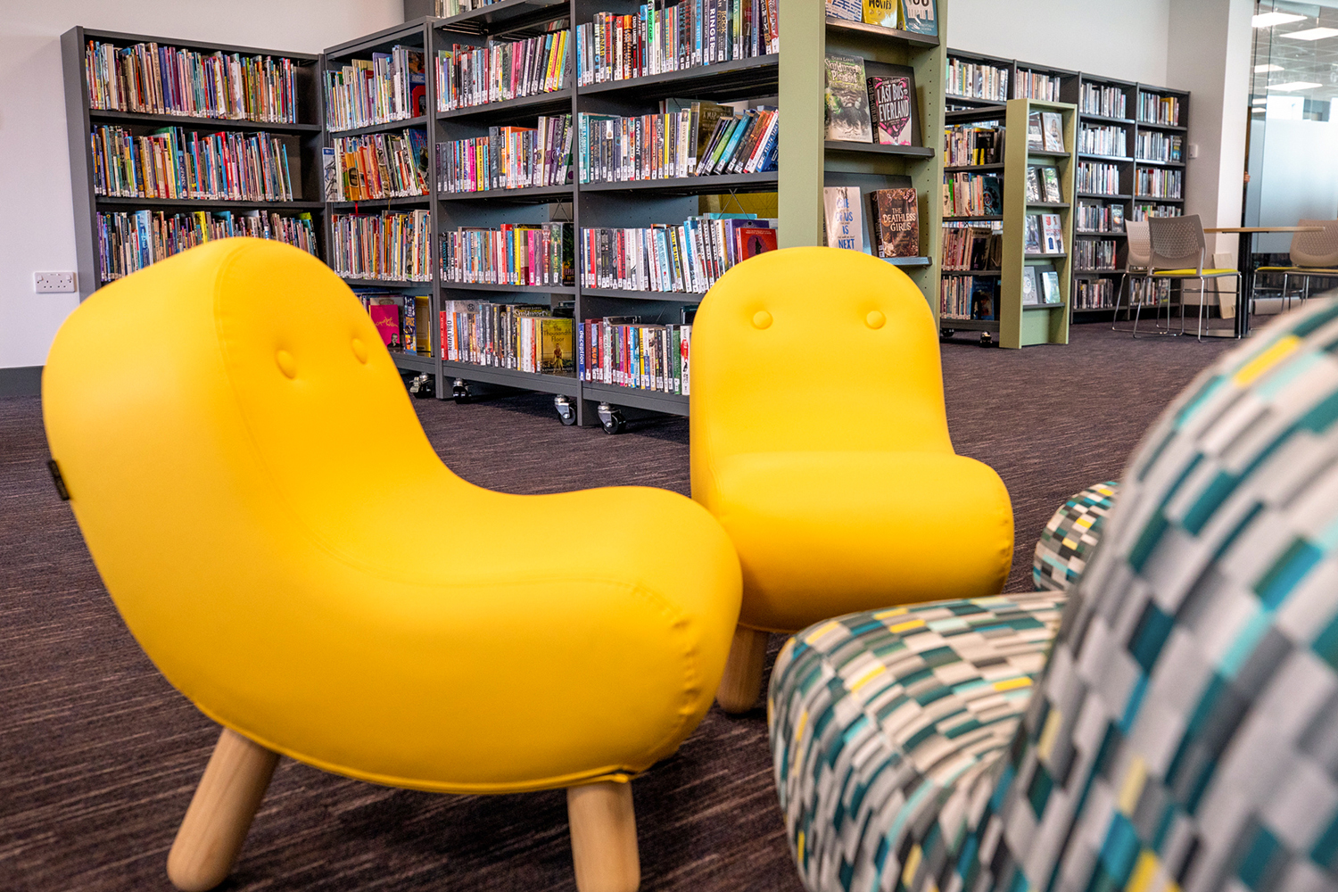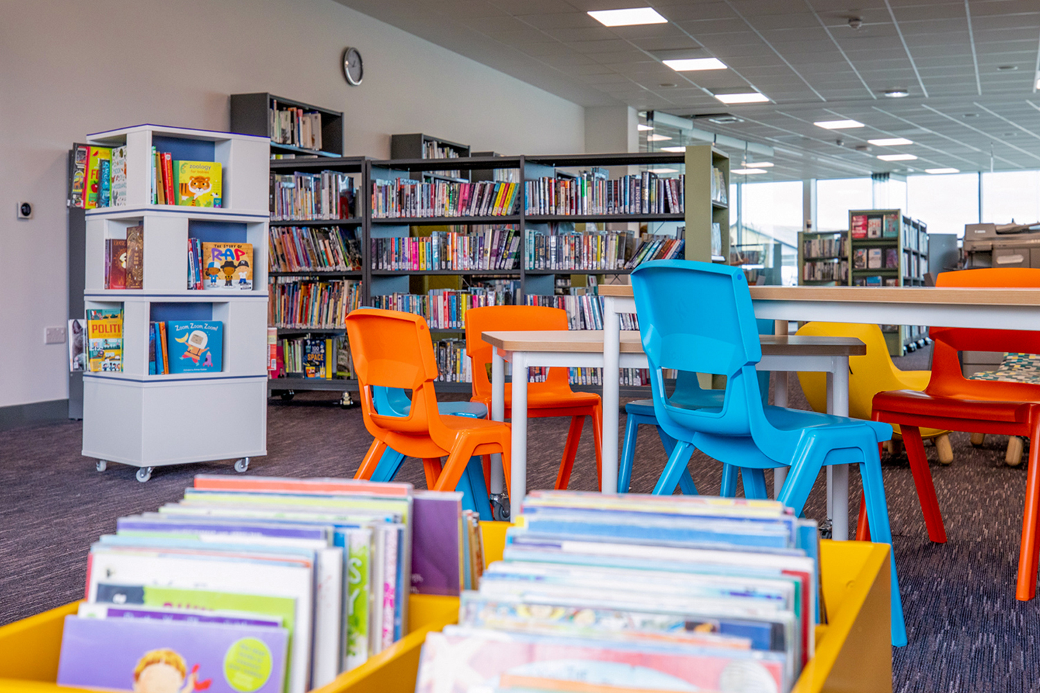 Large high-back chairs, colourful display shelving and mobile shelving gives the library a modern feel and the ability to be reconfigured to host library events.