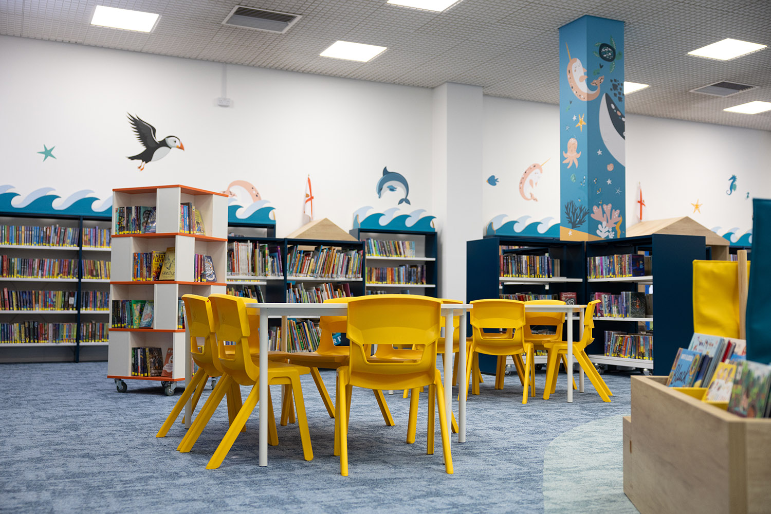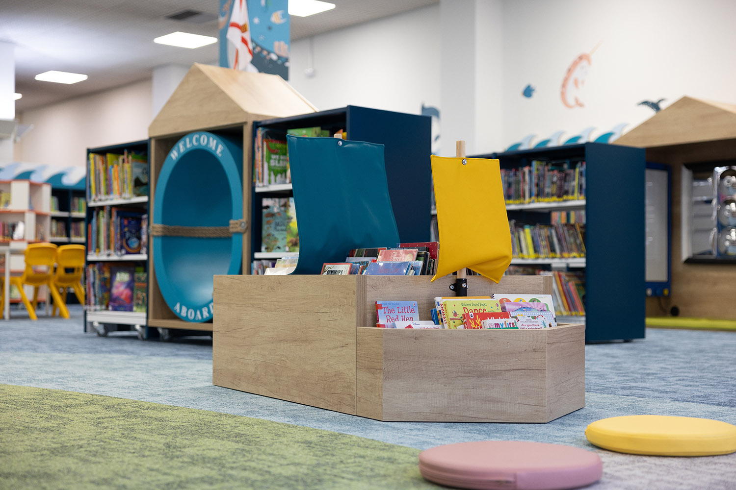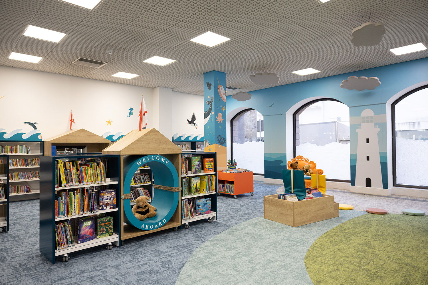 Of course, in Jersey, we needed to go with the sea theme so there are sea animals across the walls, a beautiful lighthouse in the special reading area and throughout the library there are boats filled with books. Importantly the library also includes a sensory area, a feeding chair, and "clouds" hanging from the ceiling which act as acoustic mufflers to reduce noise.