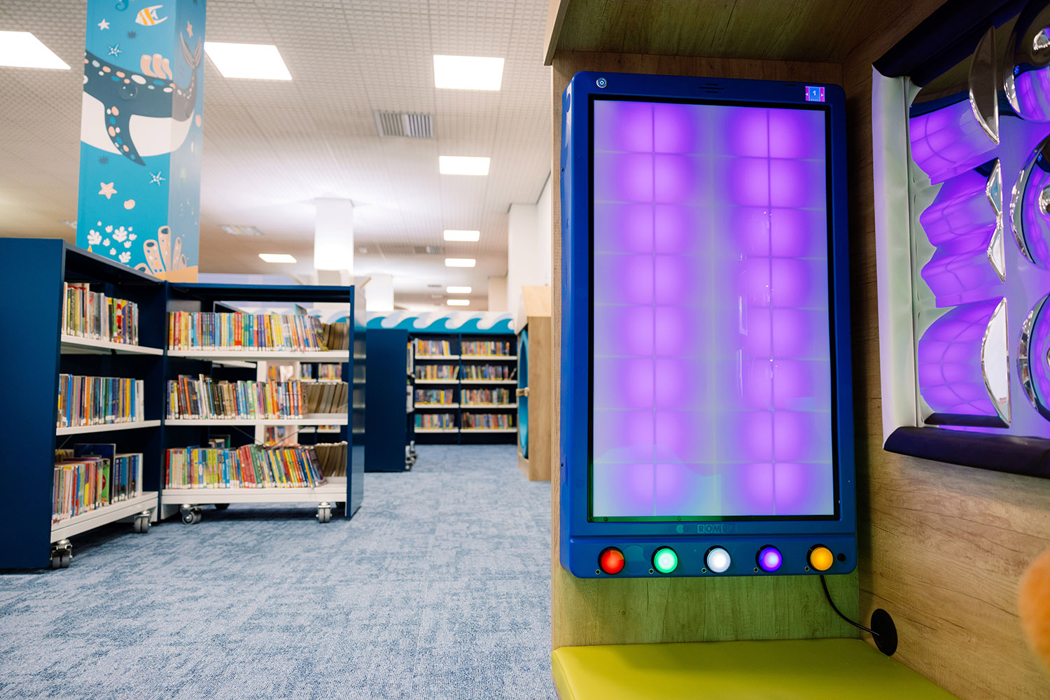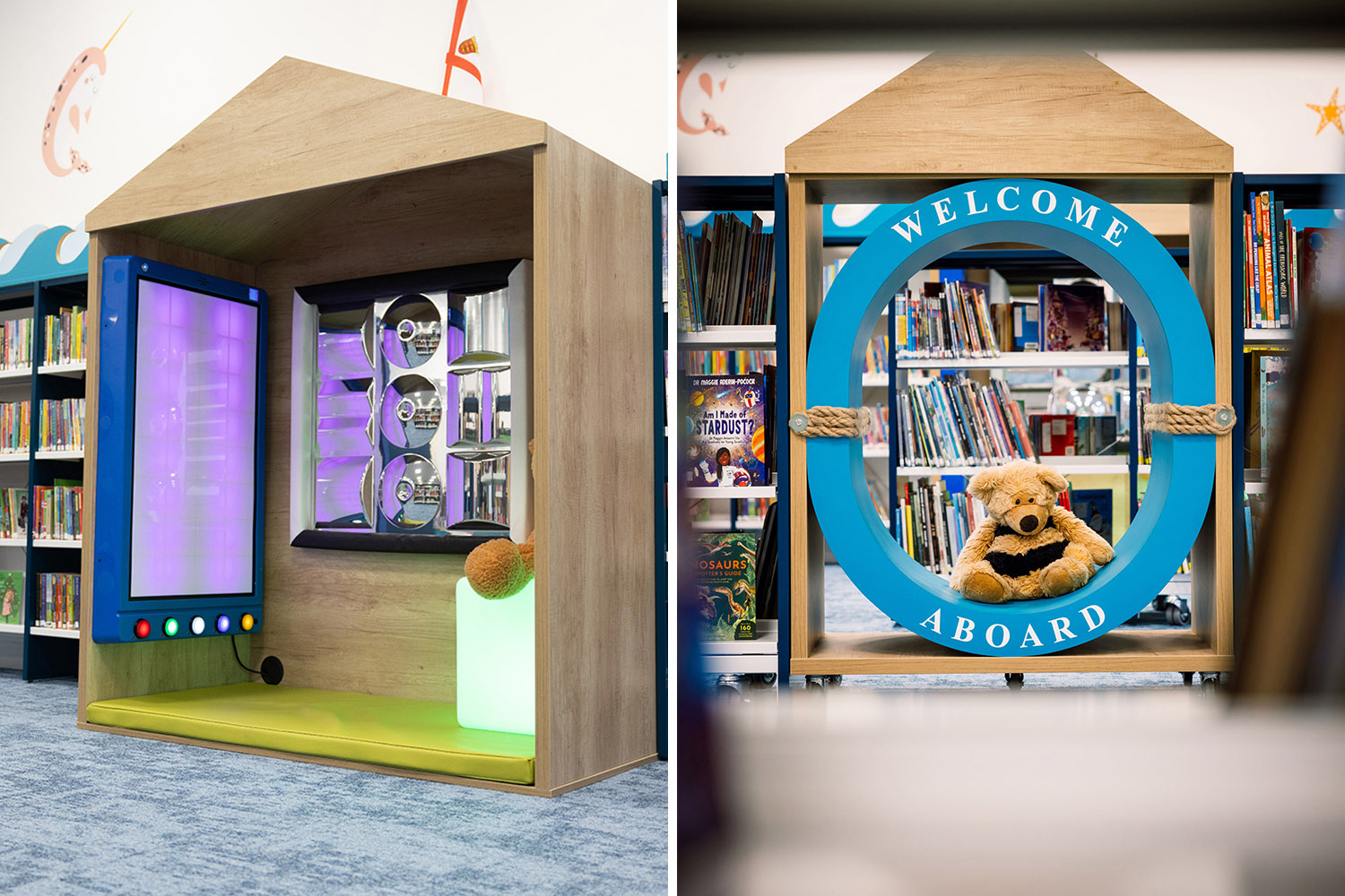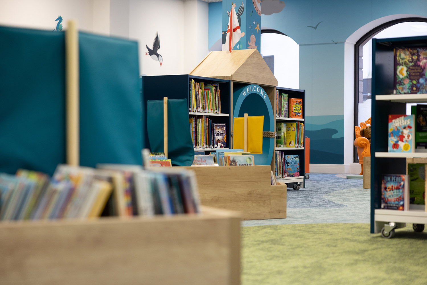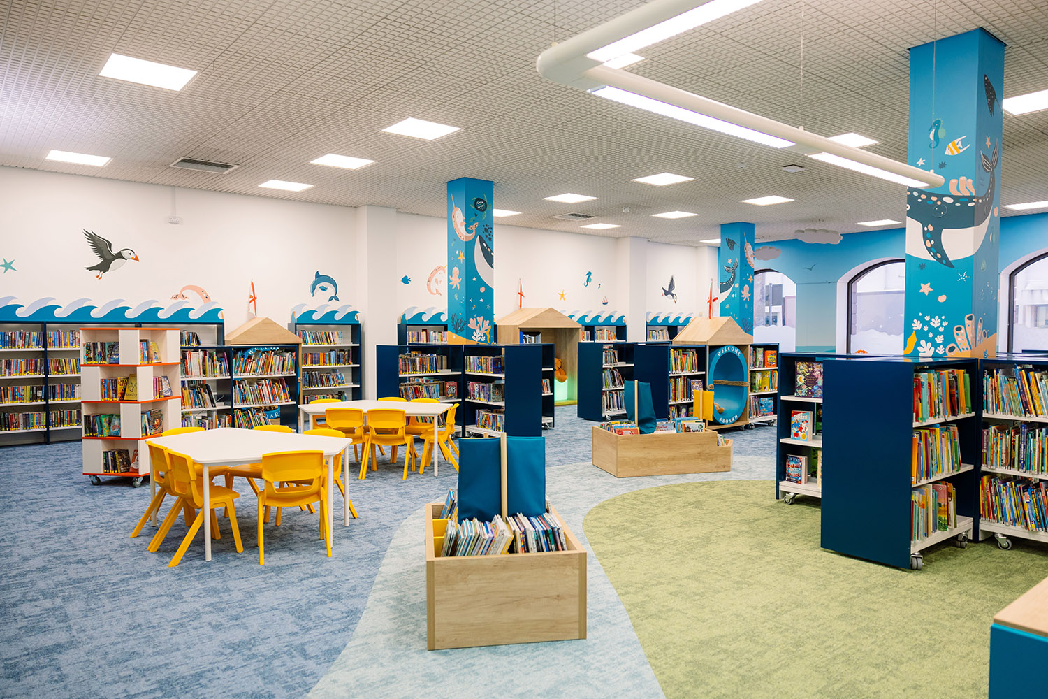 Of course, in Jersey, we needed to go with the sea theme so there are sea animals across the walls, a beautiful lighthouse in the special reading area and throughout the library there are boats filled with books. Importantly the library also includes a sensory area, a feeding chair, and "clouds" hanging from the ceiling which act as acoustic mufflers to reduce noise.