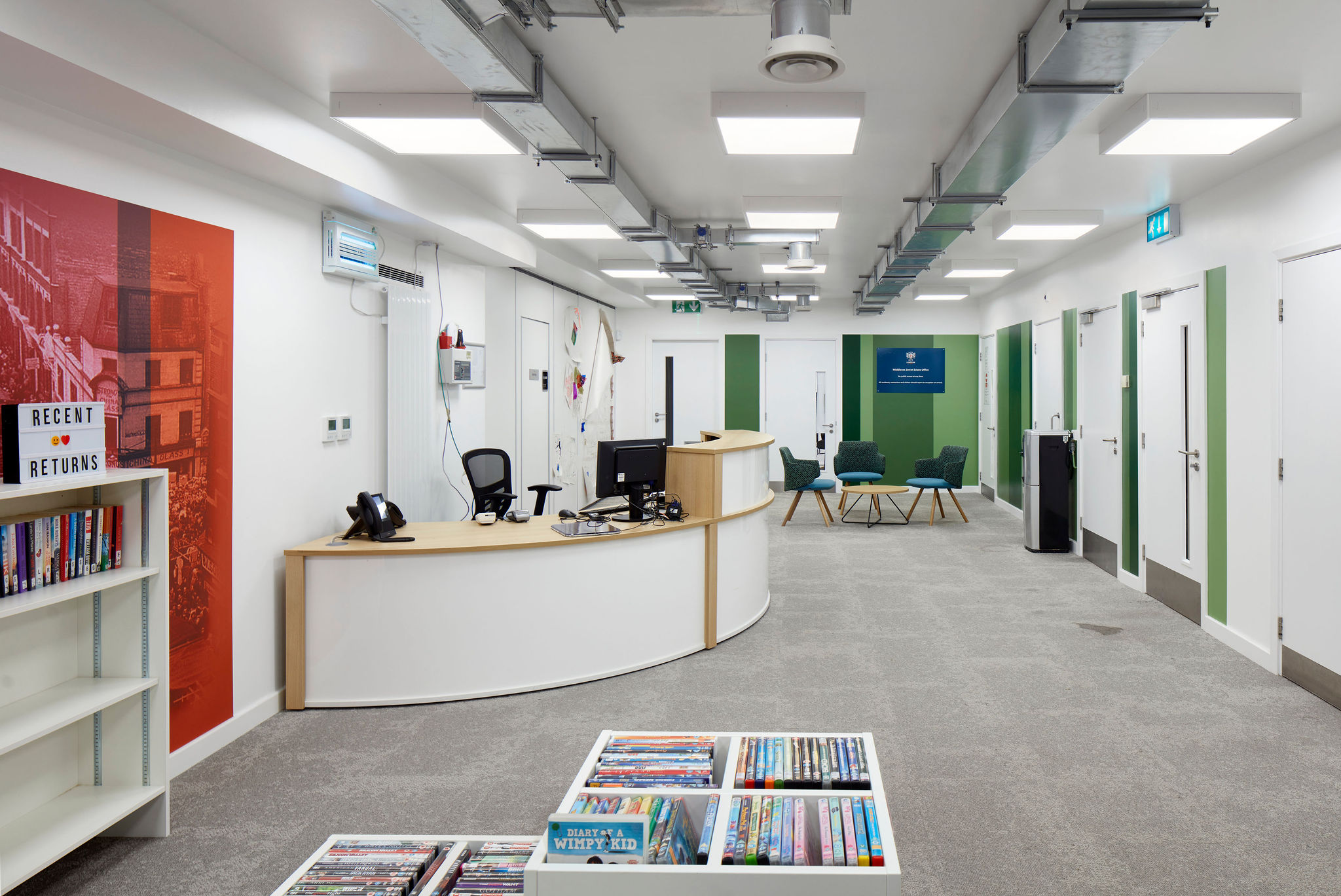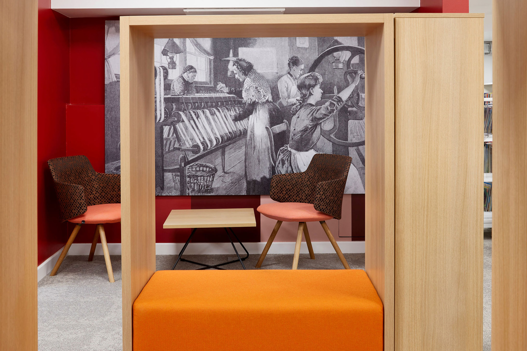 Our brief was to create a modern, vibrant, welcoming design that reflected this heritage of the area. The reception area was redesigned to consider the needs of the Housing Estate team as well as the Library Service and to reflect use of the library, which was predominately by families with young children and City workers. The low level island mobile shelving allows for easy flexibility and movement to open up and expand the space for group activities whilst the cocoon seating encourages a safe nook for quiet reding.