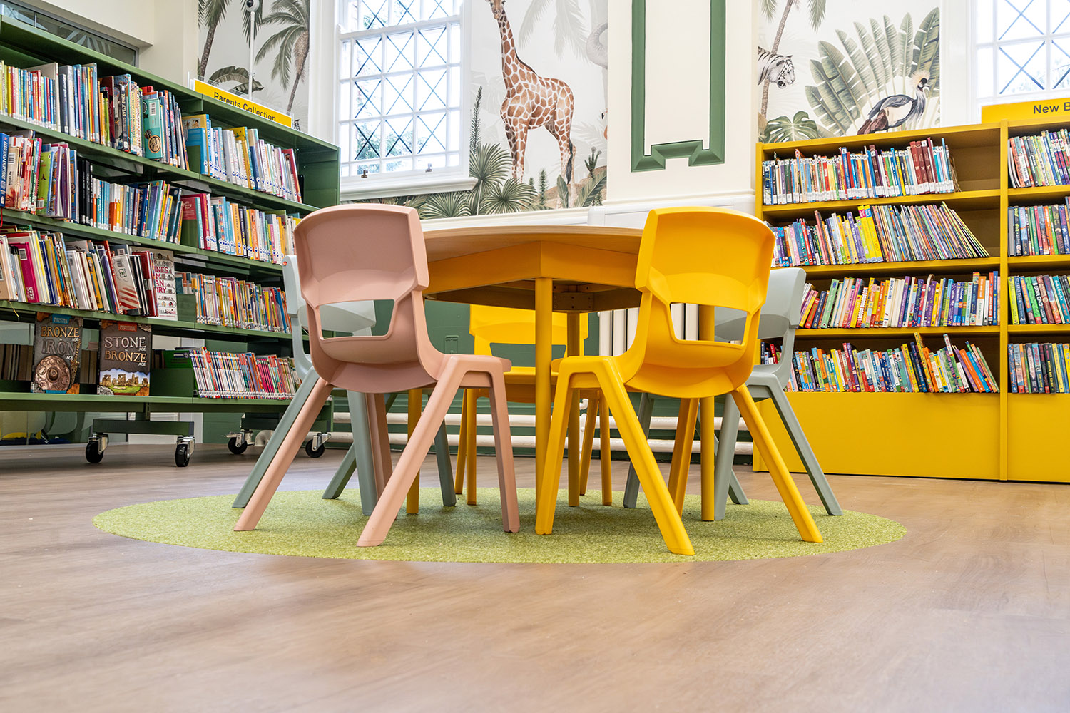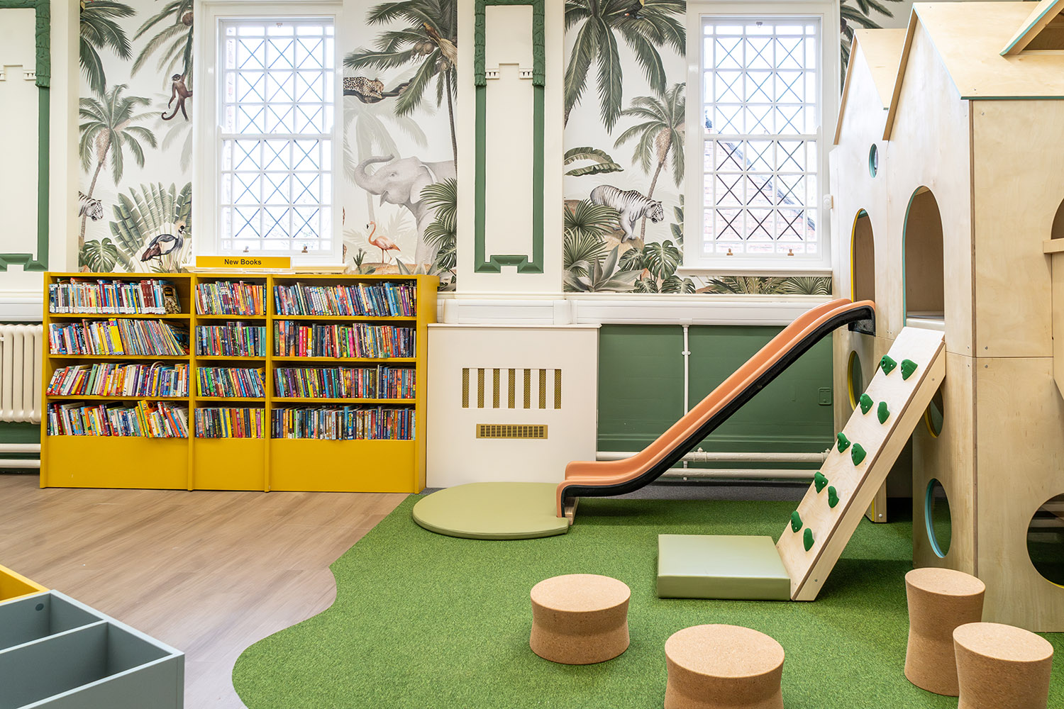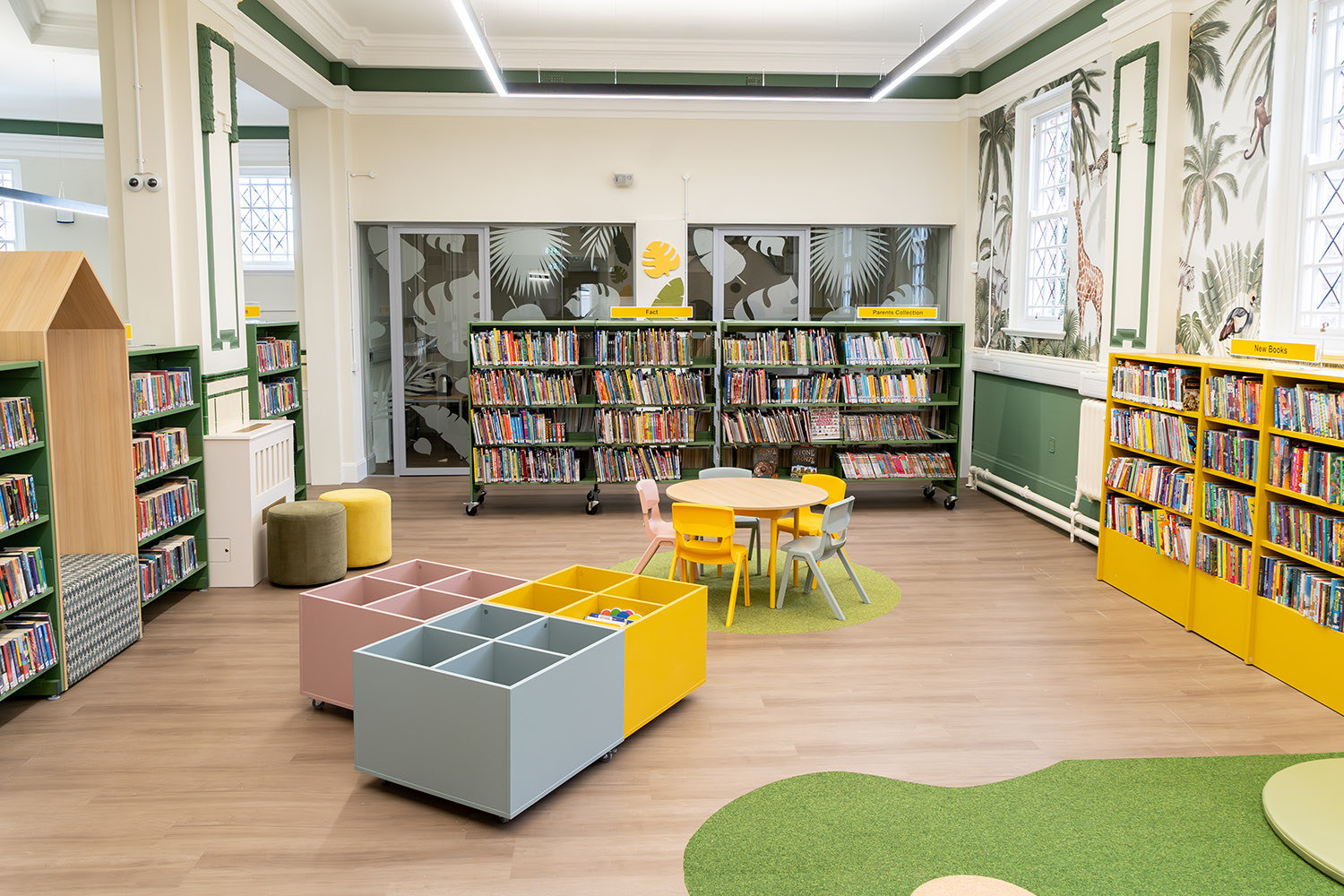 The children’s library captivates with a jungle-themed play zone, fostering creativity and learning through interactive installations. Bold colours, bespoke furniture and accessible shelving create an inclusive environment for young readers.