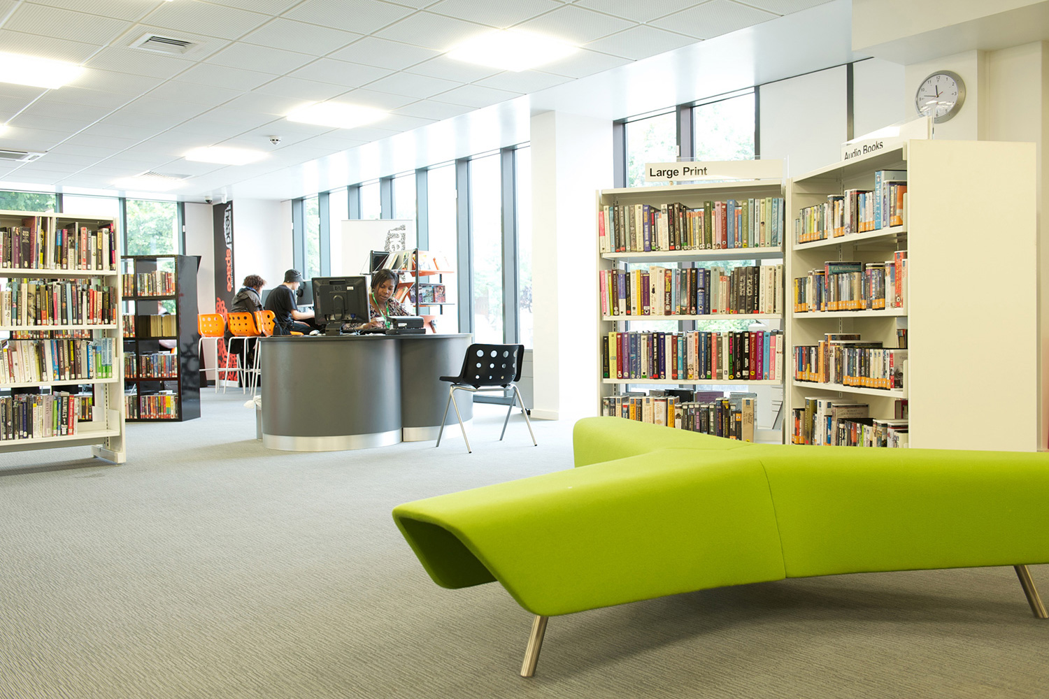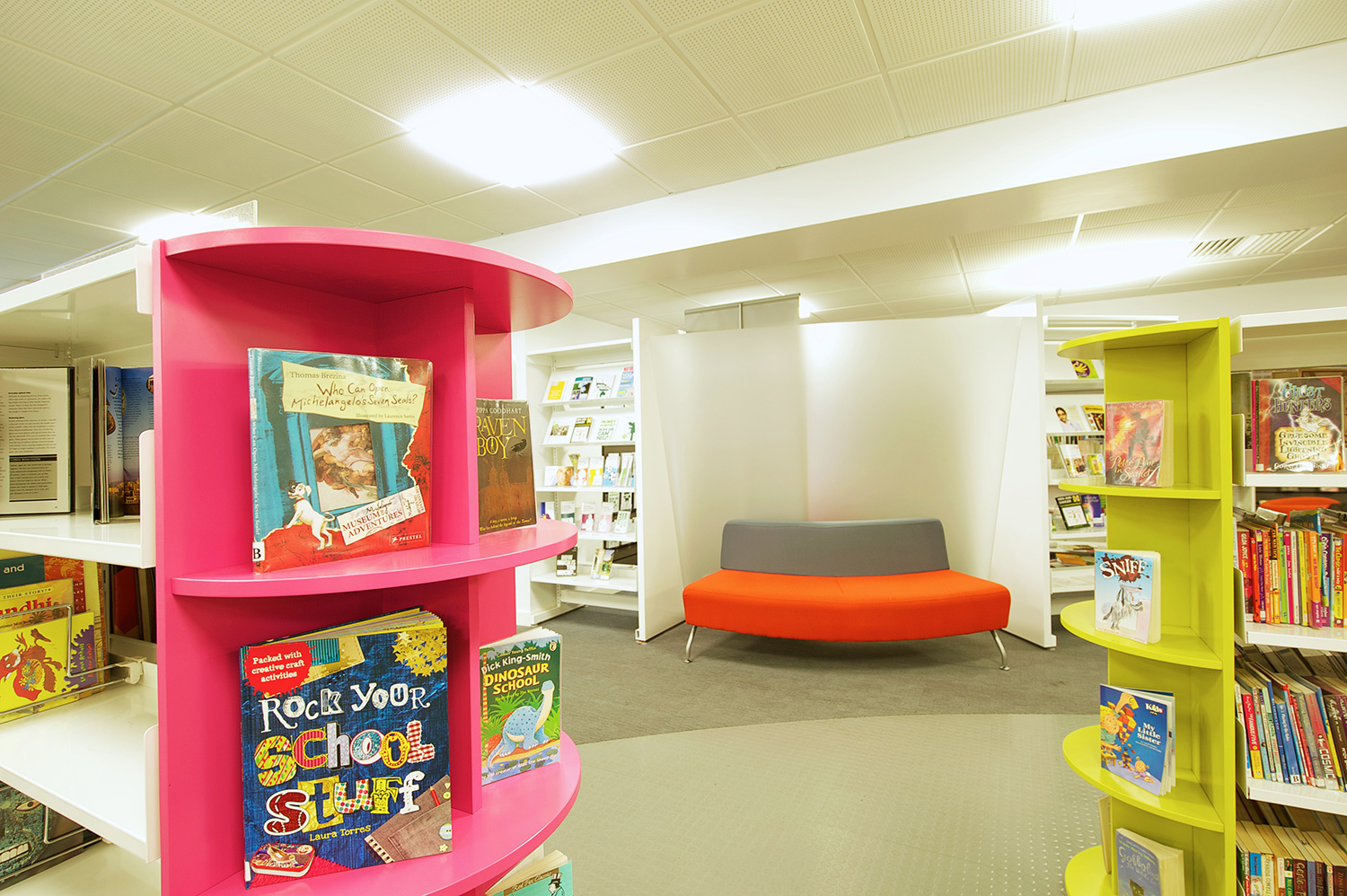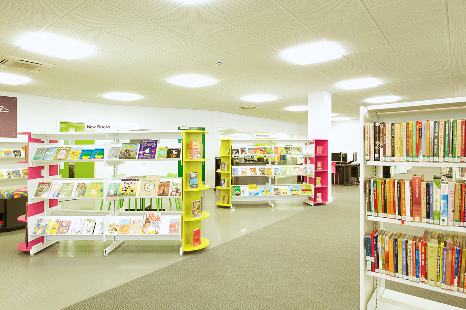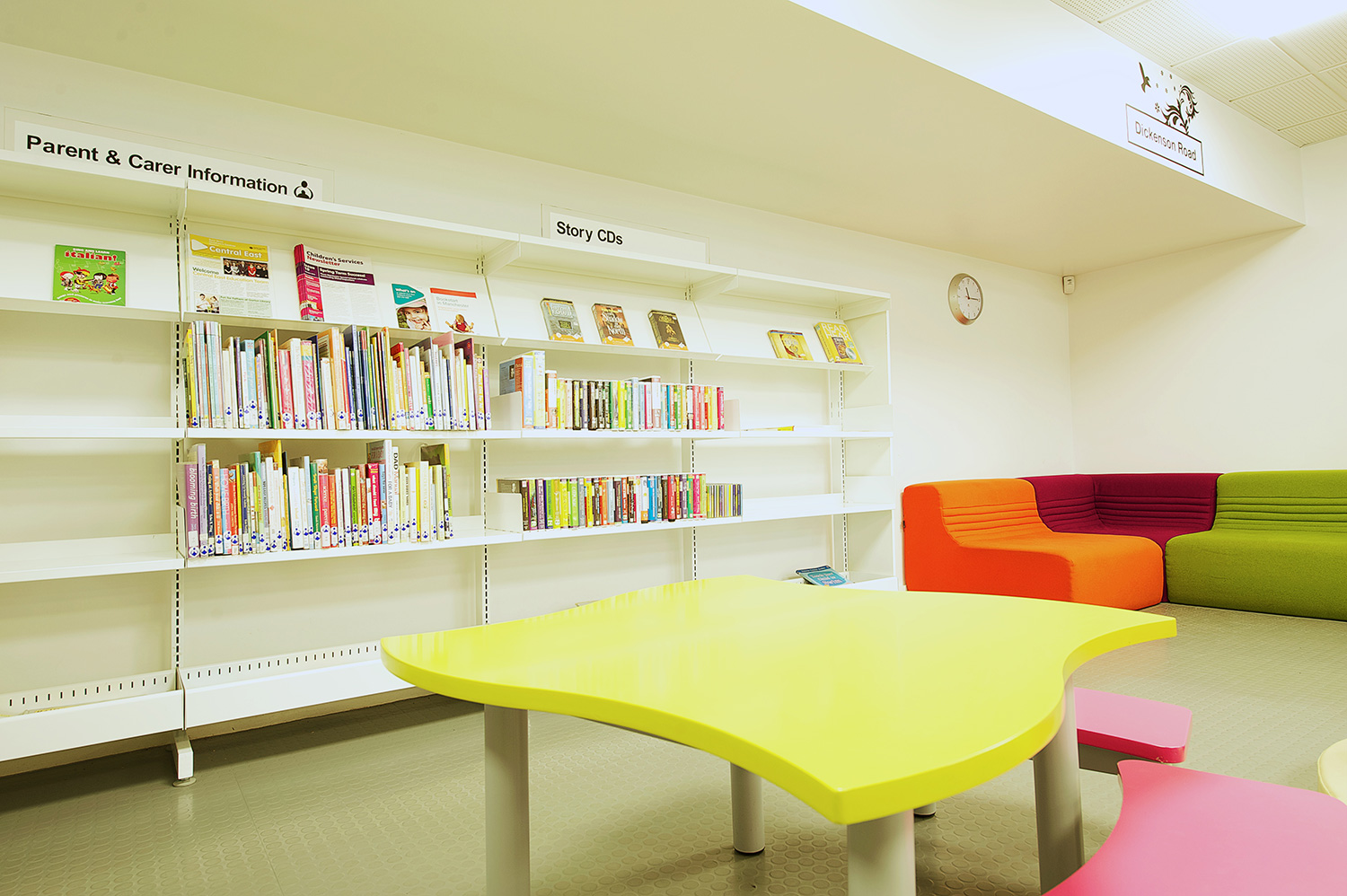 The library is equipped with Classic Steel Shelving System and specially made key pieces of furniture, designed to highlight the current quick pick furniture. The library share the same basic concept as Beswick, Brooklands and the Central Library in Manchester, but the unique colour themes and a couple of characteristics details give the library its own identity.