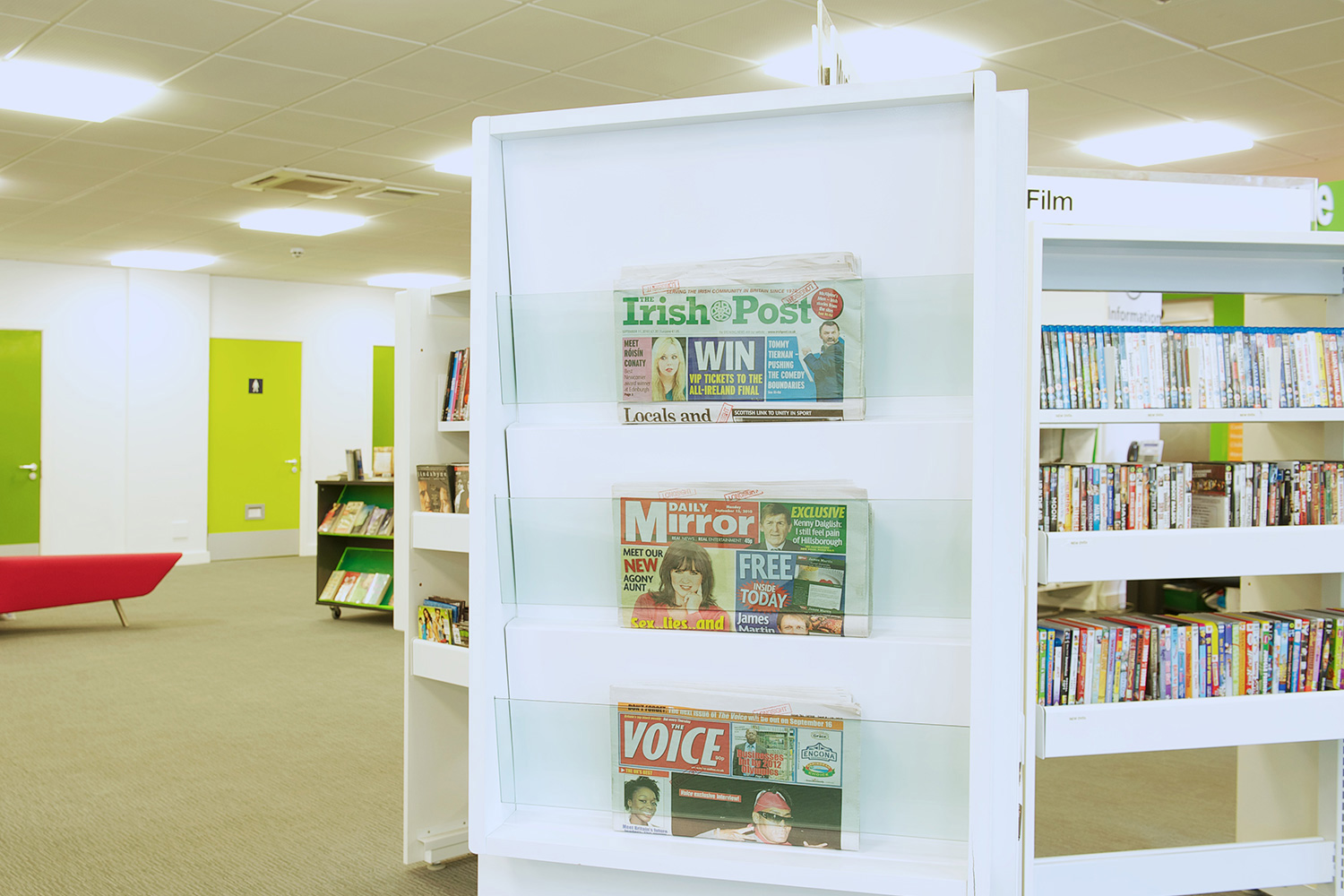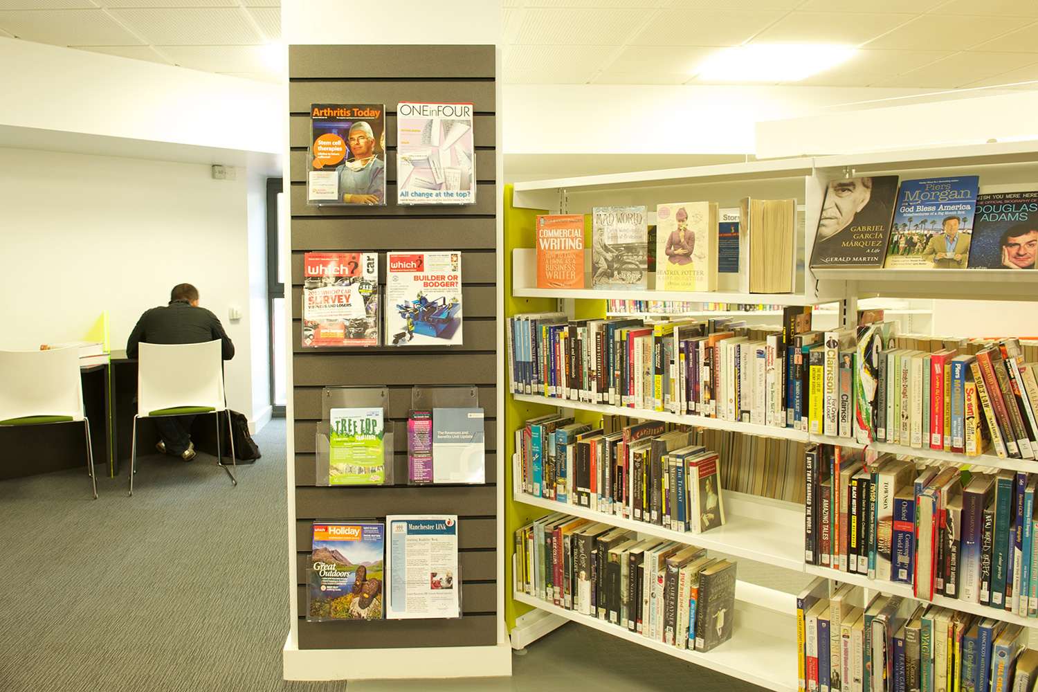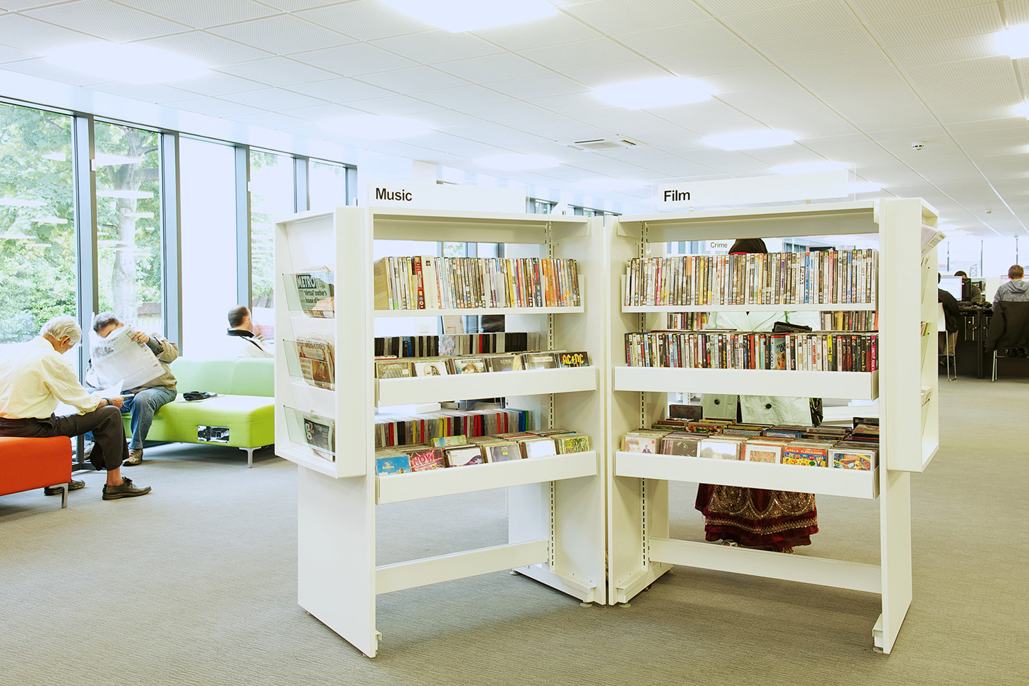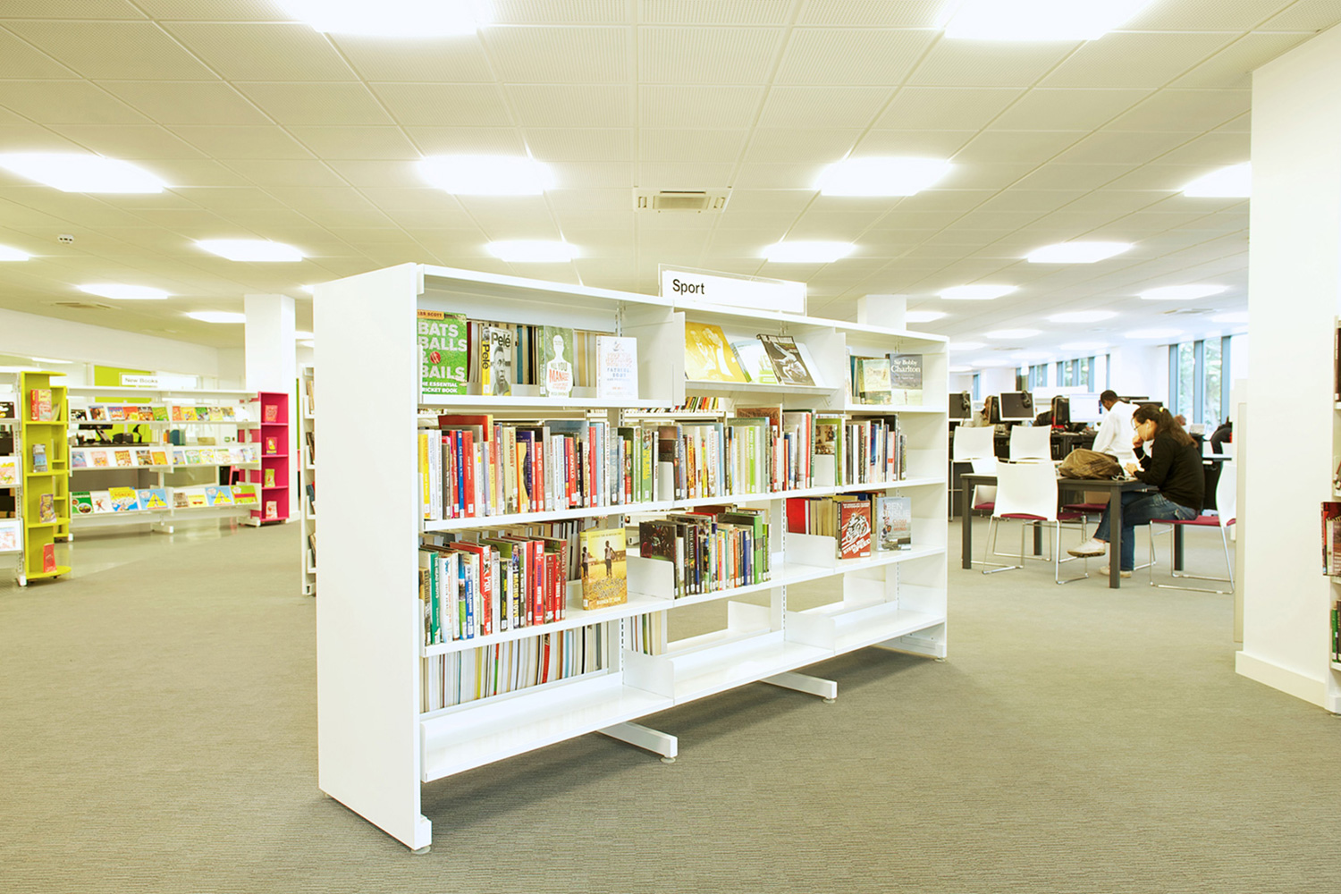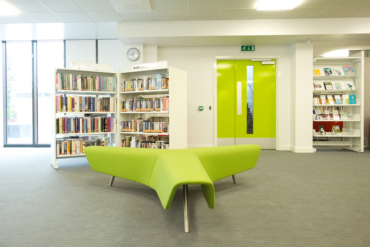The library is equipped with Classic Steel Shelving System and specially made key pieces of furniture, designed to highlight the current quick pick furniture. The library share the same basic concept as Beswick, Brooklands and the Central Library in Manchester, but the unique colour themes and a couple of characteristics details give the library its own identity.