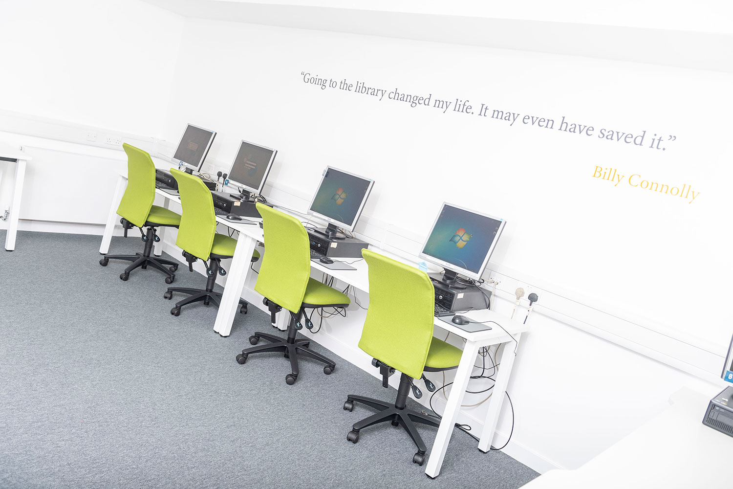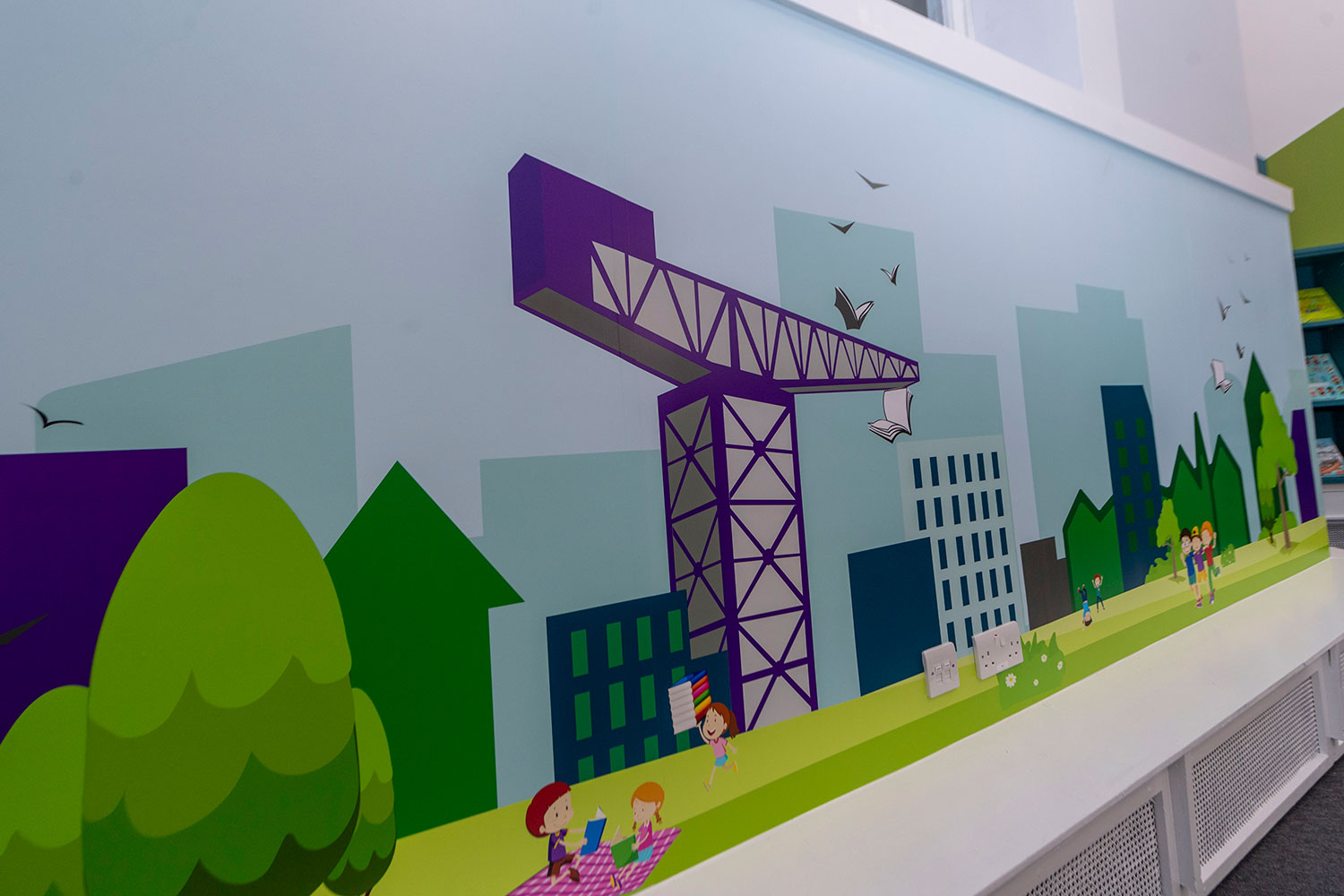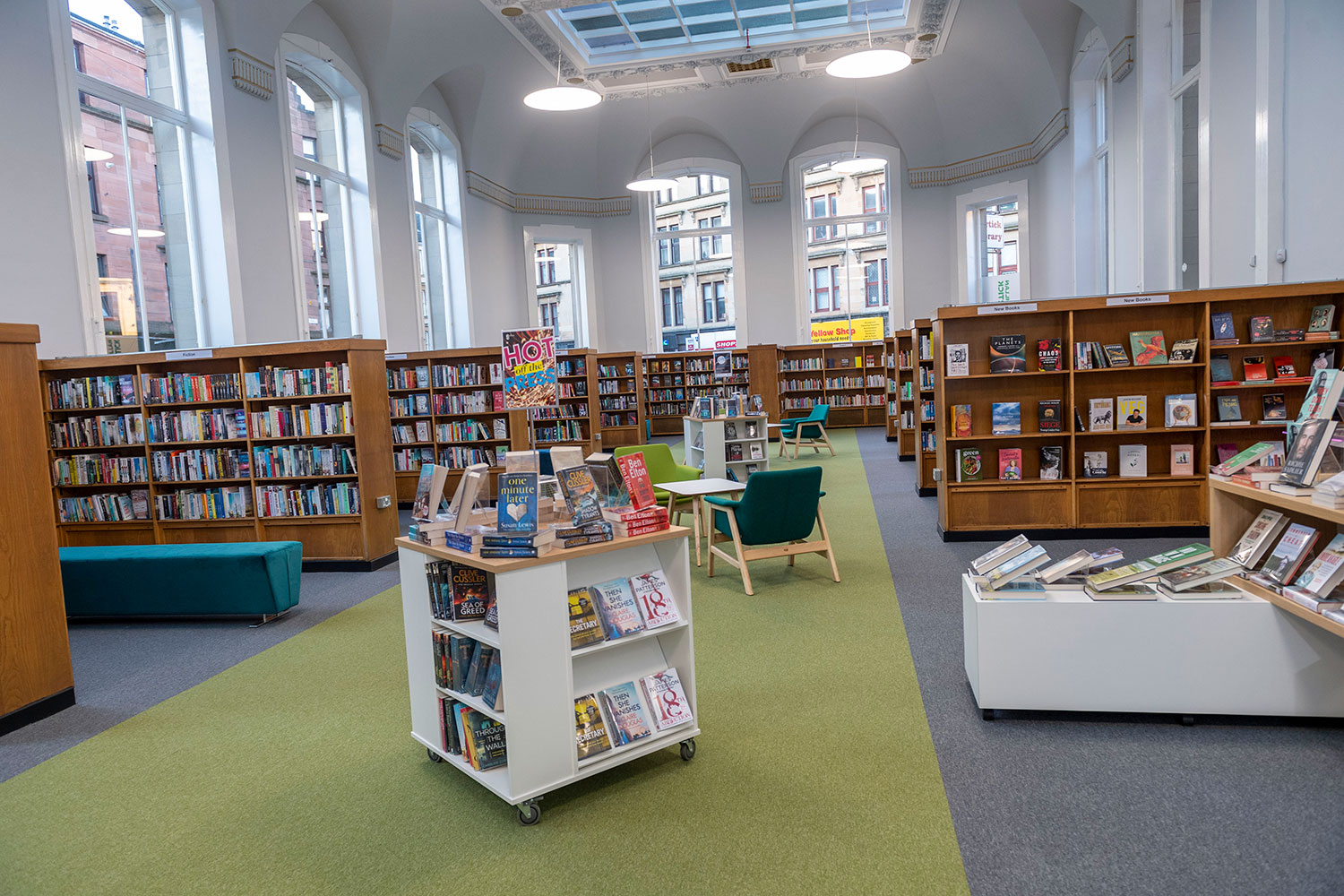 The Children’s Library has been completely revamped. Brightly coloured walls, shelving and furniture capture users attention and creates a space where youngsters want to spend time. A multi-platform stage can be used for events and a sensory nook, the first available in Glasgow, provides a safe space for children with additional needs.