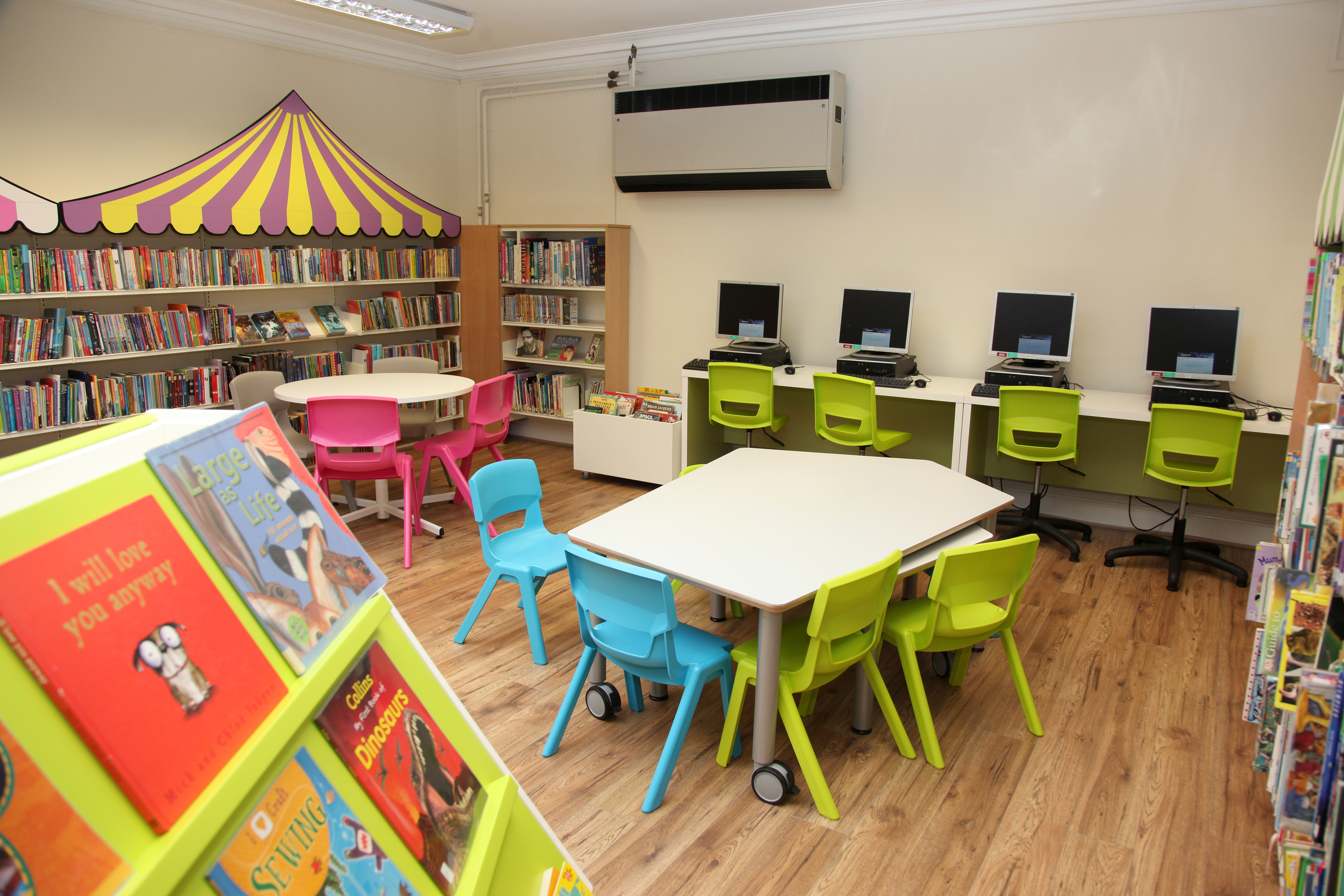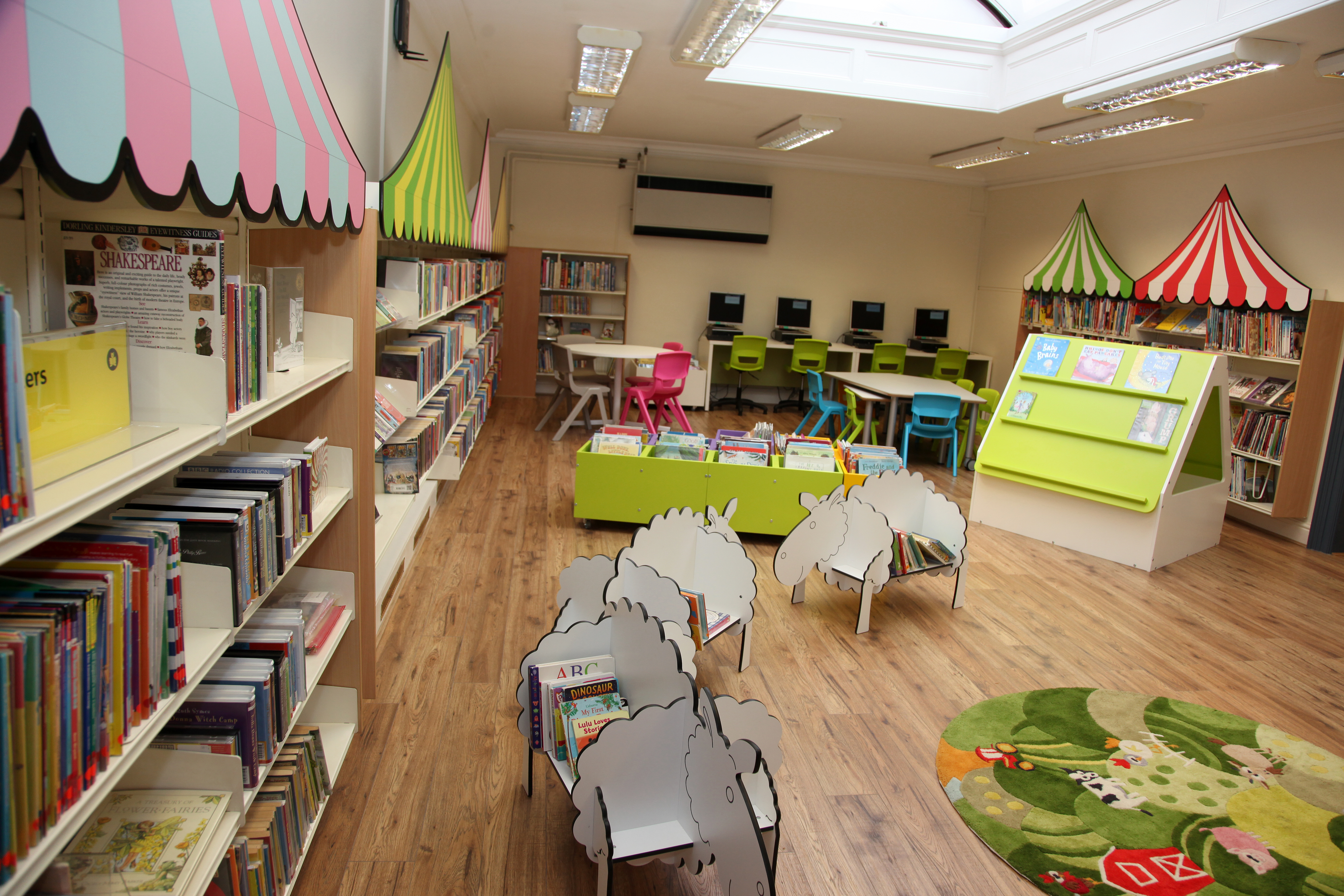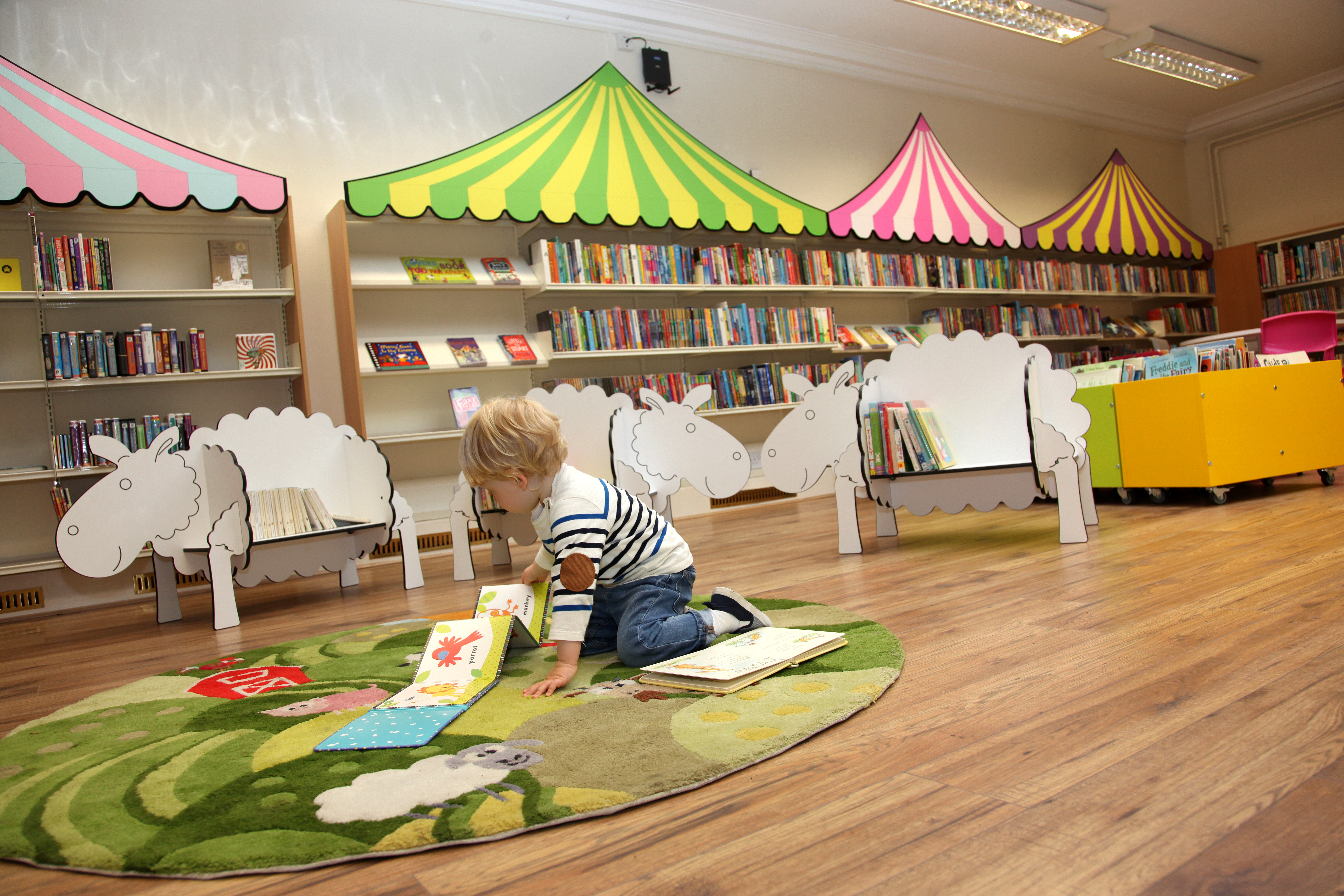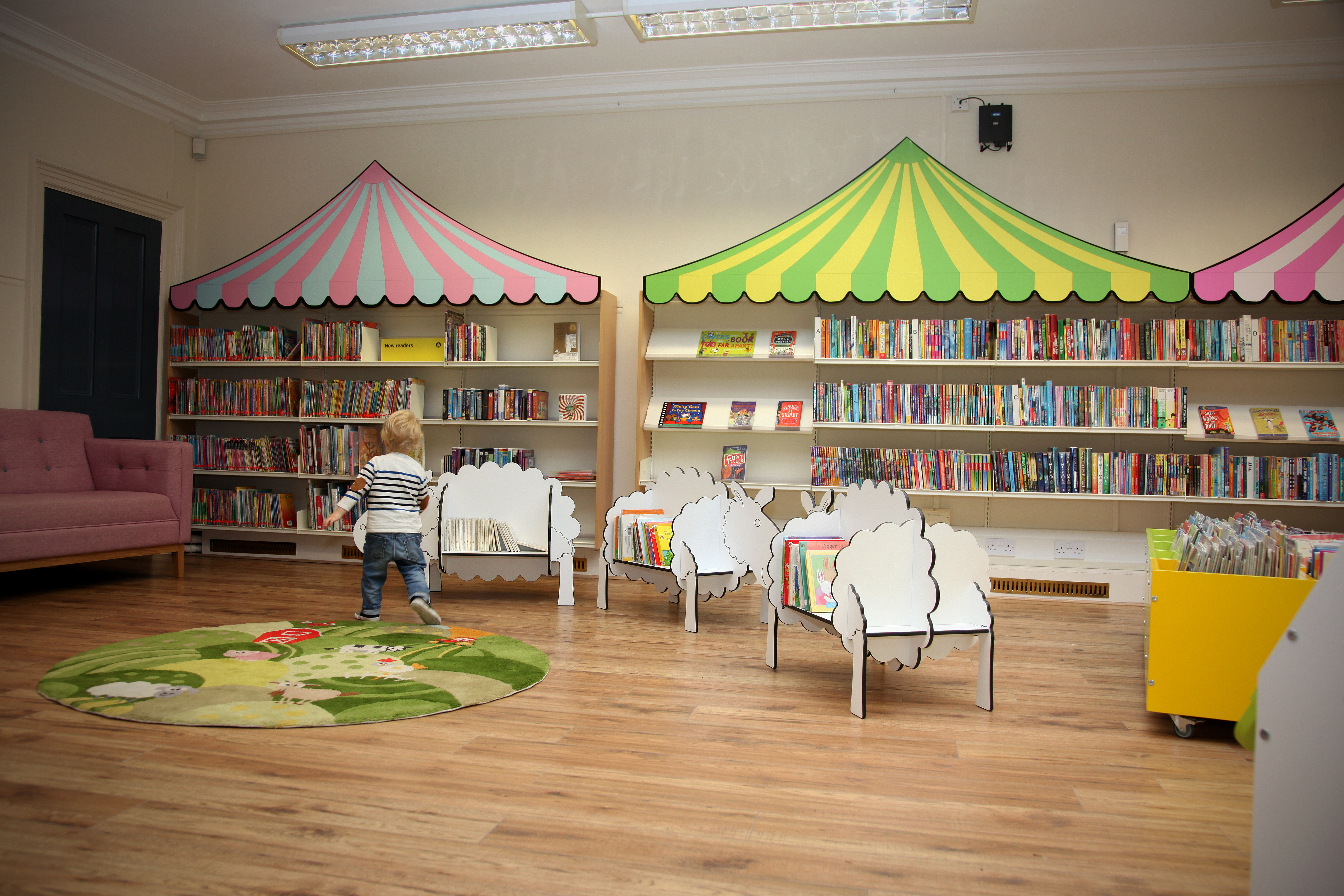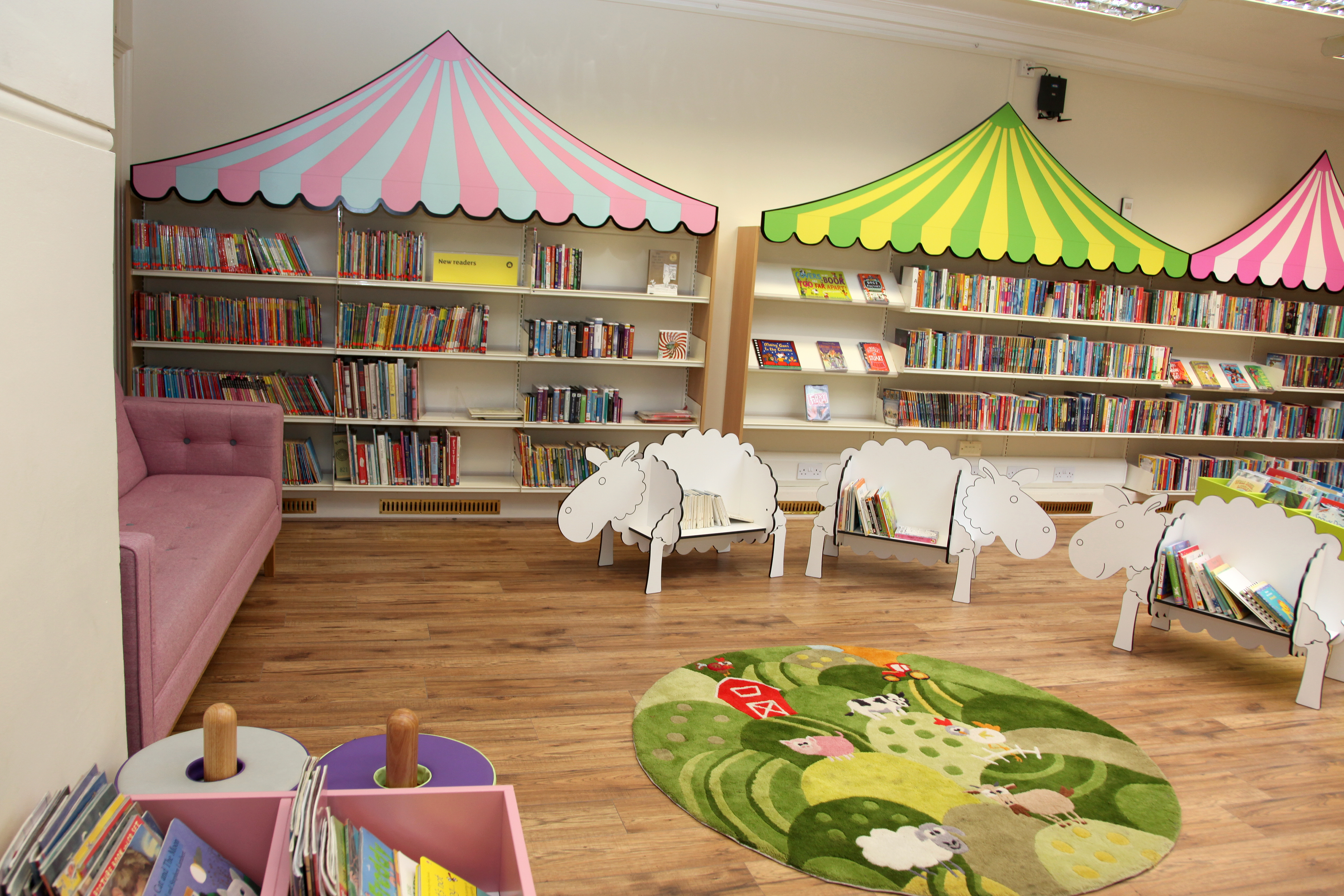 Stamford Library was brought back to life by thedesignconcept in 2016. The children’s library was transformed into a farmland fantasy. Brightly coloured, bespoke canopies were added to the children’s shelving, sheep shaped book storage make an impression for the youngest visitors while adults make themselves comfortable on the large sofas.
