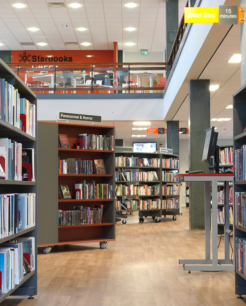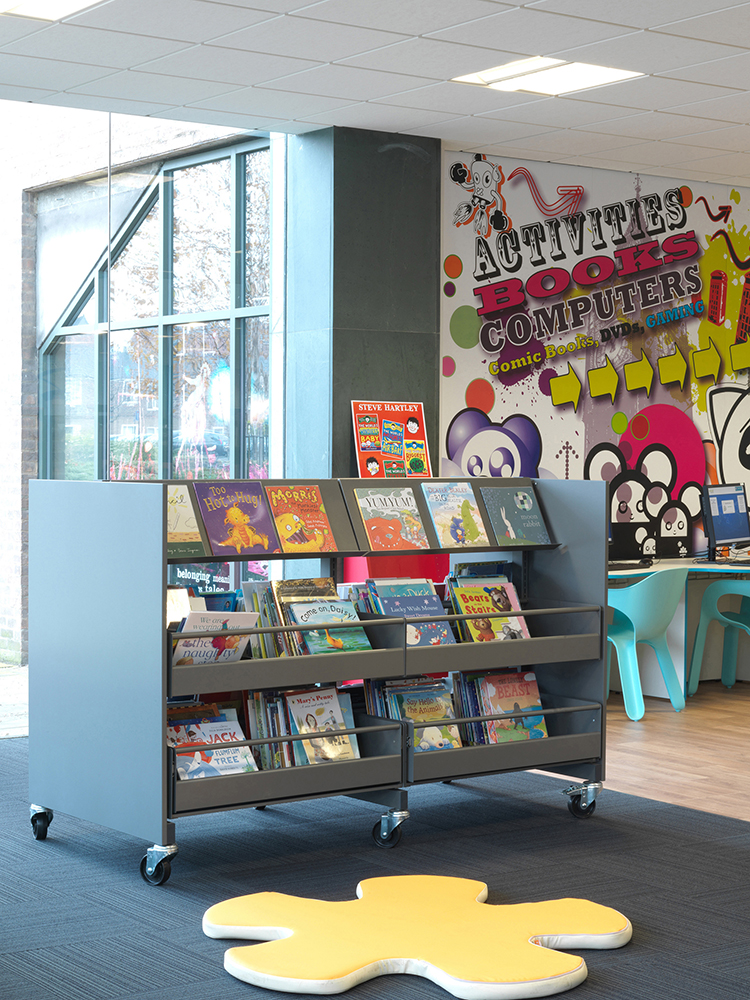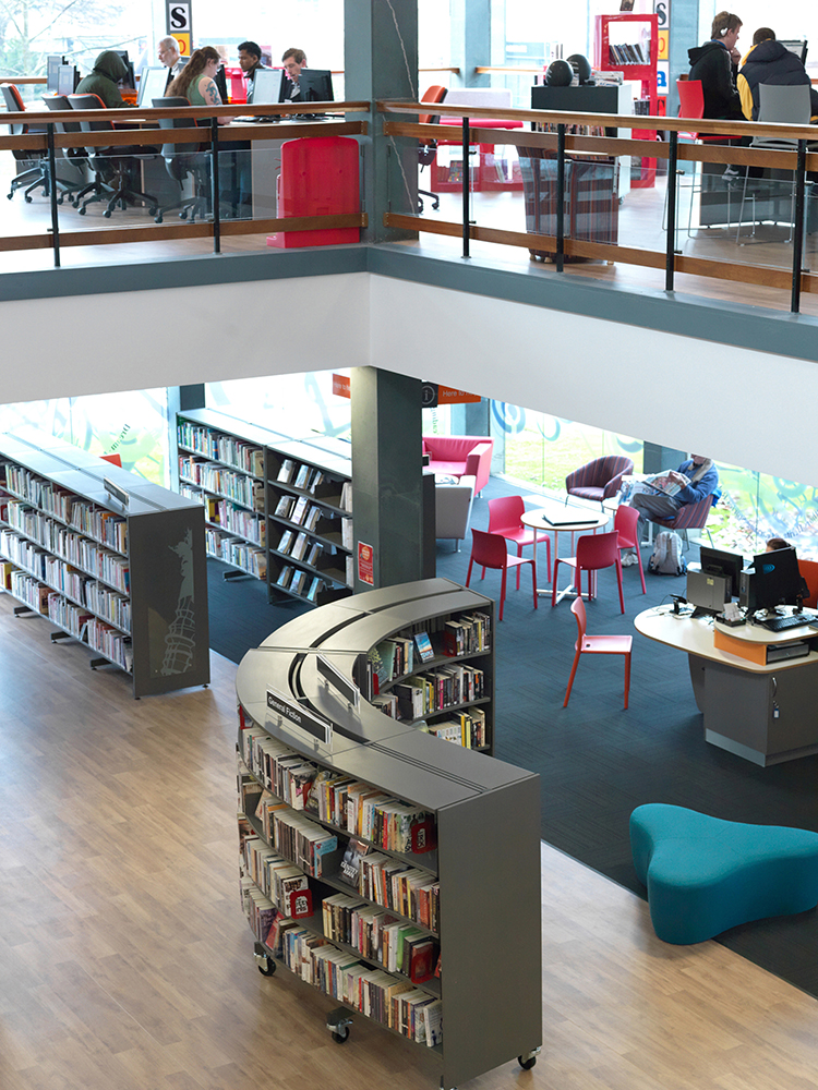 The library boasts state of the art technology with a specialist technology suite for blind and visually impaired people. There is also an area that is dedicated to local and family history where the use of Gothia Shelving with punched wooden end panels creates an environment that has a traditional quality about it whilst still maintaining the modern feel of the rest of the building.