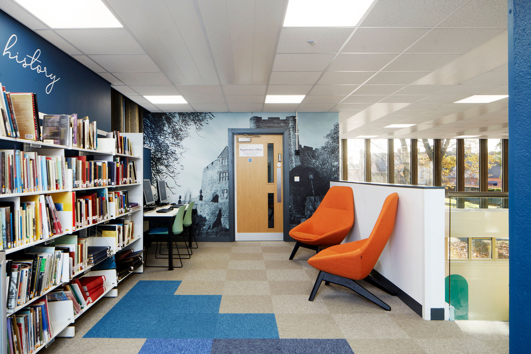 The beautiful heritage area is a space designed to honour, and delve into, the rich history of Tamworth. The large photographic mural dedicated to Tamworth Castle evokes a sense of nostalgia and pride for residents as well as a gentle educational message for visitors to the library.