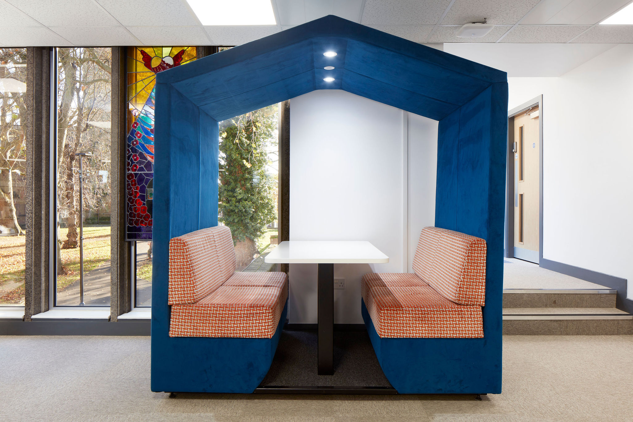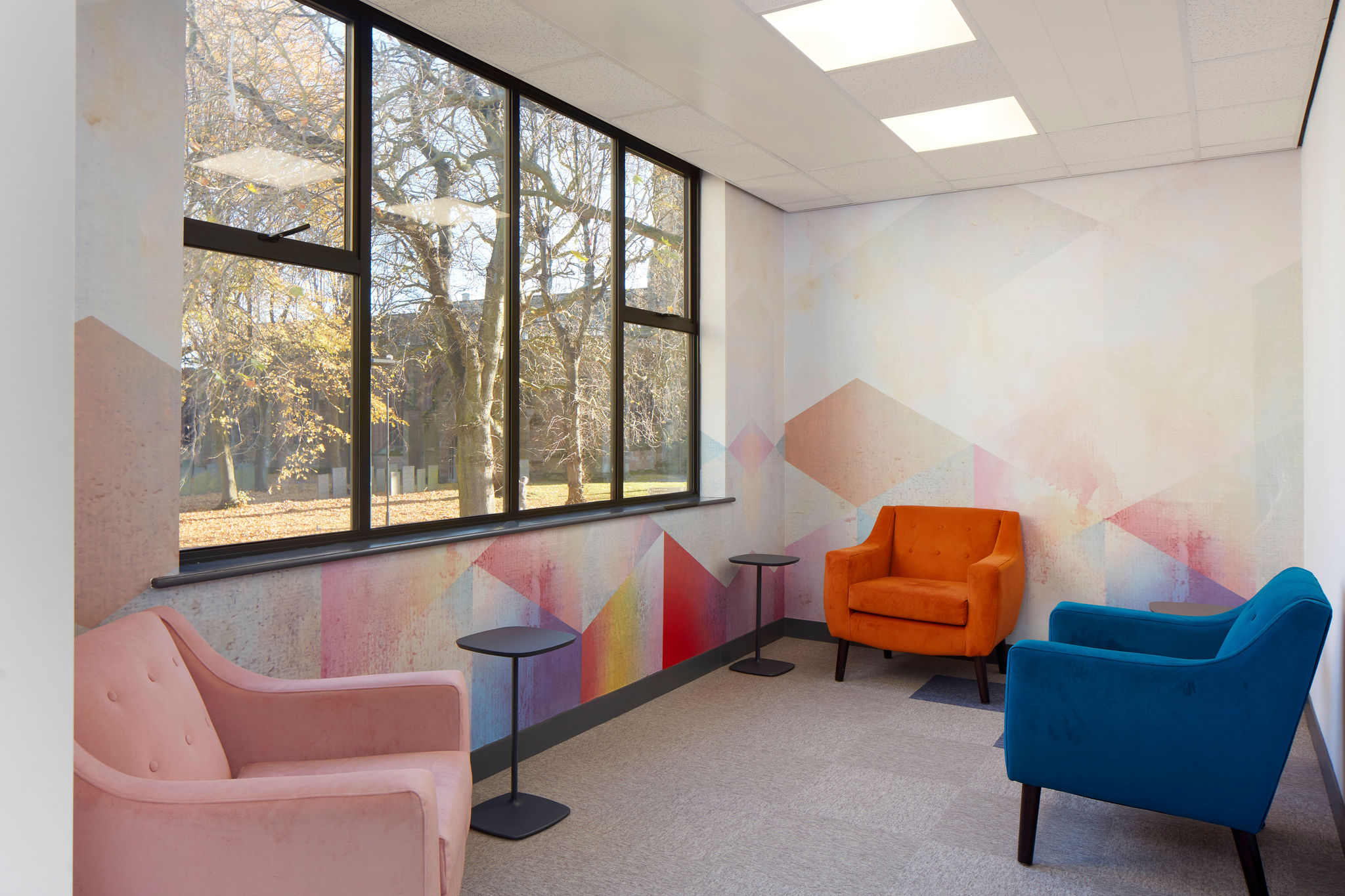 Special attention to detail was paid to the fabric selection and colours for all the soft furnishings. Thedesignconcept ltd. chose all the paint finishes throughout the library and these are complimented with the use of carefully selected digital graphics and inspirational quotes that lift the overall mood of the space; allowing for more positive and motivated users. We designed a carpet layout that also punches with random placement of colour that will work with any future layout of the space.