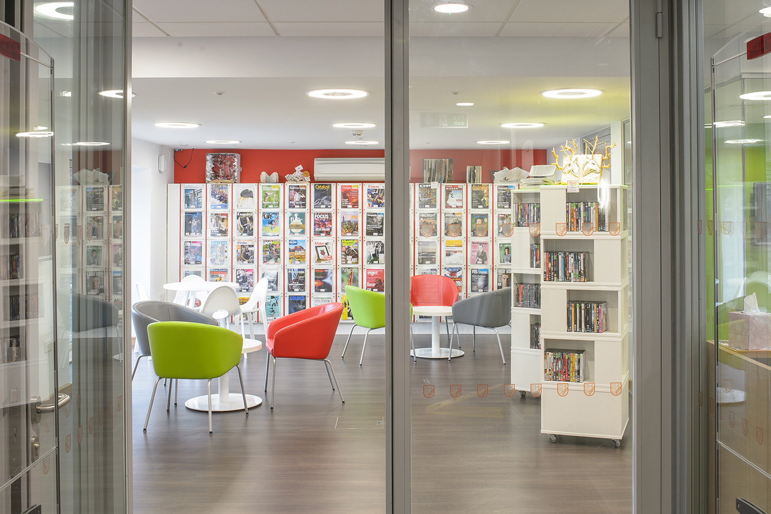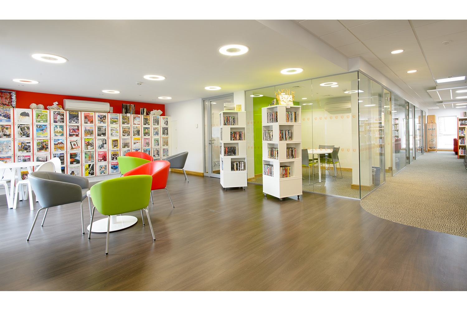 Thedesignconcept provided a furniture and shelving solution for a new academic and creative hub for Sixth Form Students at the College. All desking was provided with surface mounted power allowing each station to be used with a fixed PC or left free for students to plug in their own devices via socket or USB points. A purpose built magazine and journal wall was provided to allow the clear and attractive display of content with the ability to store archive issues. Furniture was also provided for the student kitchen.