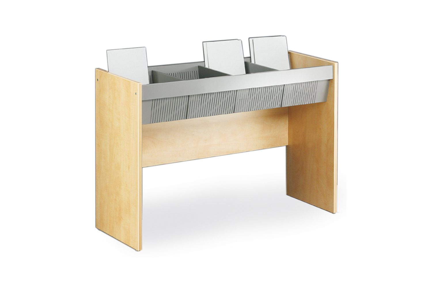 Many combinations can be achieved with this browser. It is available as a single-sided or double-sided unit; as free-standing or as an add-on; and in three different heights. It is ideal for larger books and maps, but also suitable for DVDs with the use of moveable metal dividers.