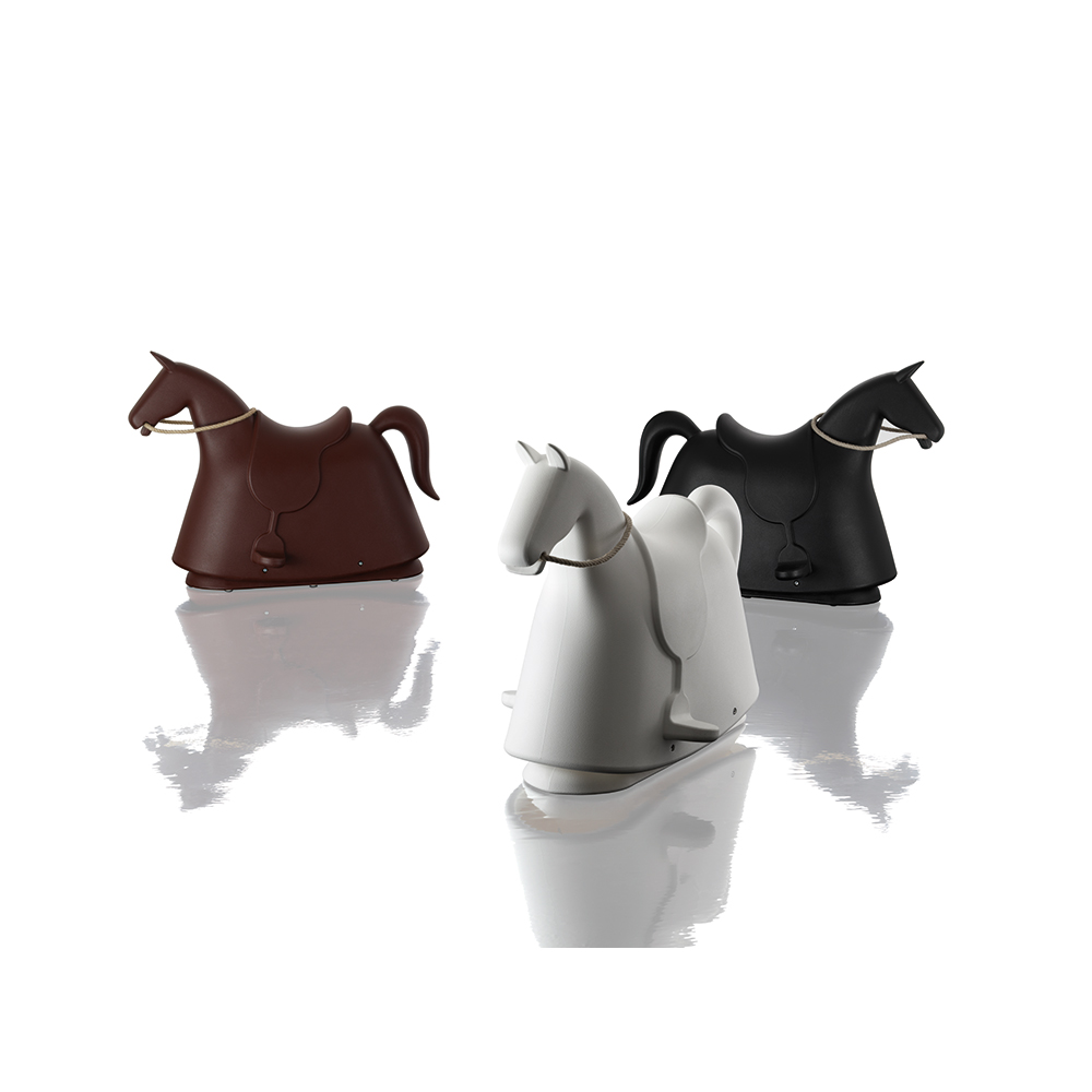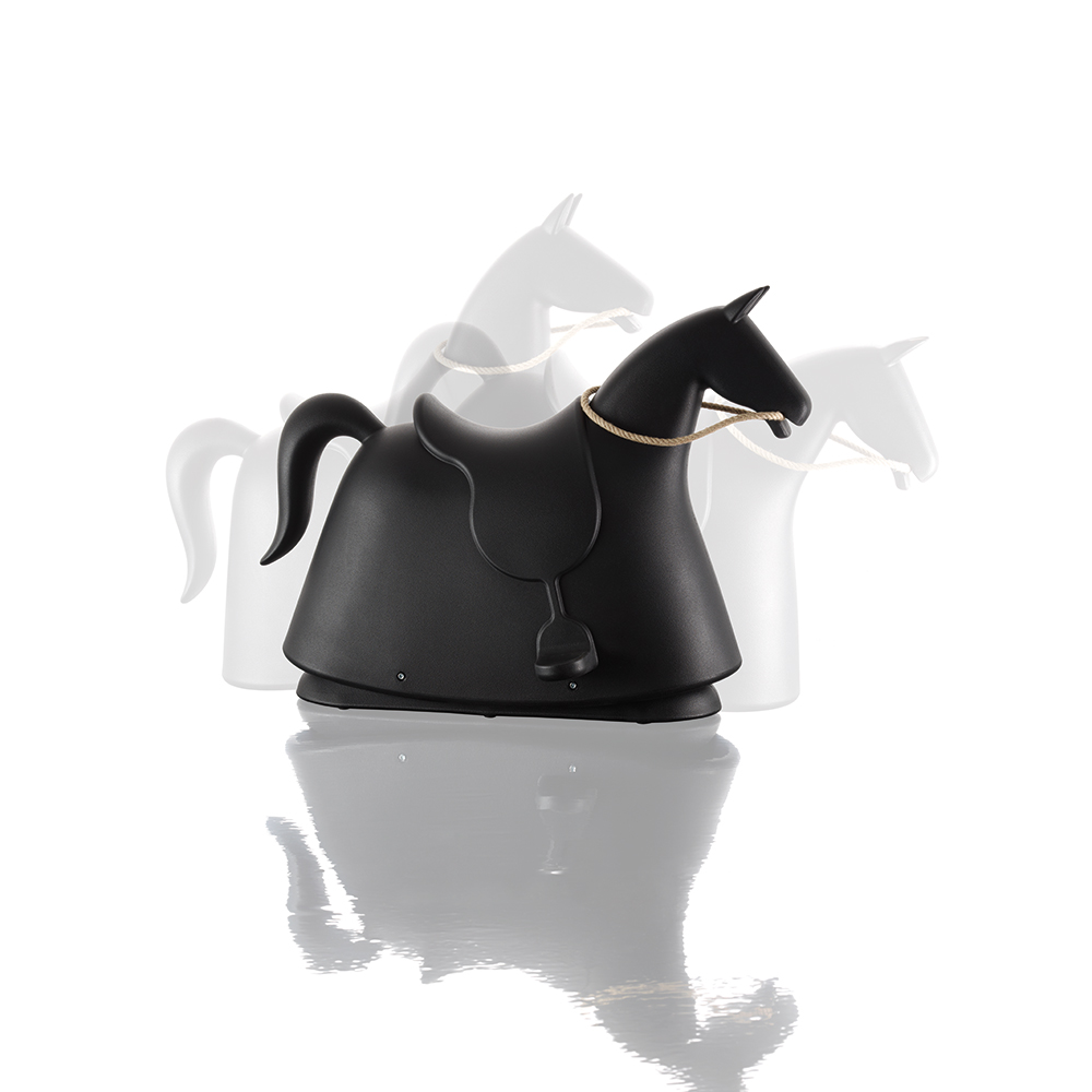 The rocking horse is mounted on a stable platform without runners, eliminating the risk of hands and feet getting caught. Giddy-up!
