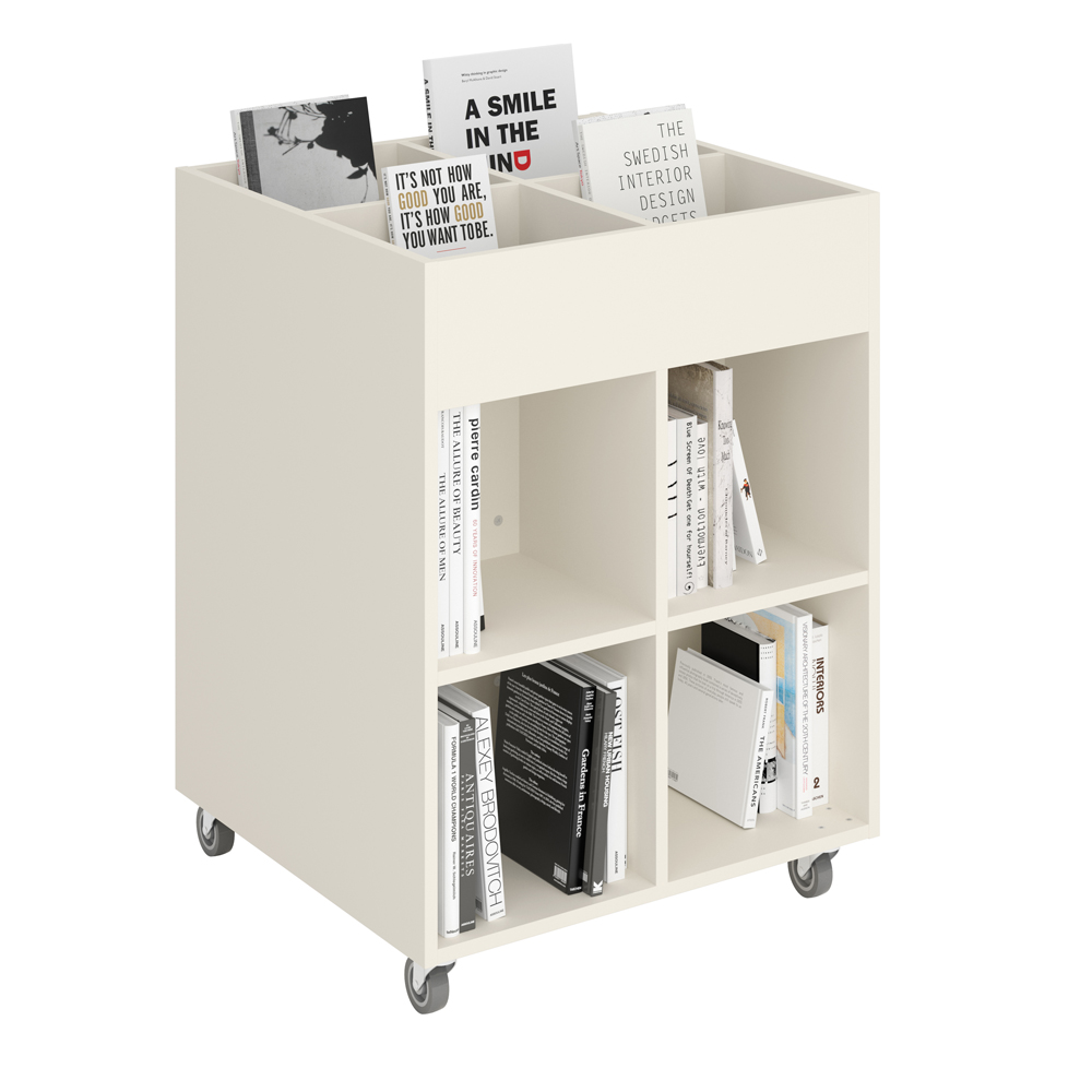 Sara Maxi is a book browser with four display compartments at the top and eight storage compartments underneath. Ideal for both children and adults.