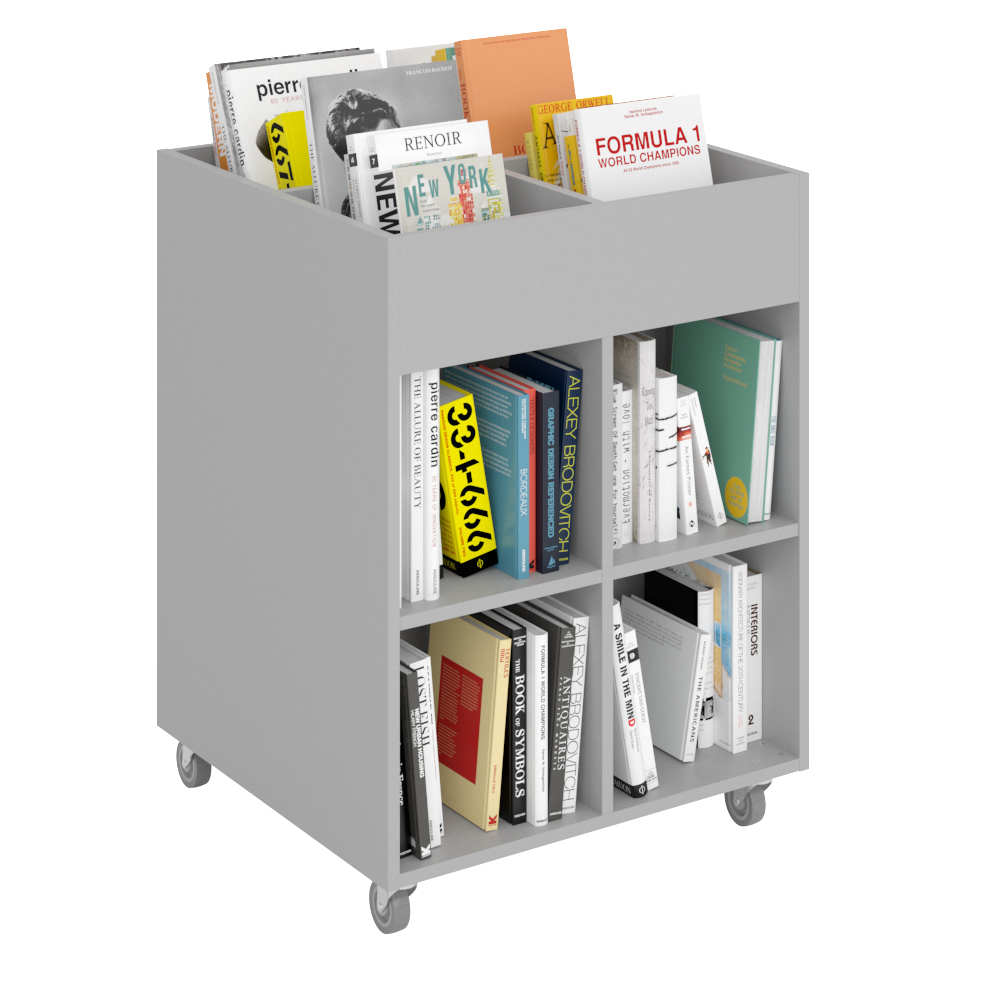 Sara Maxi is a book browser with four display compartments at the top and eight storage compartments underneath. Ideal for both children and adults.
