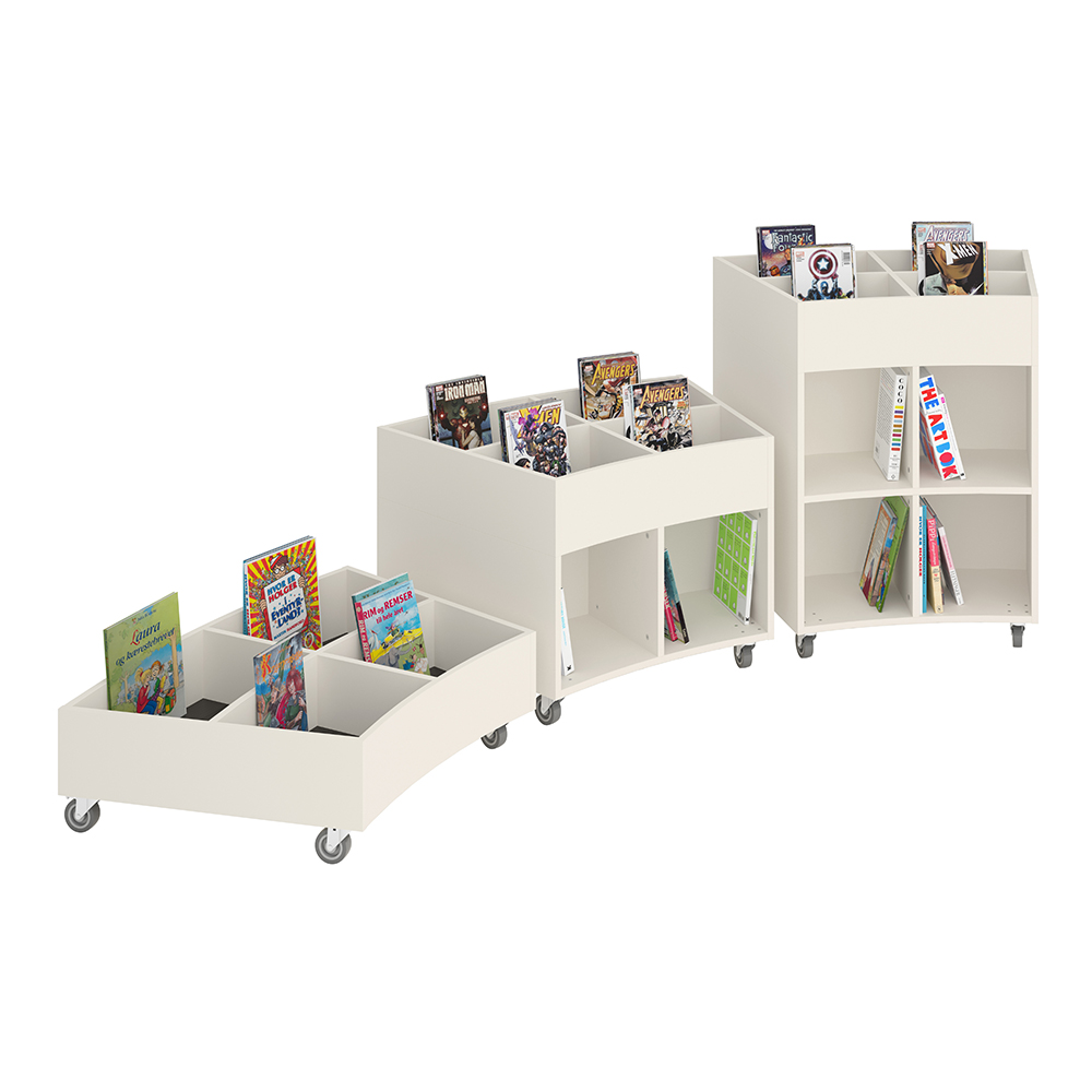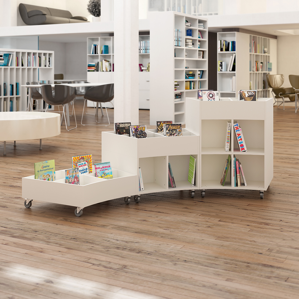 Sara Maxi is a book browser with four display compartments at the top and eight storage compartments underneath. Ideal for both children and adults.