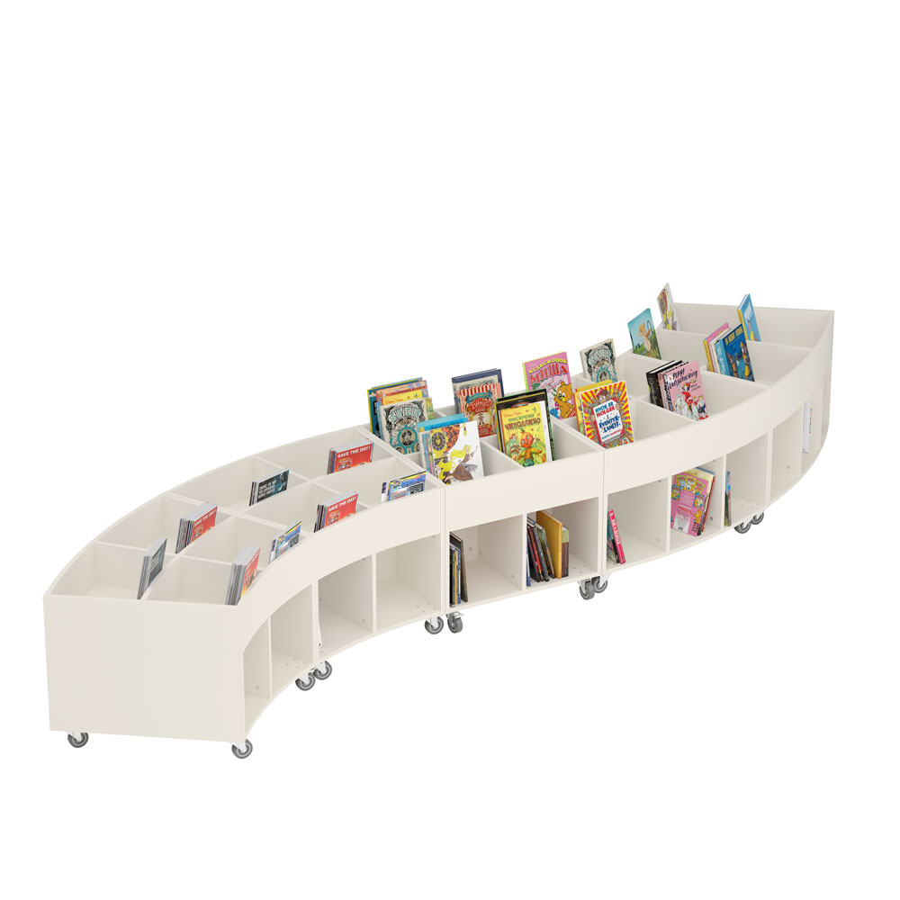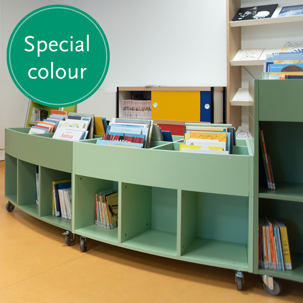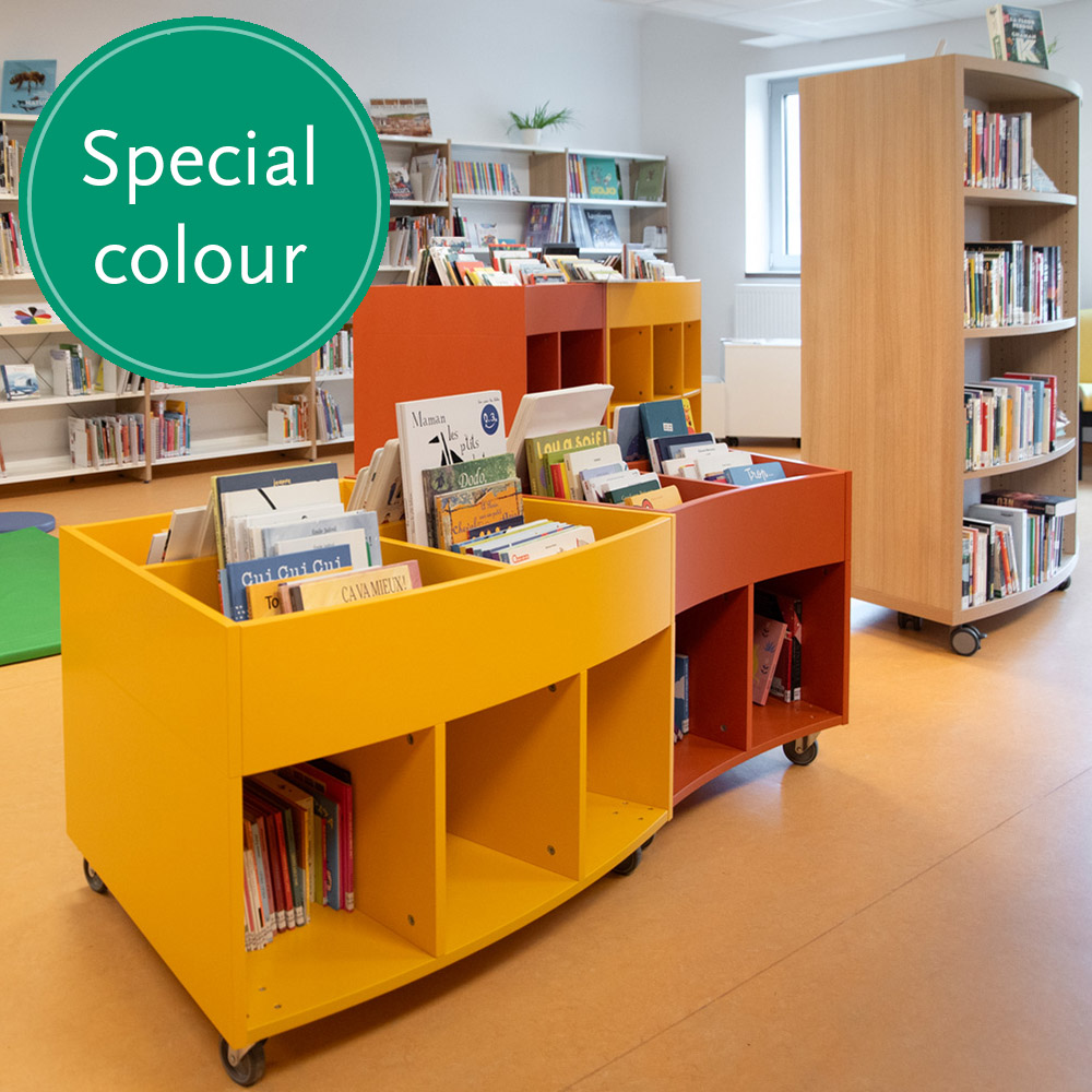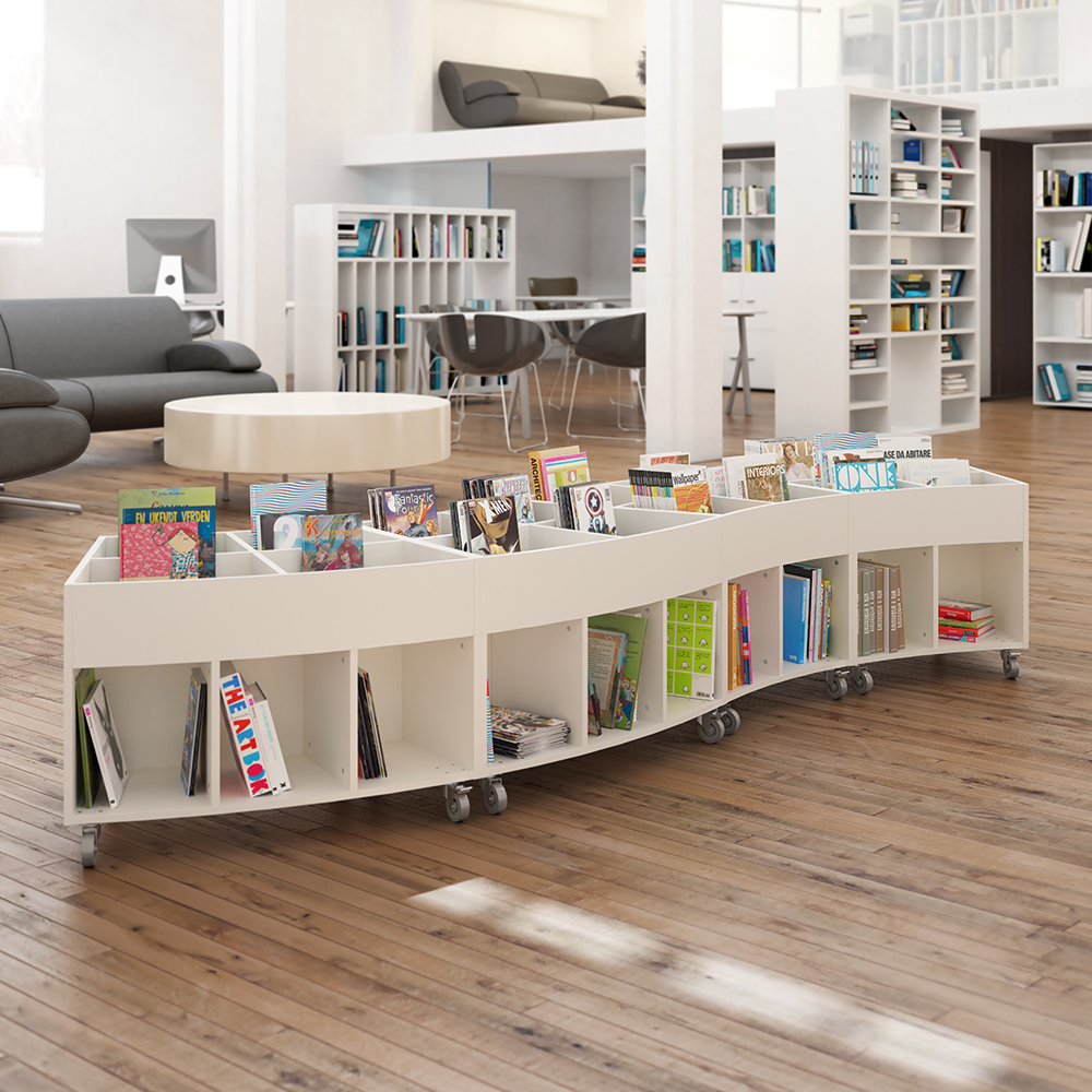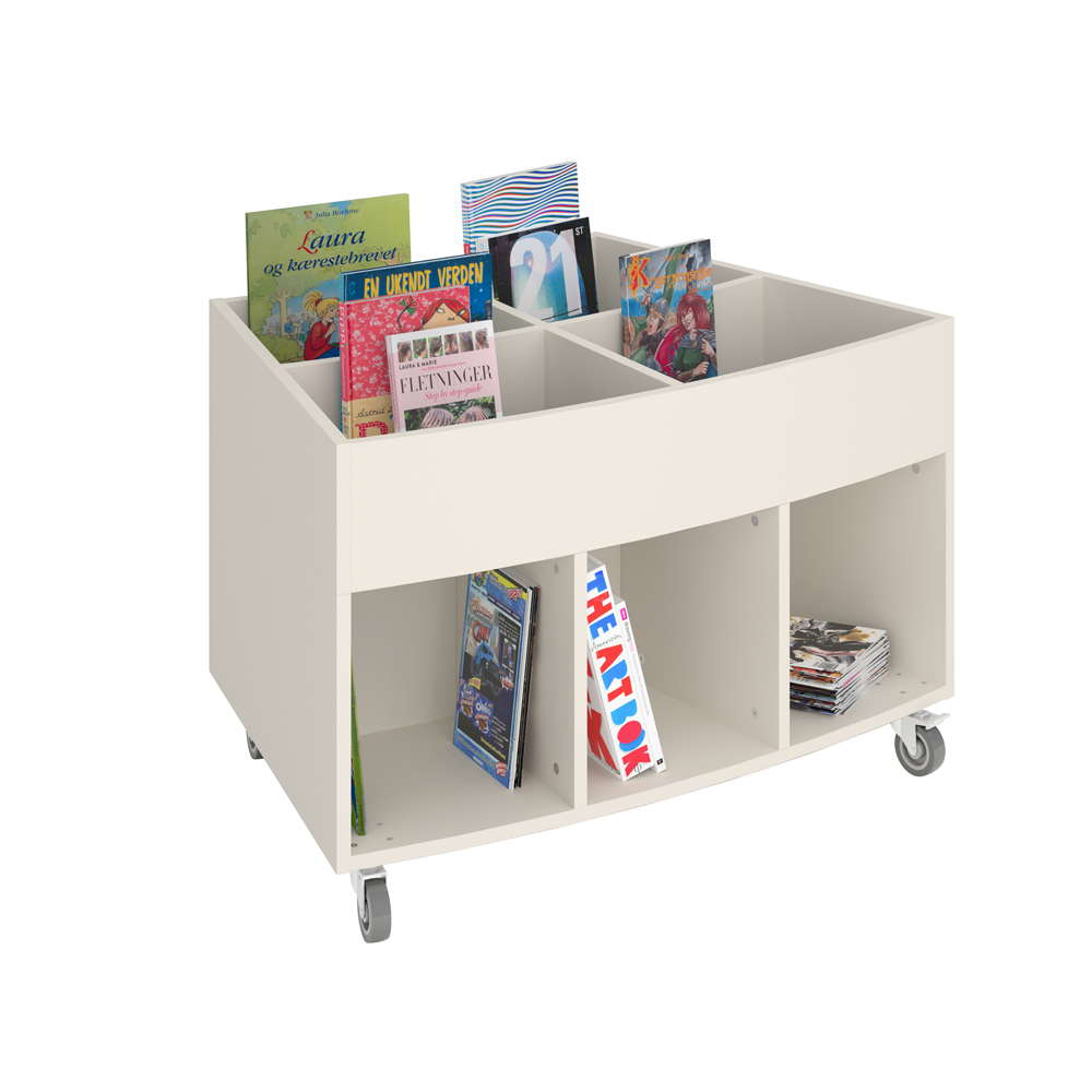 Sara Maxi is a book browser with four display compartments at the top and eight storage compartments underneath. Ideal for both children and adults.