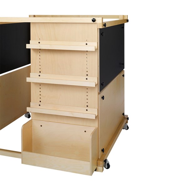 The shelves and compartments come in two different widths to fit the inside and outside of the rear wall element.