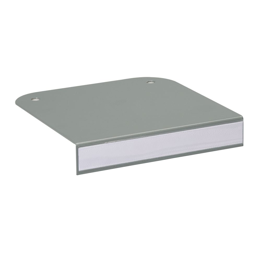 Steel sign with clear anti-reflective plastic label holder and white label.