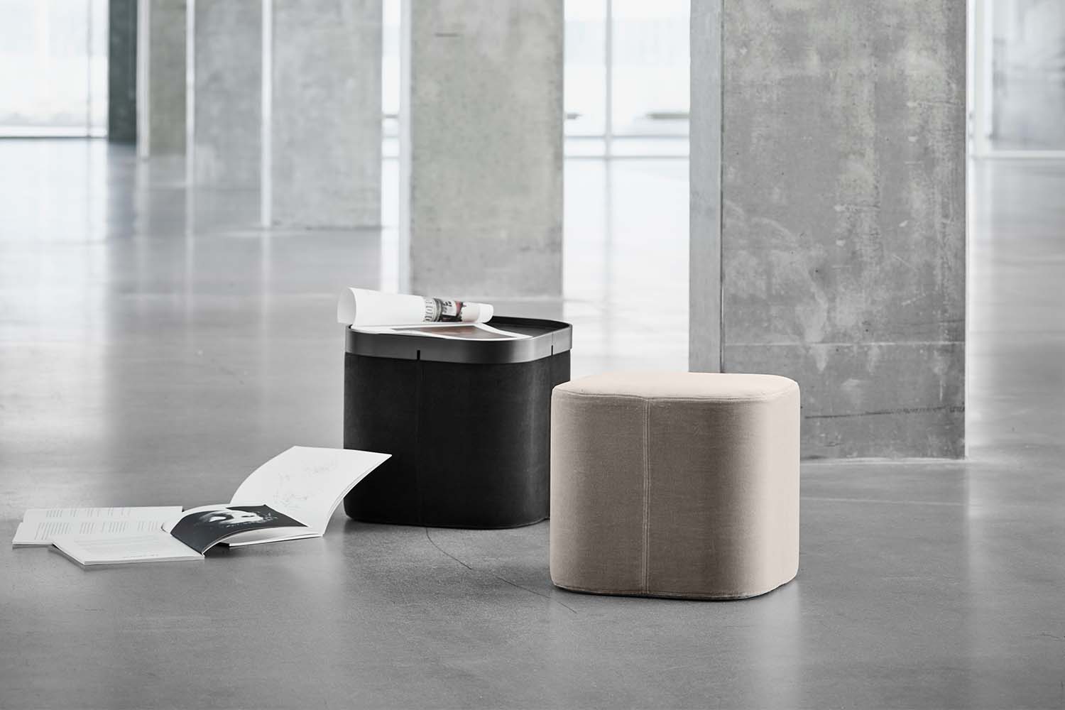The design is easy and timeless with rounded corners and staggered seams. The pouf can be used as seating or as a little table with a special made tray as optional accessory. The tray can be placed safely on top of the pouf and follow the stitching in the upholstery naturally with its rounded corners and carvings.