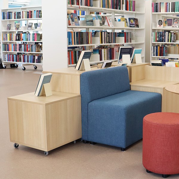All-round, dyed, stackable acrylic stand for presentation of books and AV-media.