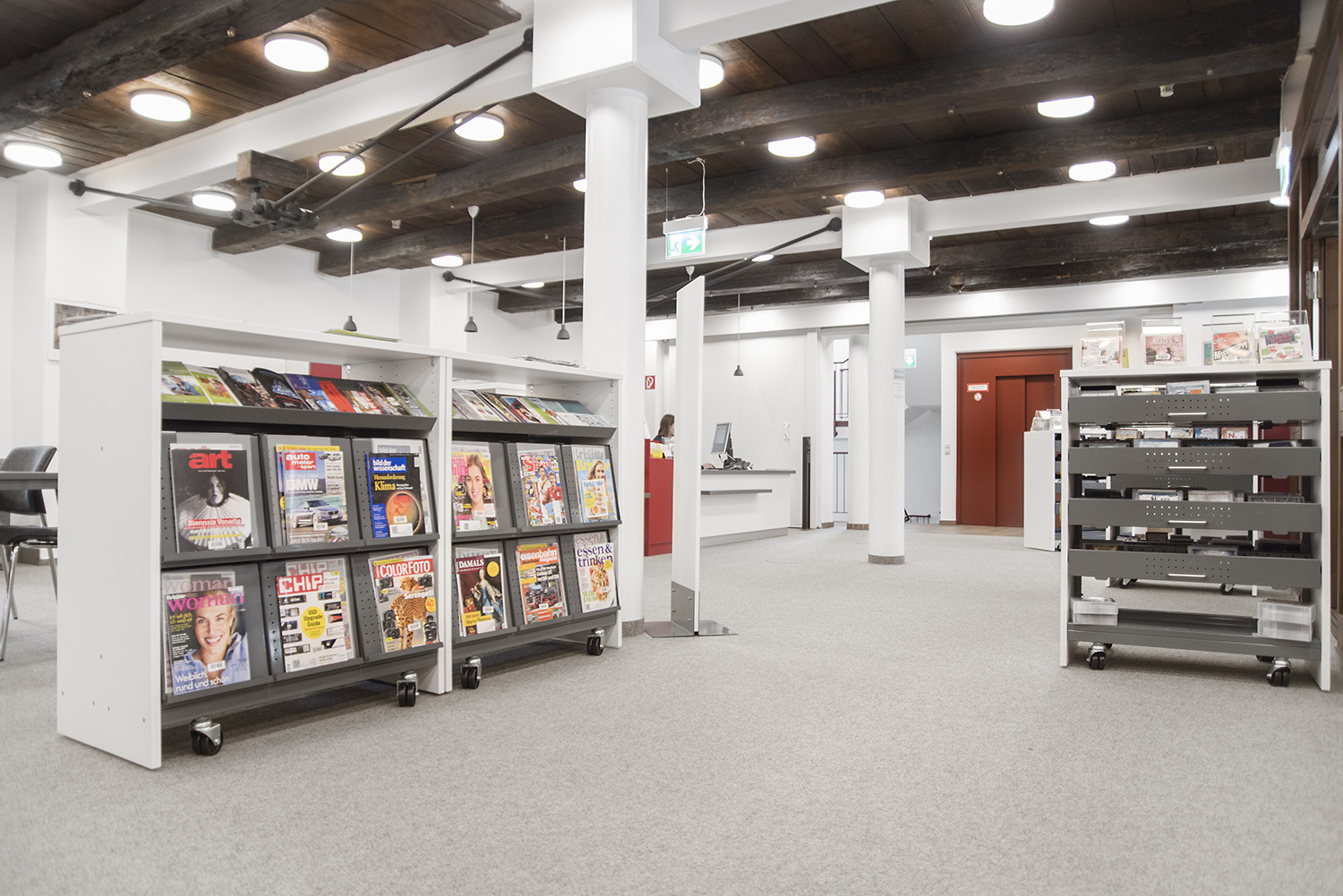 Current magazines and periodicals are stored in a compartment behind the flap (lift and insert). The displayed magazine is kept in place by a transparent sheet over the flap. Easy to replace.